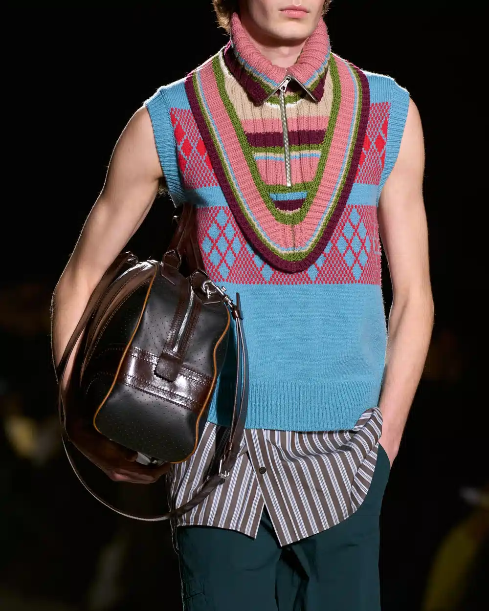 特にニットは、フェアアイル柄、アーガイル、ストライプ、ケーブル編み、刺繍などが、服全体に、あるいはディテールや部分使いとして至る所に存在し、手仕事の温もりを伝える。プリントで特徴的なのは、ポラロイド写真からプリントされたという「ぼやけた花柄」。鮮明なデジタルプリントではなく、記憶の中で淡く滲んだような花柄が全体に広がり、ノスタルジックなムードを醸成していた。カラーパレットは、落ち着いたトーンとポップな色彩の対比で構成され、ブルー、グレー、そしてニュートラルカラーといった色調をベースに「Fruittella(ソフトキャンディ)」を思わせるパステルカラーがアクセントとして加わった。この甘く淡い色彩が、厳格なユニフォームや重厚な素材の中に、若々しさと遊び心を彩りとして添えている。