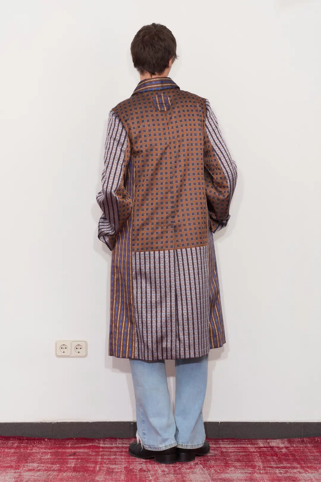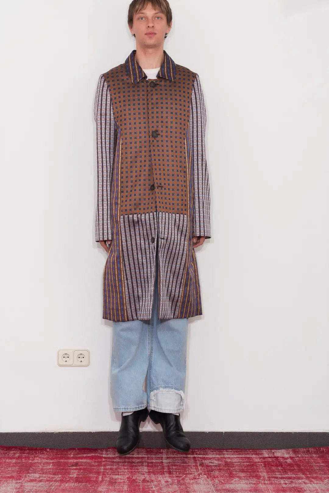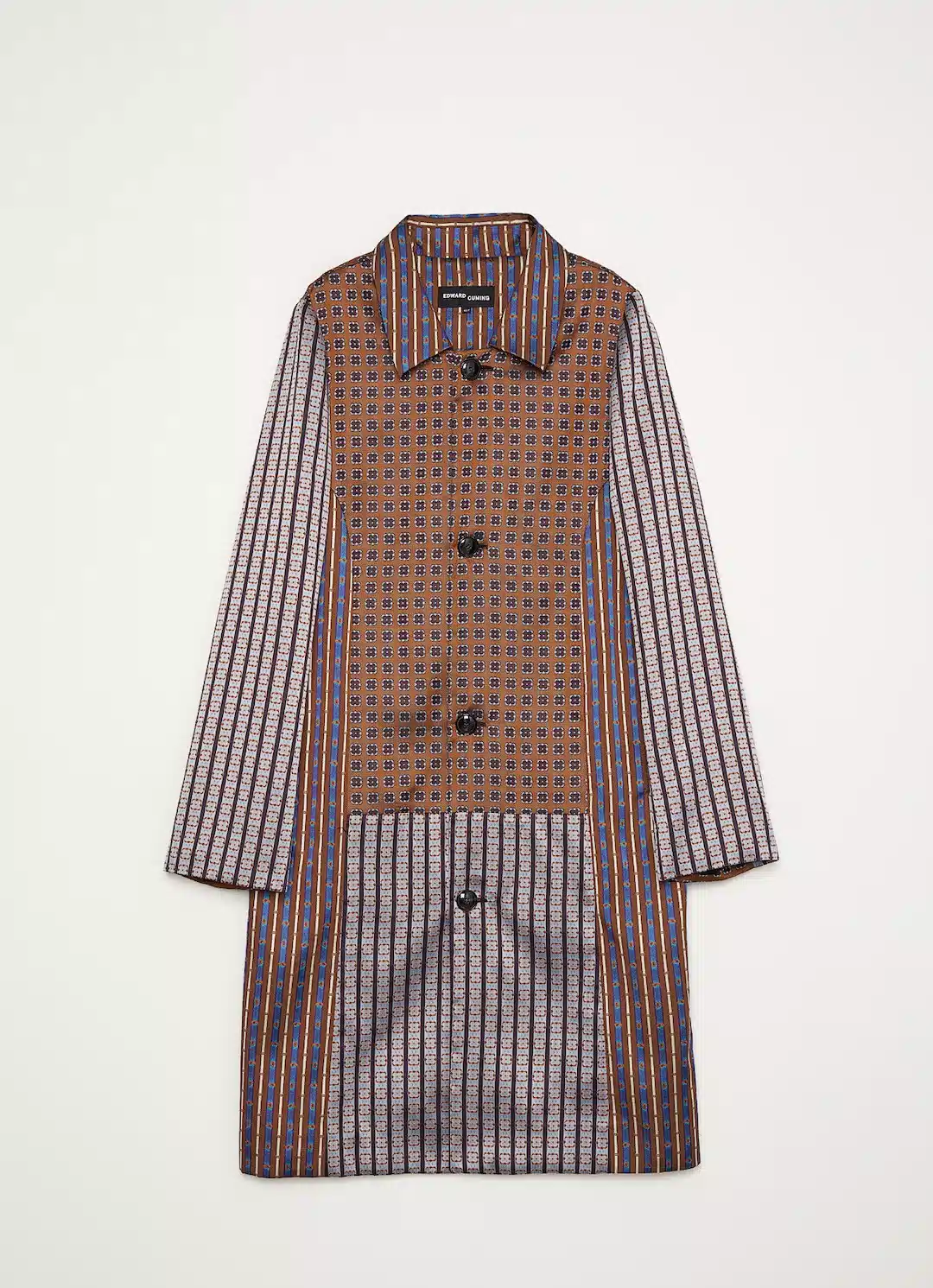 ネクタイやポケットチーフに使われるデッドストックのジャカード生地をパネル状に組み合わせたカーコート。袖裏にはライニングを施し、全体にはバイアステープで丁寧に仕上げられている。独創的な素材使いと構築的なシルエットが魅力の一着。