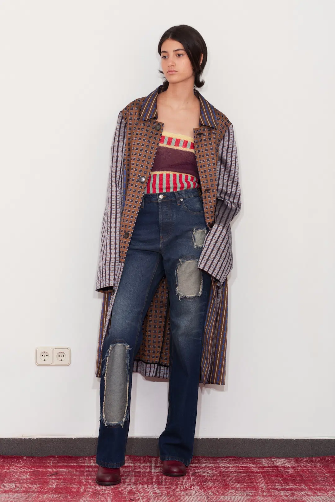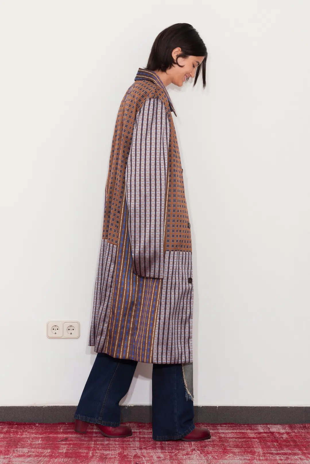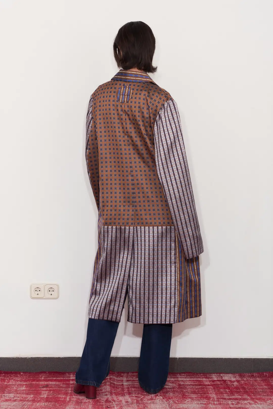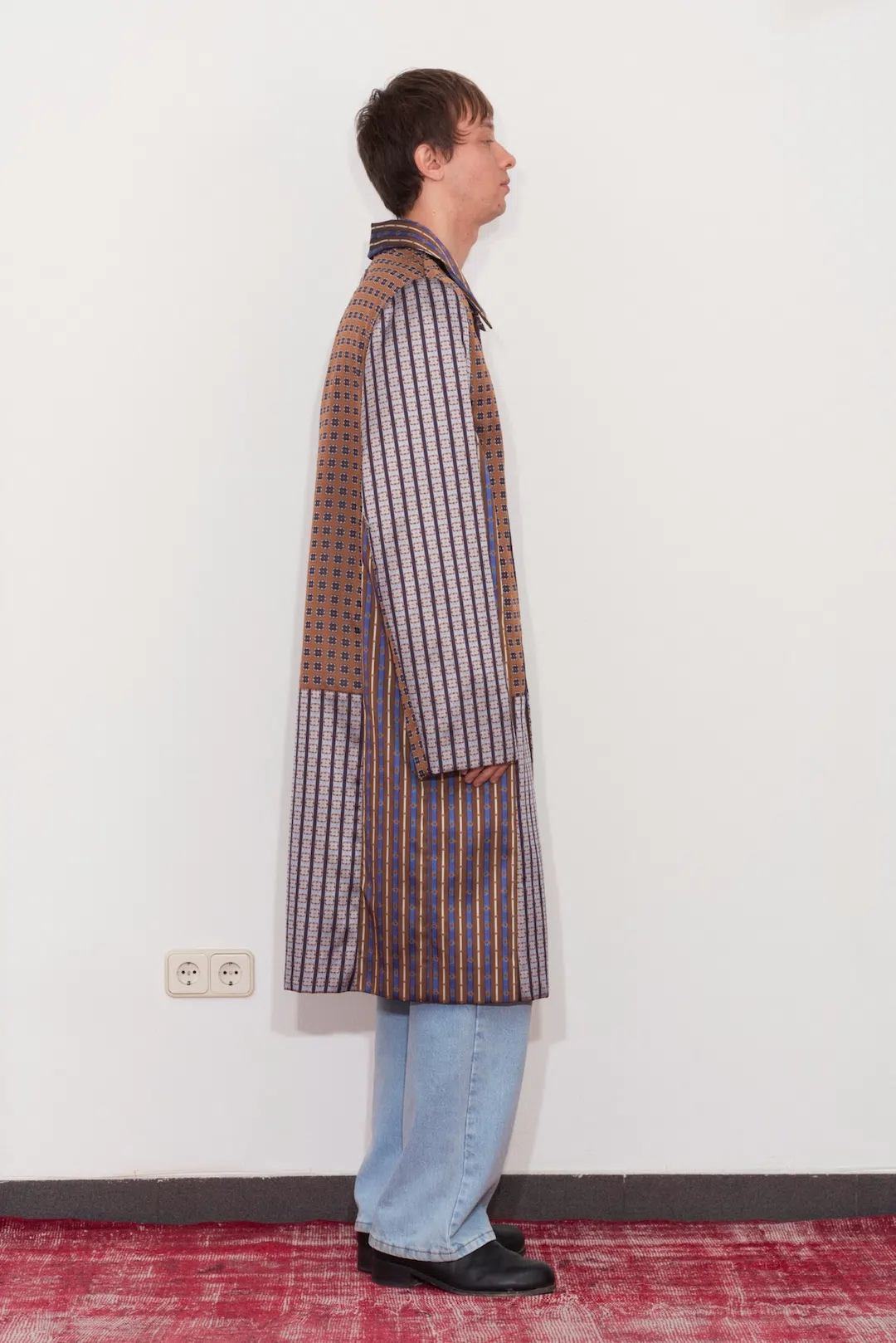 ネクタイやポケットチーフに使われるデッドストックのジャカード生地をパネル状に組み合わせたカーコート。袖裏にはライニングを施し、全体にはバイアステープで丁寧に仕上げられている。独創的な素材使いと構築的なシルエットが魅力の一着。