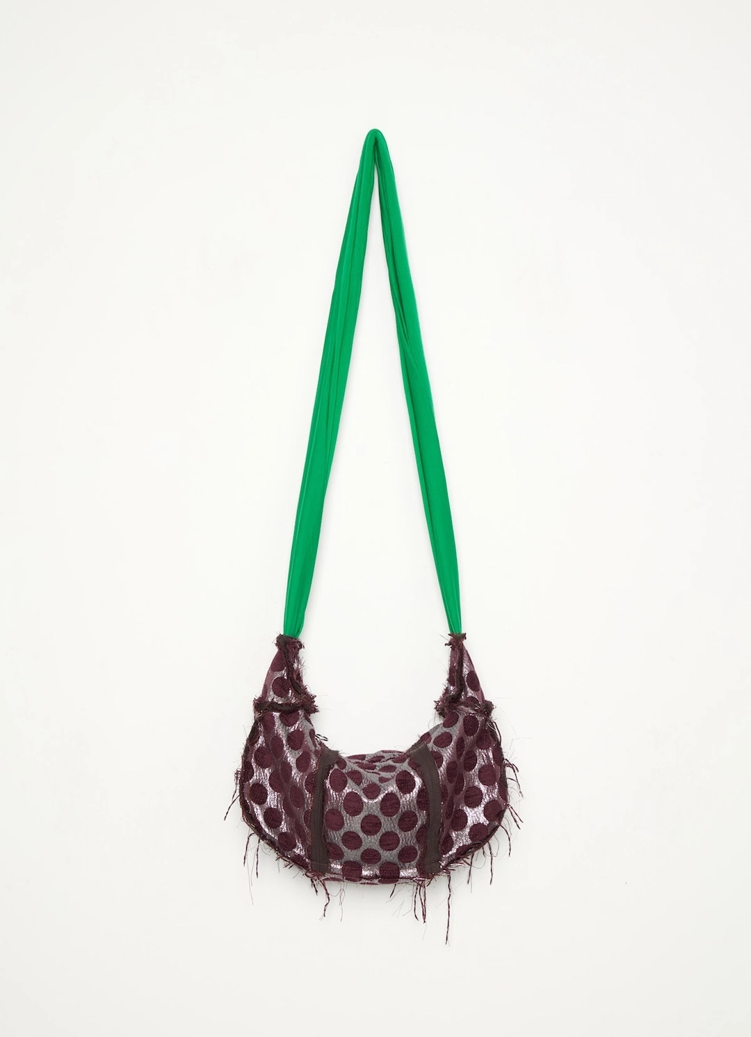 祝祭感のあるジャカード生地と、ヘビーなグリーンジャージーをライニングに使用したクロスボディバッグ。ジャージー素材のストラップは、長さ調節が可能で自分好みの長さに結んで楽しむことができる。公式オンライン限定、数量限定アイテム。