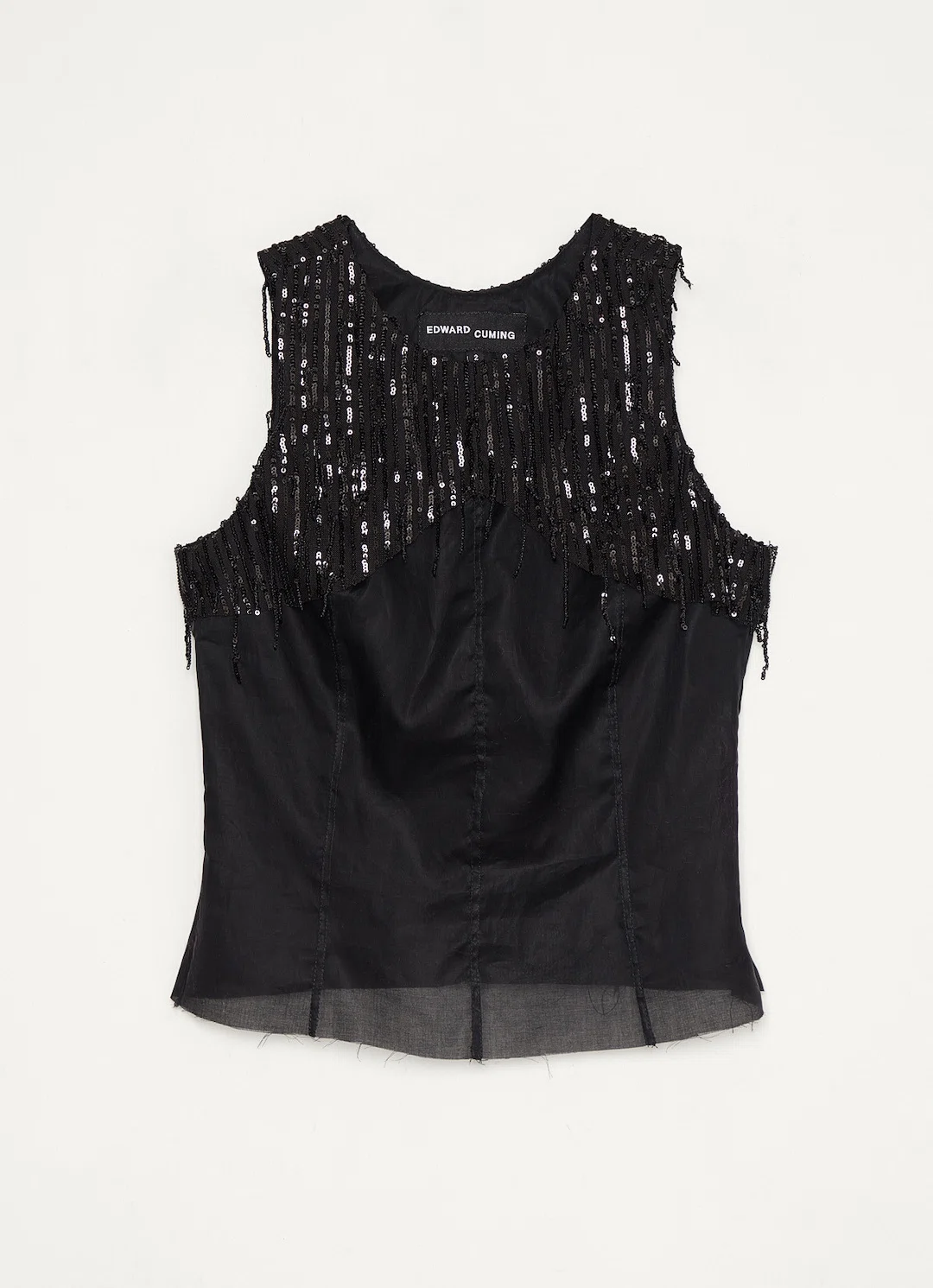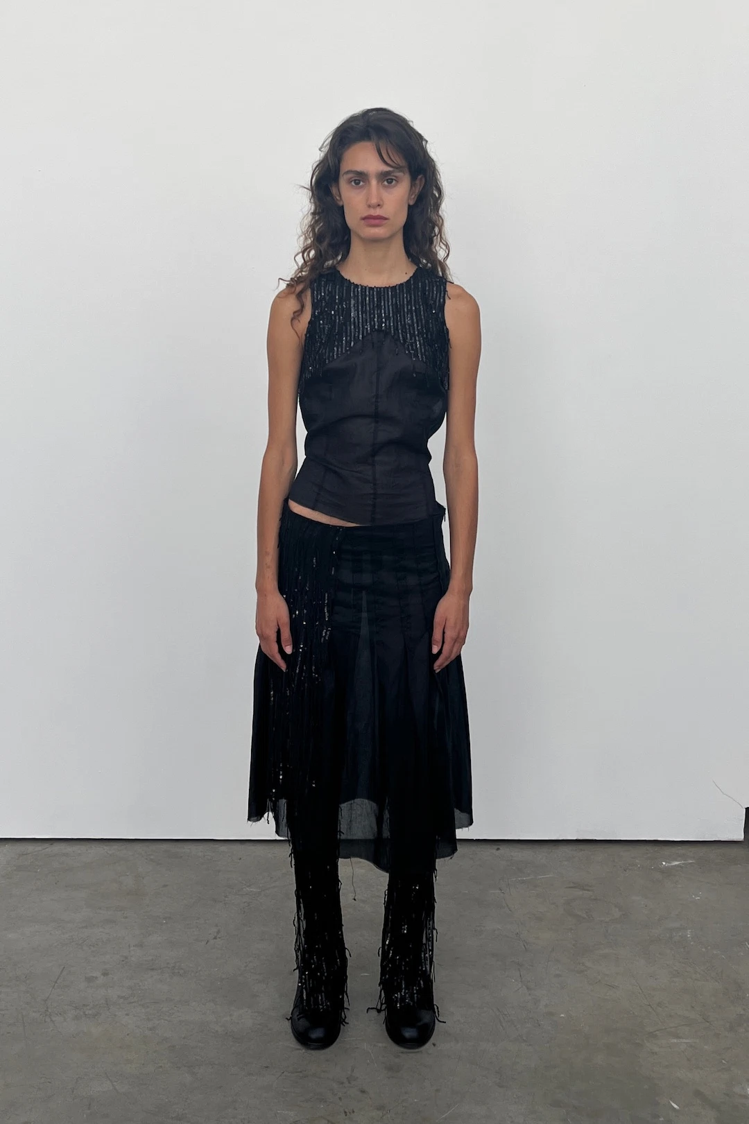 コットンオーガンザを使用した透け感のあるトップ。繊細なスパンコールのパネルが施され、インビジブルファスナーですっきりと仕上げられたモードな一着はスタイルに奥行きを与える。