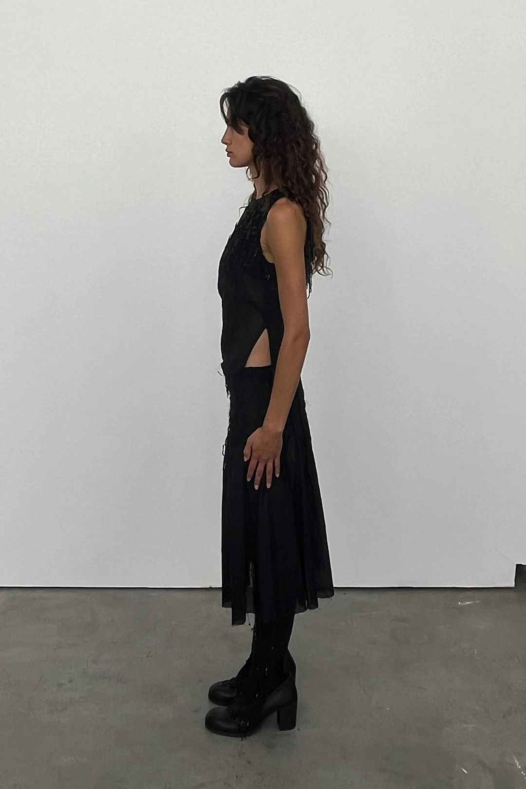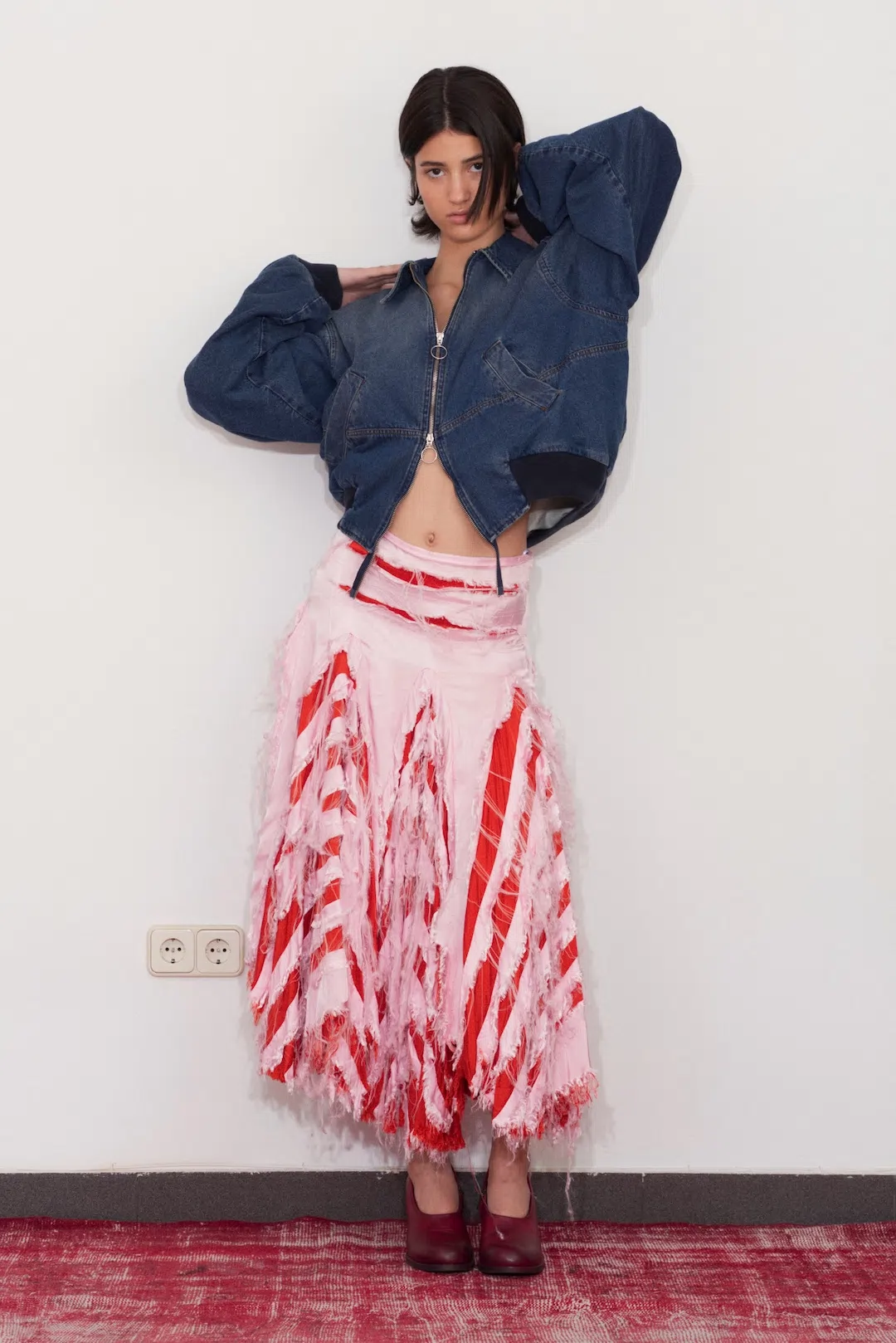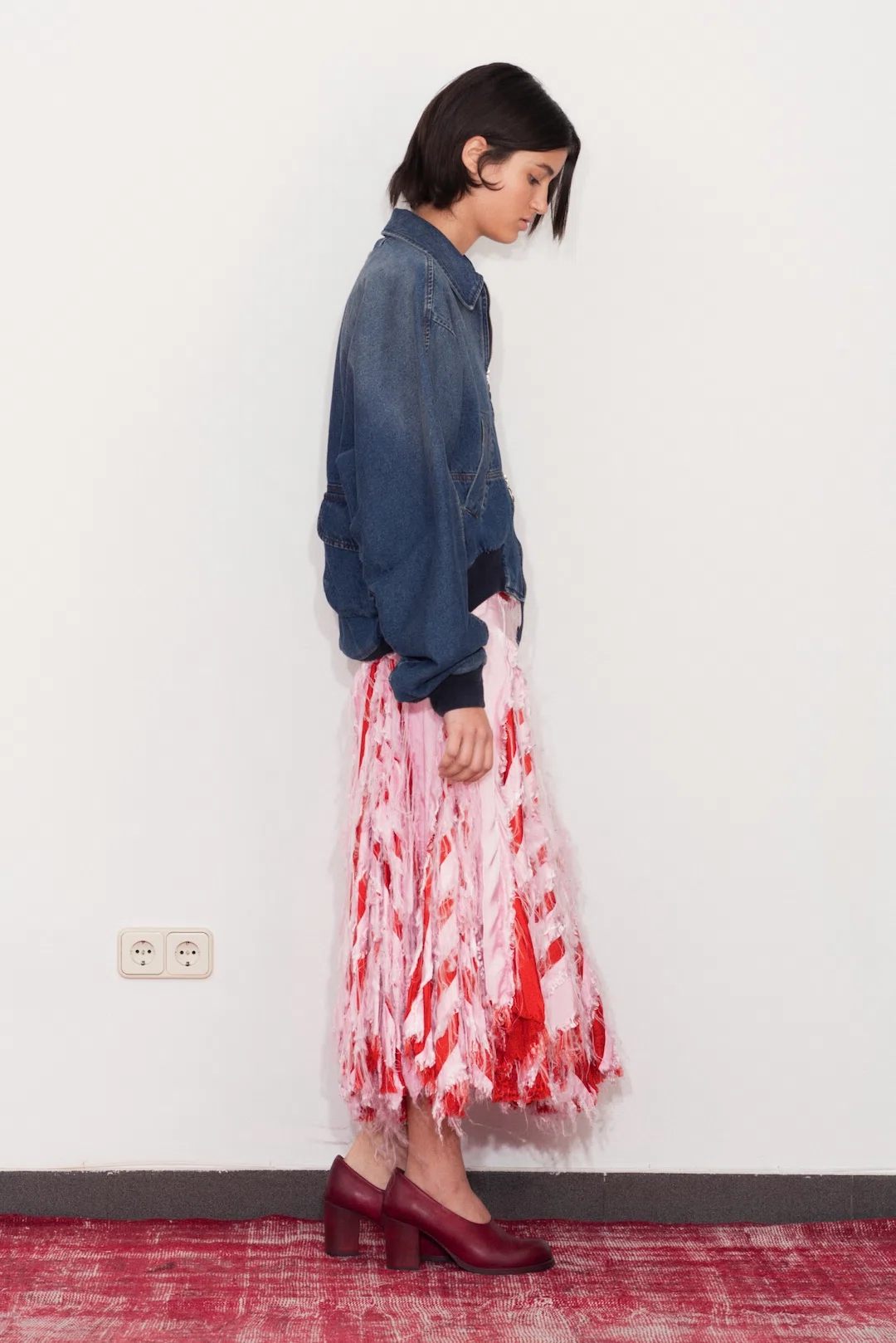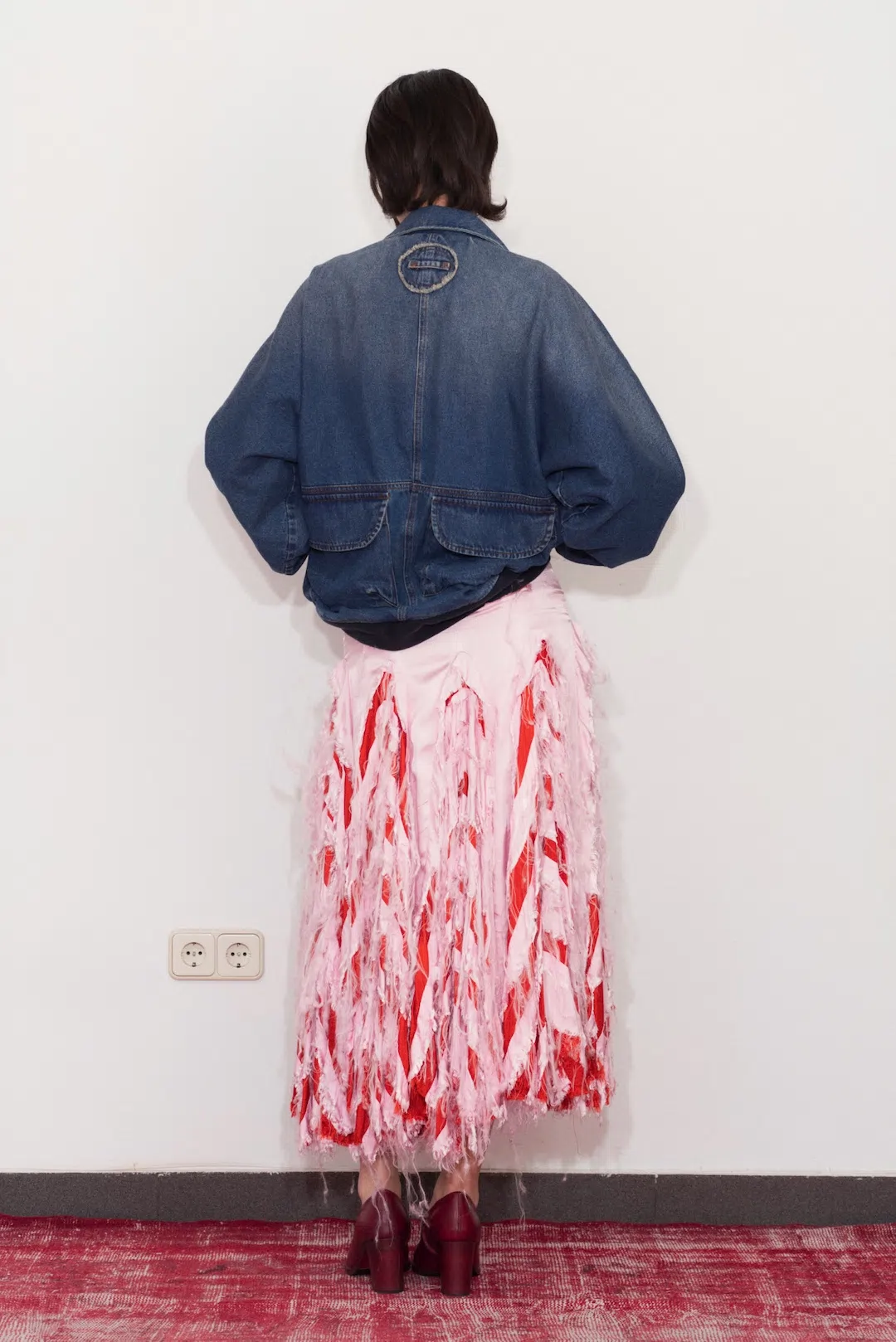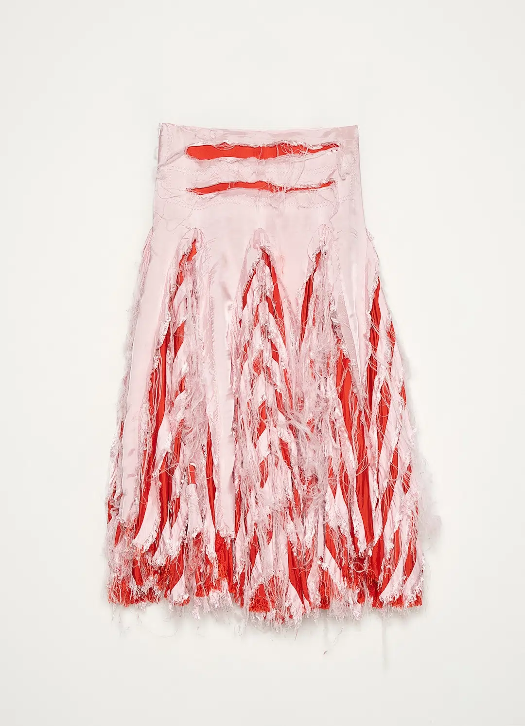 ゴデットシルエットで動きのあるデザインが特徴のスカート。おへその位置でフィットし、ブランドのシグネチャーである“スクラッチ・ジ・イッチ”テクニックによって、ヴィスコース生地を切り裂き、洗いをかけて大胆にフレイ加工を施している。ドラマティックな存在感を放つ一着。