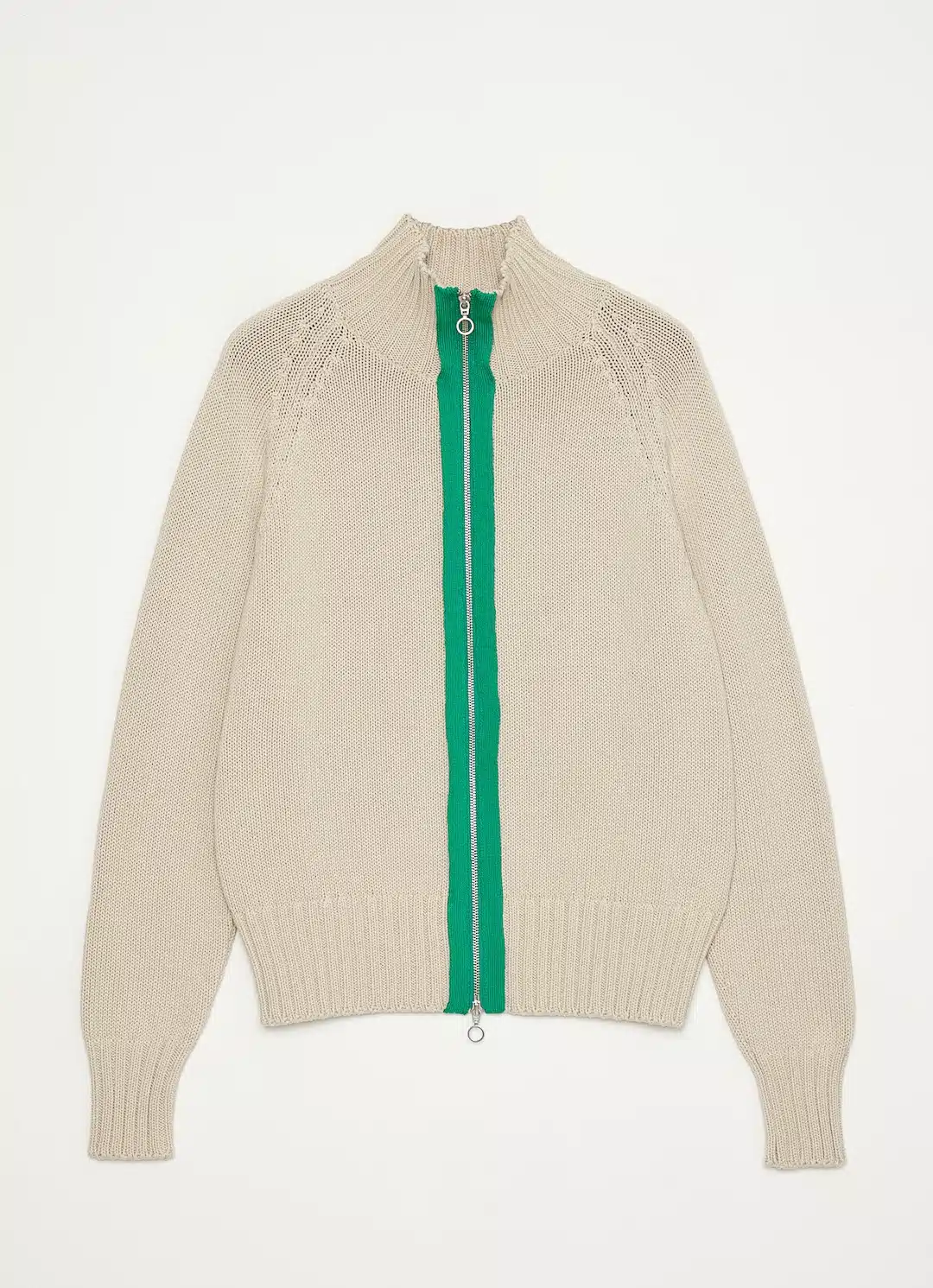 インターシャ編みで仕立てたトラックジャケット。前面にはコントラストテープとダブルジップを採用し、背面には象徴的なサークルインターシャが施されている。カジュアルでありながらエッジの効いた一着。