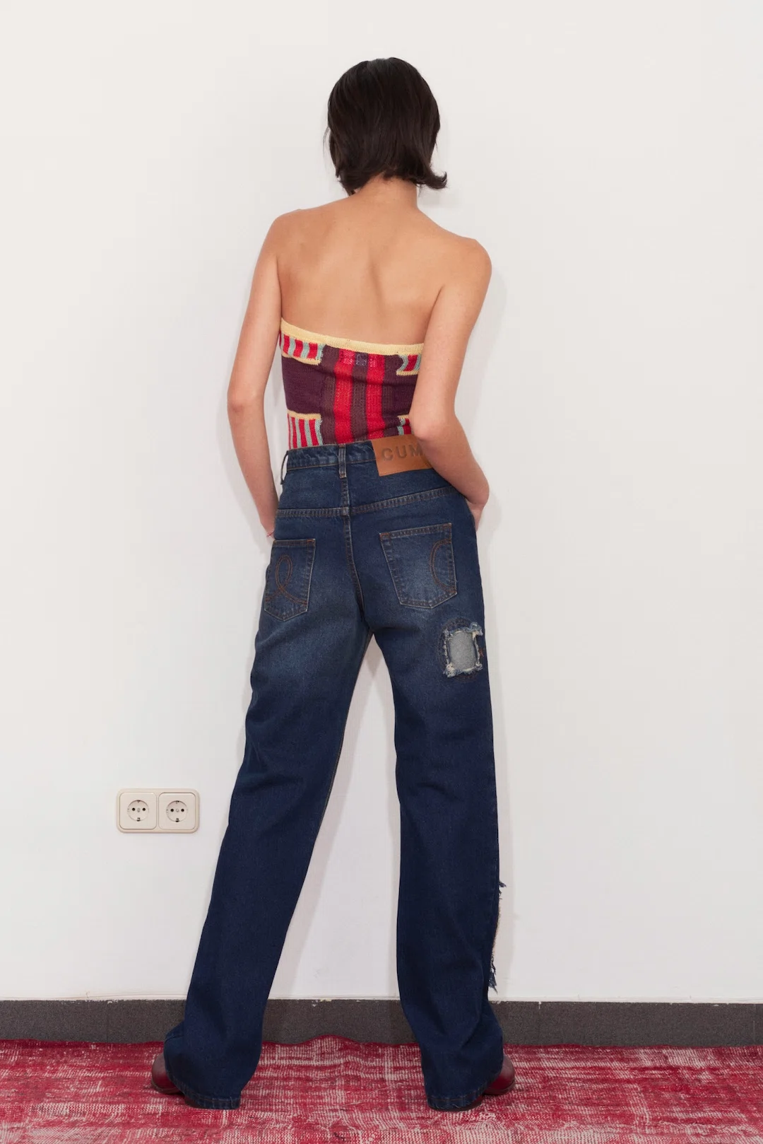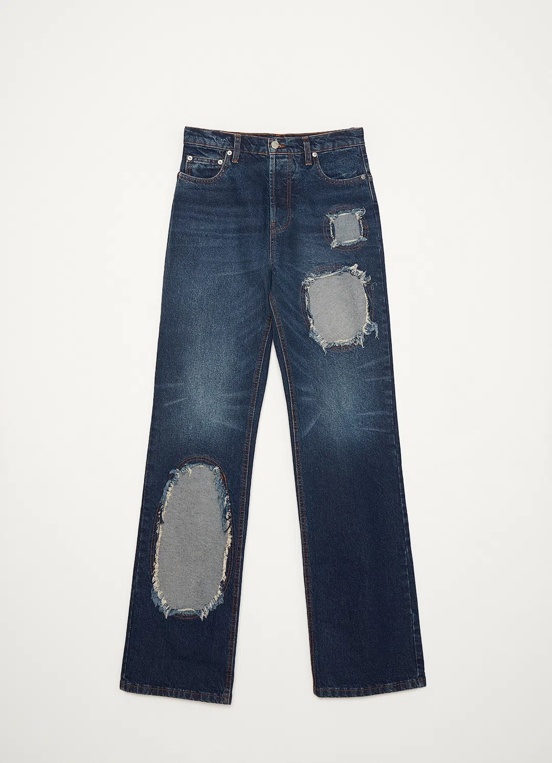 ハイウエストのストレートフィットジーンズ。前後の脚部分に大胆なカットアウトを多数施し、立体感のあるシルエットを演出。ウエスト背面には“CUM”のレザーパッチ付き。女性らしいラインと実験的なデザインを兼ね備えた一本。