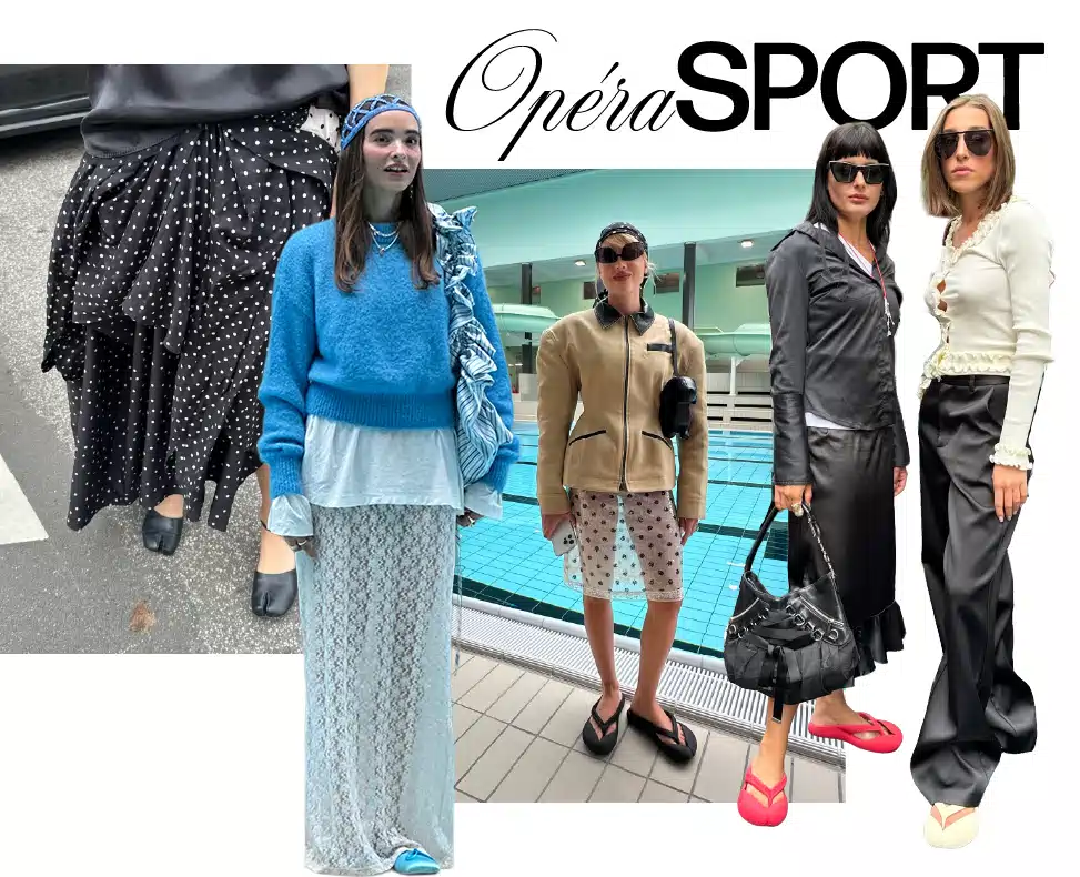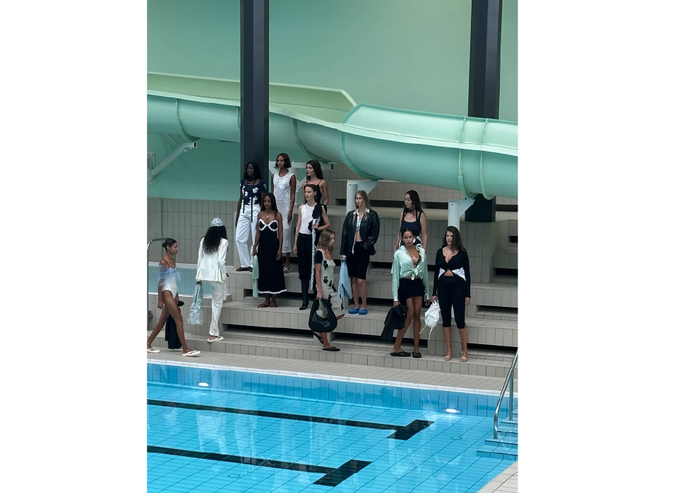 今回の2026年春夏コレクションは、デザイナーたちのソウル滞在から得たインスピレーションをもとに展開。韓国の国花・ハイビスカスをモチーフにしたオリジナルプリントを中心に、<OpéraSPORT>らしいミニマルさと洗練されたノスタルジアが漂うコレクションでした。ショー会場に選ばれたプールは、滞在中のホテルから日々眺めていた景色が着想源と聞き、より一層心を掴まれました。