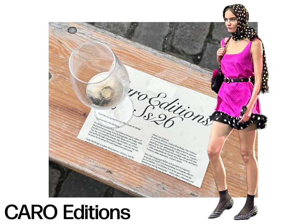 その後は、歩いて10分ほどの場所にある<CARO Editions(キャロ エディションズ)>のショップへ。前日にショーを見たばかりだったので、お店を見つけた瞬間は思わずテンションが上がりました! ショーは、コペンハーゲンの橋の下というユニークな場所で開催され、着席と同時に振る舞われたグラスワインが祝祭的なムードを高めていました。明るく色鮮やかなテキスタイルが織りなすランウェイは純粋なファッションへの愛情とエネルギーを感じさせ、テーマであるウエディングを想起させる華やかなスタイリングはどれもパワーに満ちていました。