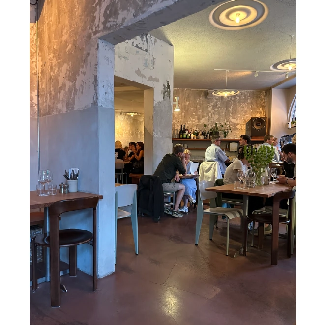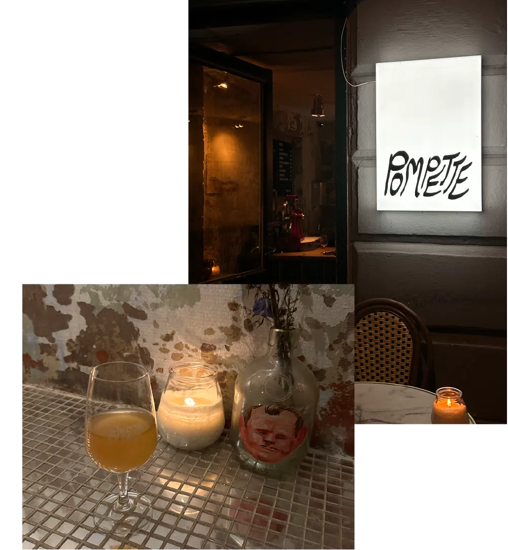 2件目は、近くにあったワインバー「Pompette(ポムペット)」へ。ナチュラルワインが豊富に揃い、ロゴデザインやコンクリートを基調とした内装からもセンスの良さが感じられる空間。ローカルな雰囲気に包まれながら飲むワインは、最高の一杯でした!