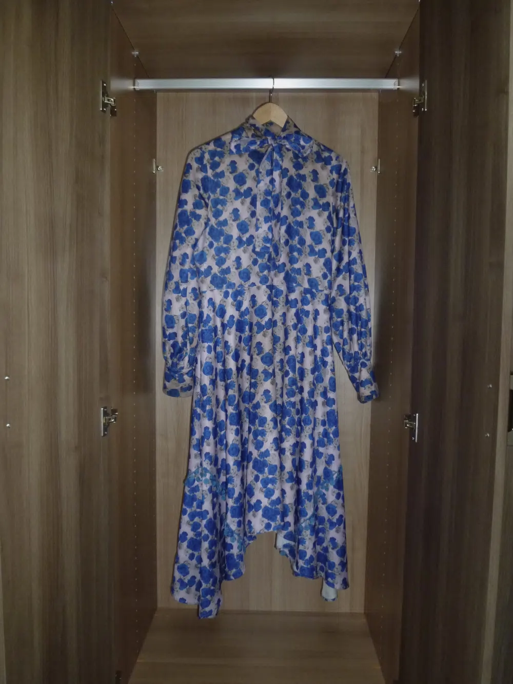 「6年程前、PALETTE art aliveに入社する前にショップで一目惚れ。このドレスをきっかけにブランドに興味を持つようになりました。鮮やかな青い薔薇と首元のボウタイがお気に入りです。ランウェイショーで小松菜奈さんが着用していたのも印象に残っています。」