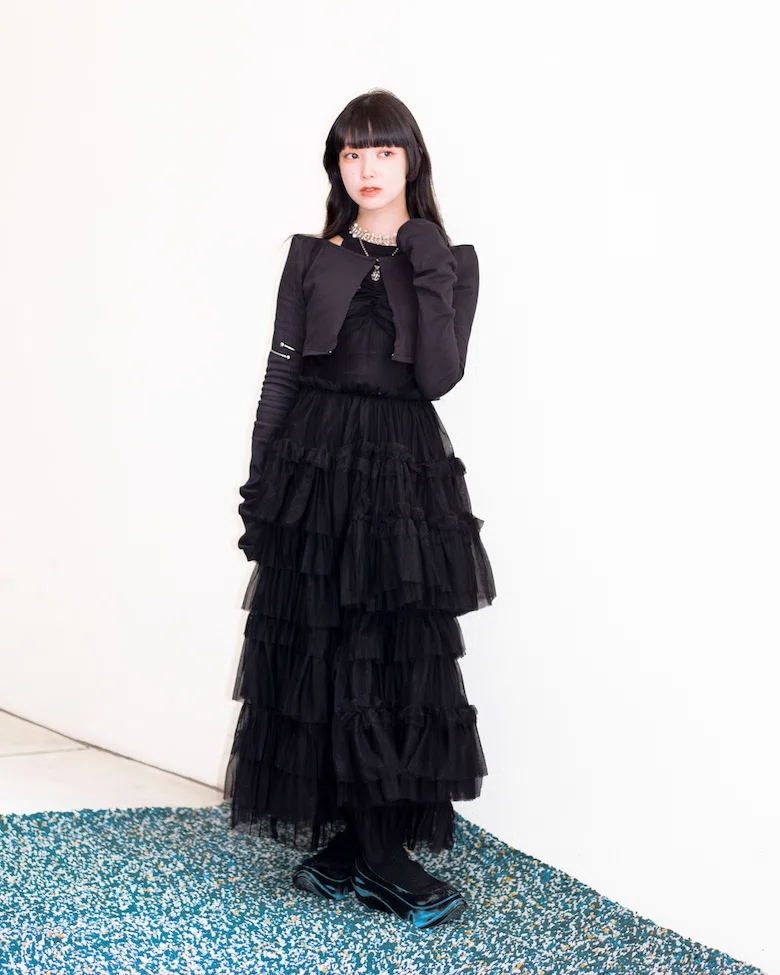 「JURK のオンラインショップで購入。チュールアイテムにハマっていた時に見つけて、カジュアルなパーカーとの合わせがいい抜け感です。普段から黒いアイテムばかりなので1番派手な色味を選びました。」
