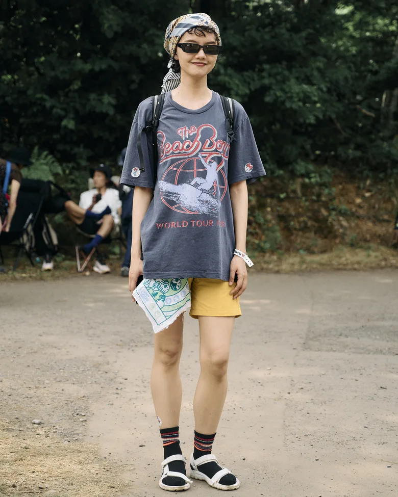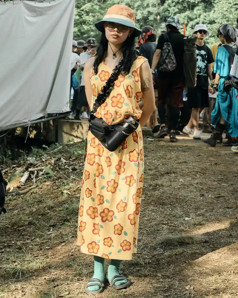 顔まわりには、帽子やスカーフを取り入れたアレンジが見られ、個性を際立たせていた。また、柄ワンピースを取り入れたスタイルは、アウトドア要素が多い中でコントラストとして印象に残った。