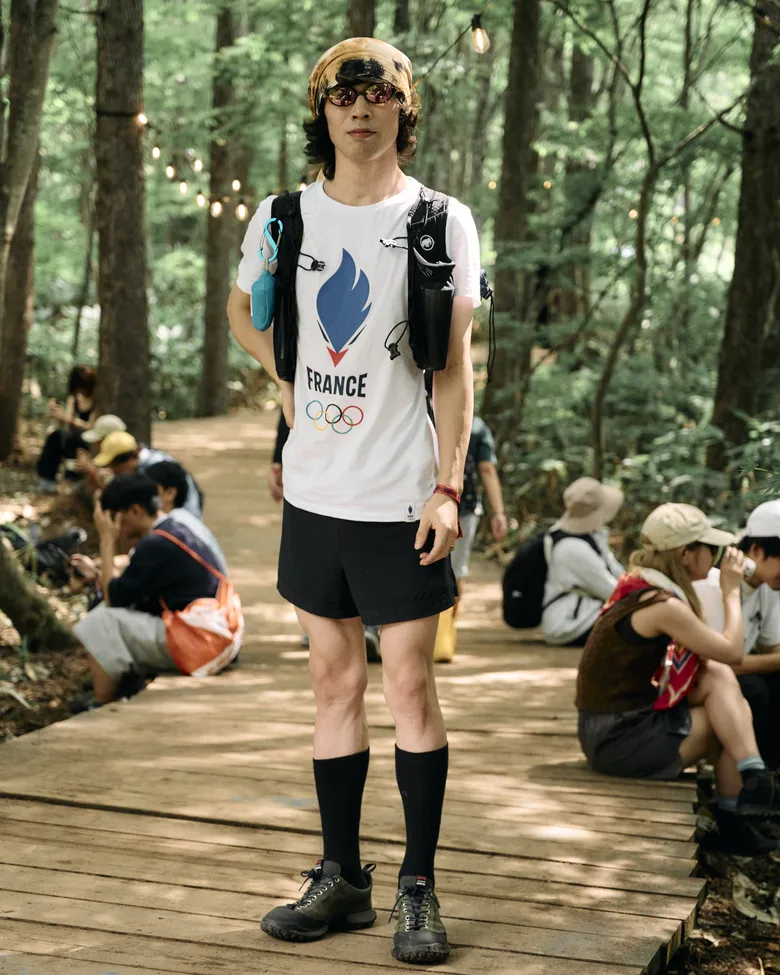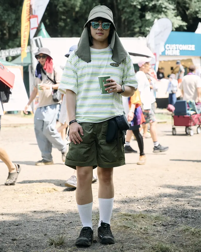 近年に引き続き、フォットボールユニフォームを取り入れたスタイルも多く見られたが、今年はトレッキング要素を盛り込んだ装いが際立っていた。なかでも、ランニングベストを軸にした機能性とモード感を両立させたコーディネートが、一気に広がった印象だ。