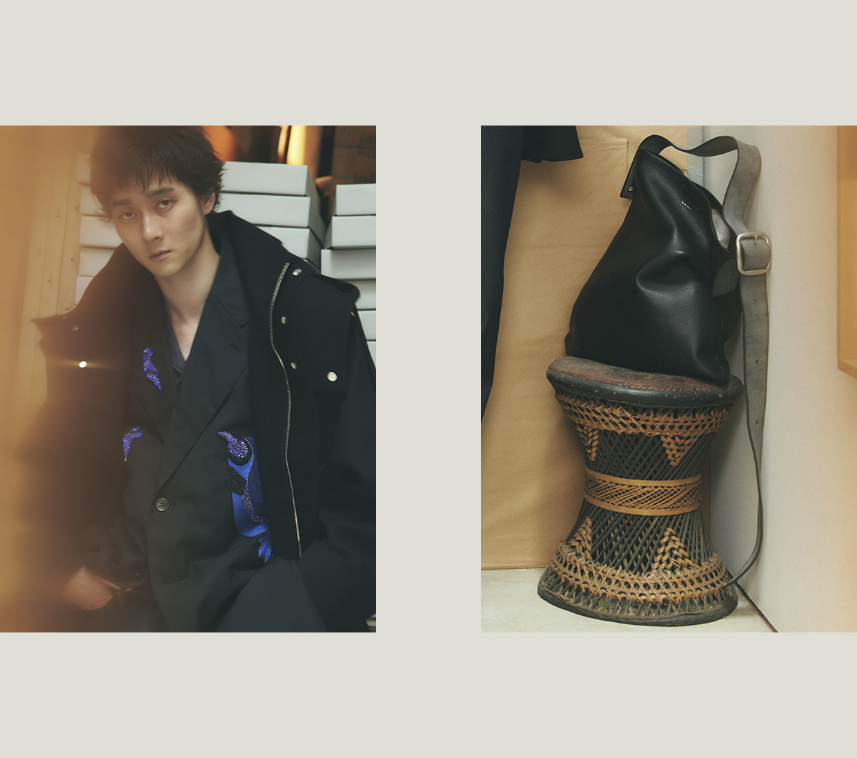 身頃と袖で素材を切り替えた強さを秘めるレザーアウターと煌めくストーンを散りばめた繊細さを宿すパンツ。相反するような主役級のアイテムが調和するのはどちらもクラフトのムードを漂わせるから。異なる魅力が引き合わされる、それこそがコーディネートの真髄。
