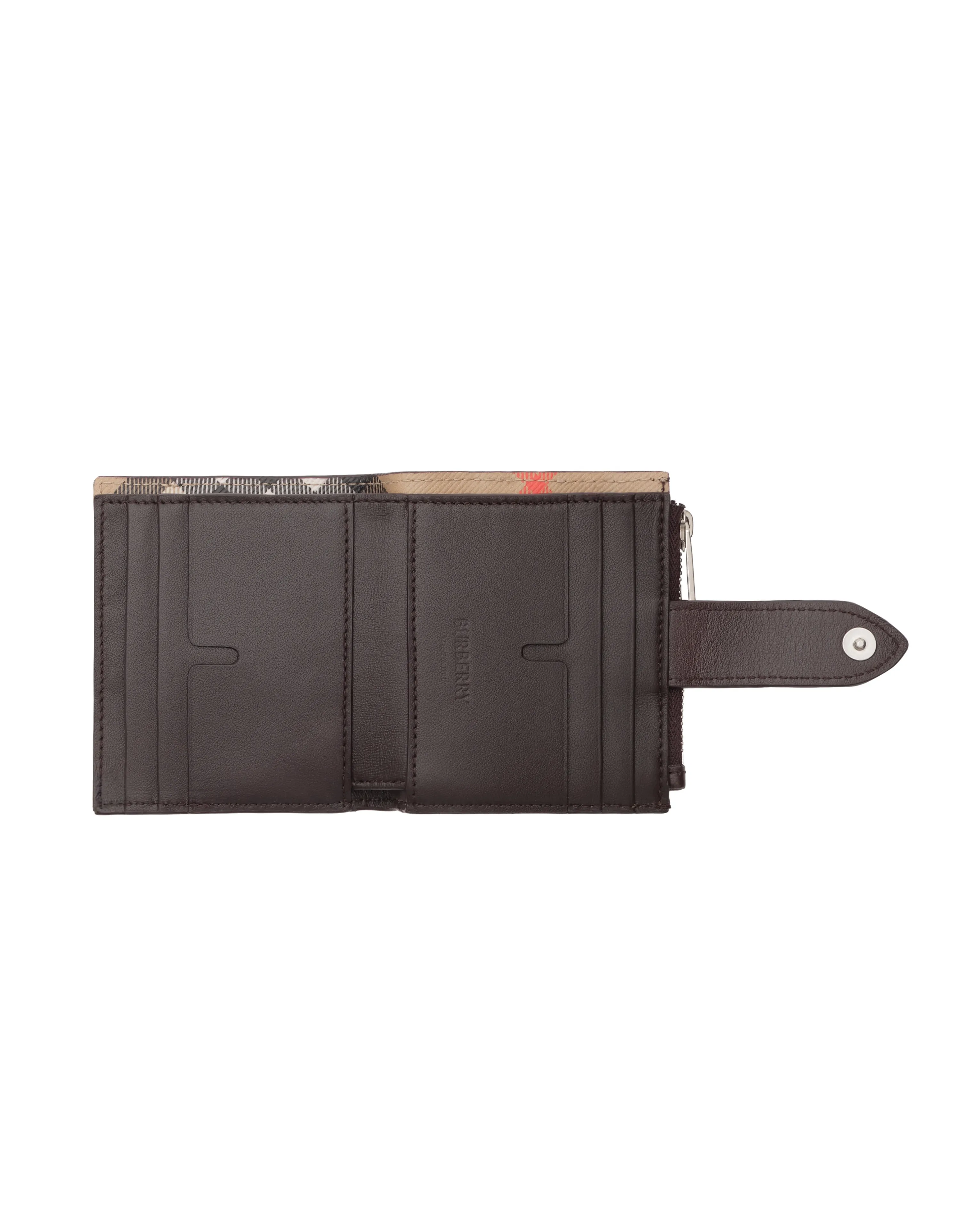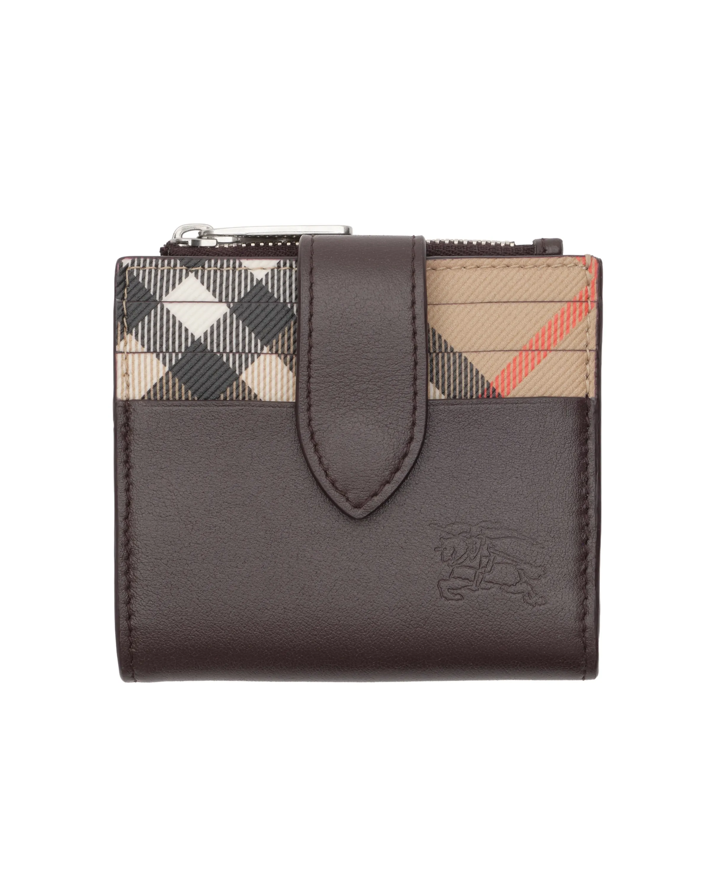 シグネチャーであるサンドベージュのバーバリーチェックをあしらった、新色のダークブラウンのカーフレザー製のジップウォレット。コンパクトなデザインに、内外に複数のカードスロットを備えエンボス加工の「馬上の騎士」デザインで仕上げたスタイル。