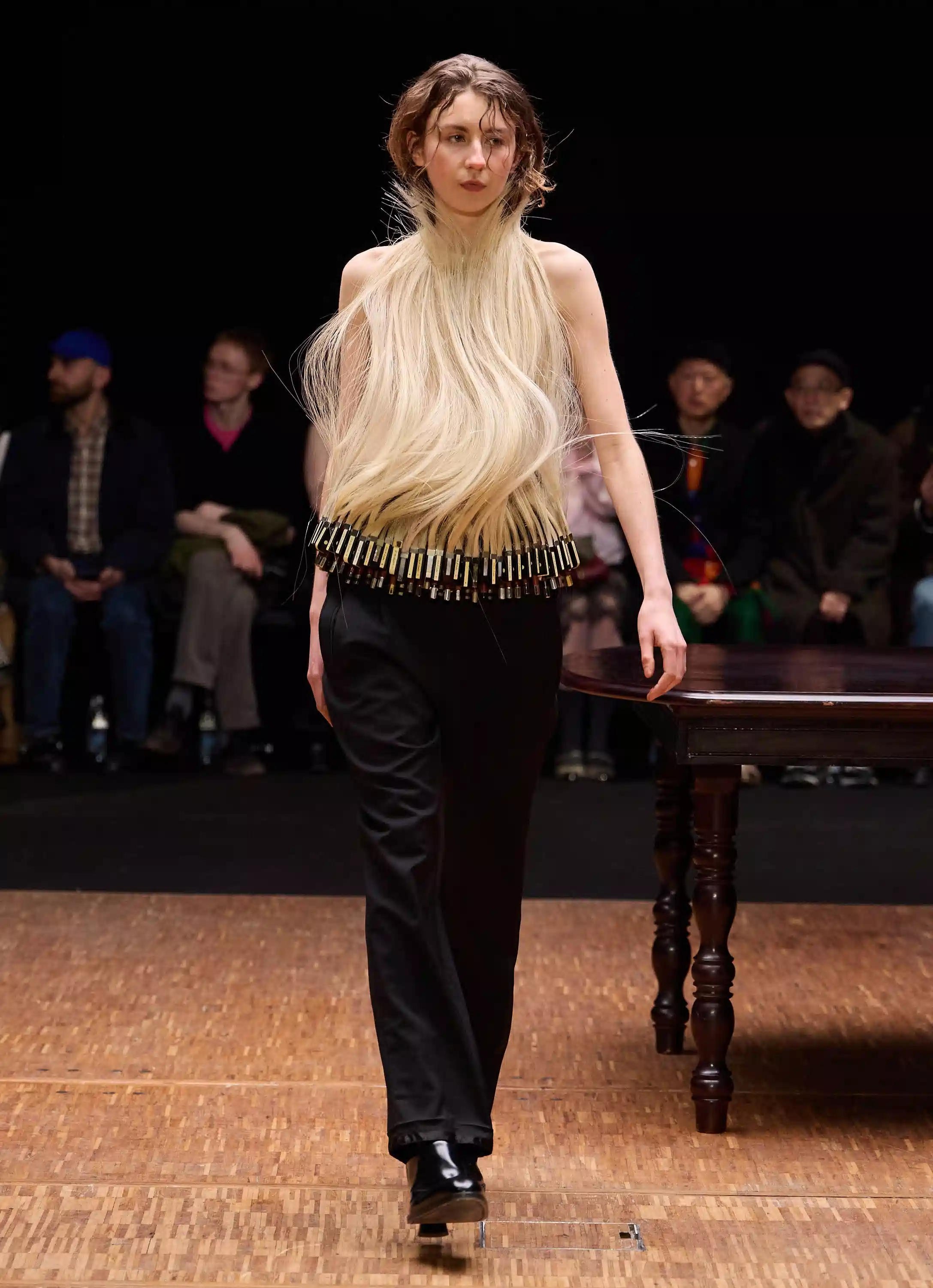 今シーズンの重要なモチーフとなったのが「ガラス」と「鏡」である。「Icelandic Glacial」とのコラボレーションにより誕生したガラス製のアクセサリーは、モデルが手にするウォーターボトルと共に、透明な輝きを放っていた。アイスランド氷河が掲げる『何も取らず、何も加えない』という哲学は、既存の素材をありのまま再定義し、虚飾を剥ぎ取って真実の自己を映し出そうとするホダコヴァのストイックなクリエイションと共鳴している。透明なガラスの表面は、中身を露呈させながらも物理的な隔たりを作る「保護バリア」として機能し、感情の露出と内面の防衛という矛盾した精神状態を表現していた。