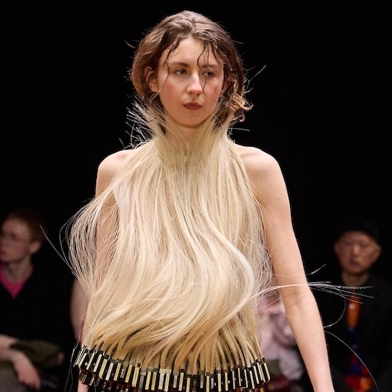 <HODAKOVA>2026年秋冬コレクションは、ファッションが単なる装飾ではなく、個人の「精神空間」の構築であることを証明した。構築されたレイヤーを一枚ずつ剥ぎ取った先に残る、真実の核心。厳格なテーラリングと未完成のパネル、冷ややかなガラスと温かなシープスキン、それらが織りなす「家」の中で、<HODAKOVA>は「自分自身であることの勇気」を静かに、しかし力強く肯定してみせた。LVMHプライズ受賞を経て、彼女のビジョンはよりグローバルに、そしてより深く内面へと向かっている。再生素材を扱うという環境的責任を、ここまで詩的で、心理的な物語へと昇華できるデザイナーは他にいないだろう。