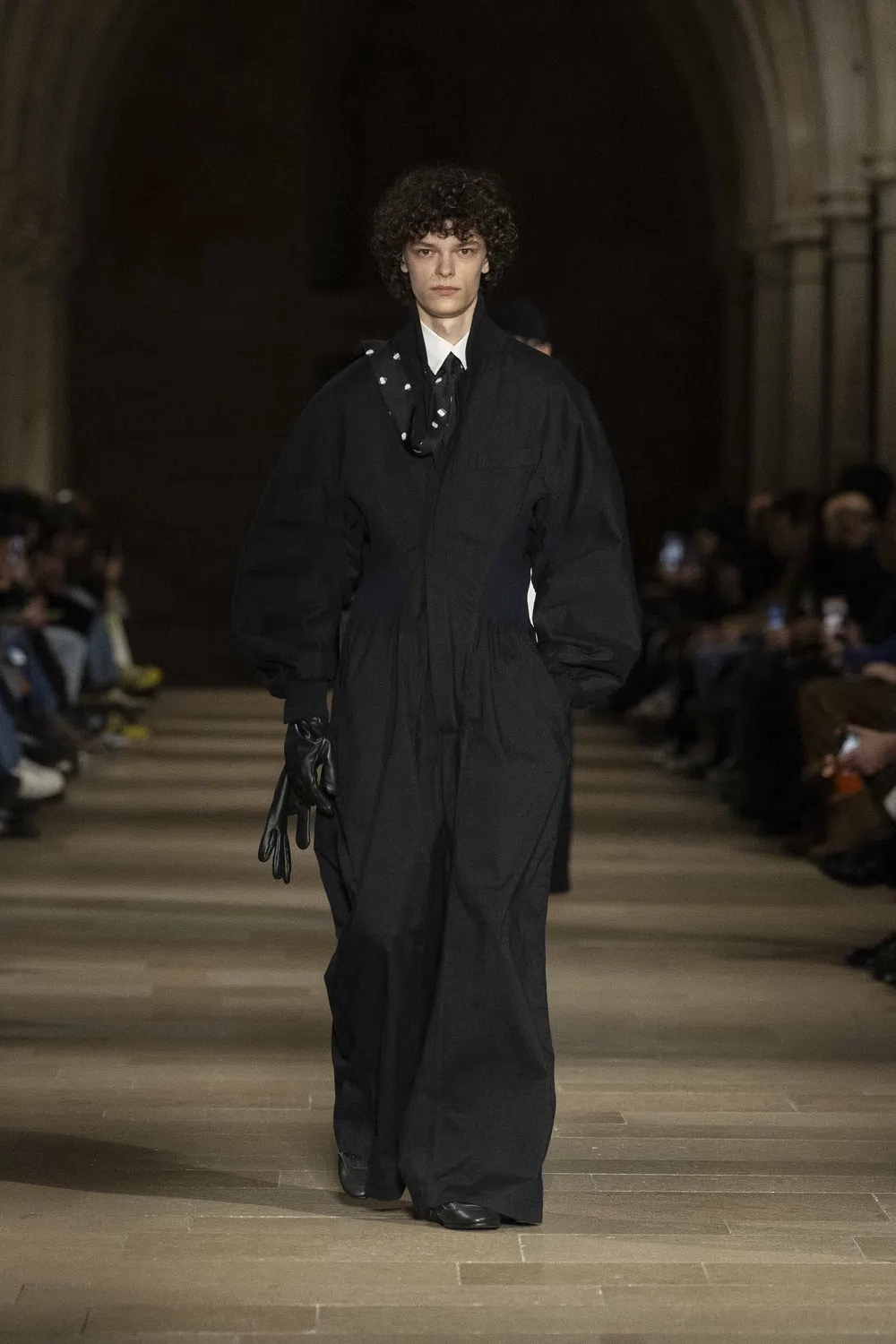 ジャンプスーツというワークウェアの構造を借りながら、長いネクタイを肩にかけたファーストルックは、ワークウエアという記号をフォーマルという形に転写する。“フォーマル”の象徴であるネクタイという記号を、あえて装飾やドレープとして肩に回すことで、<IM MEN>は形の記号性をずらしながら、“整うこと”の本質に迫った。