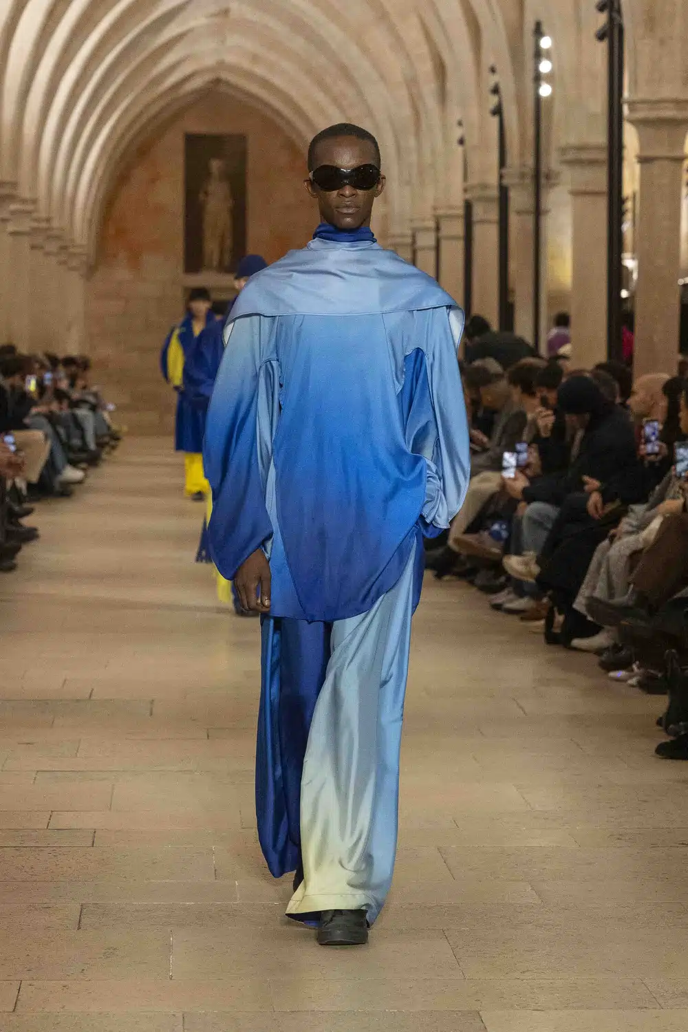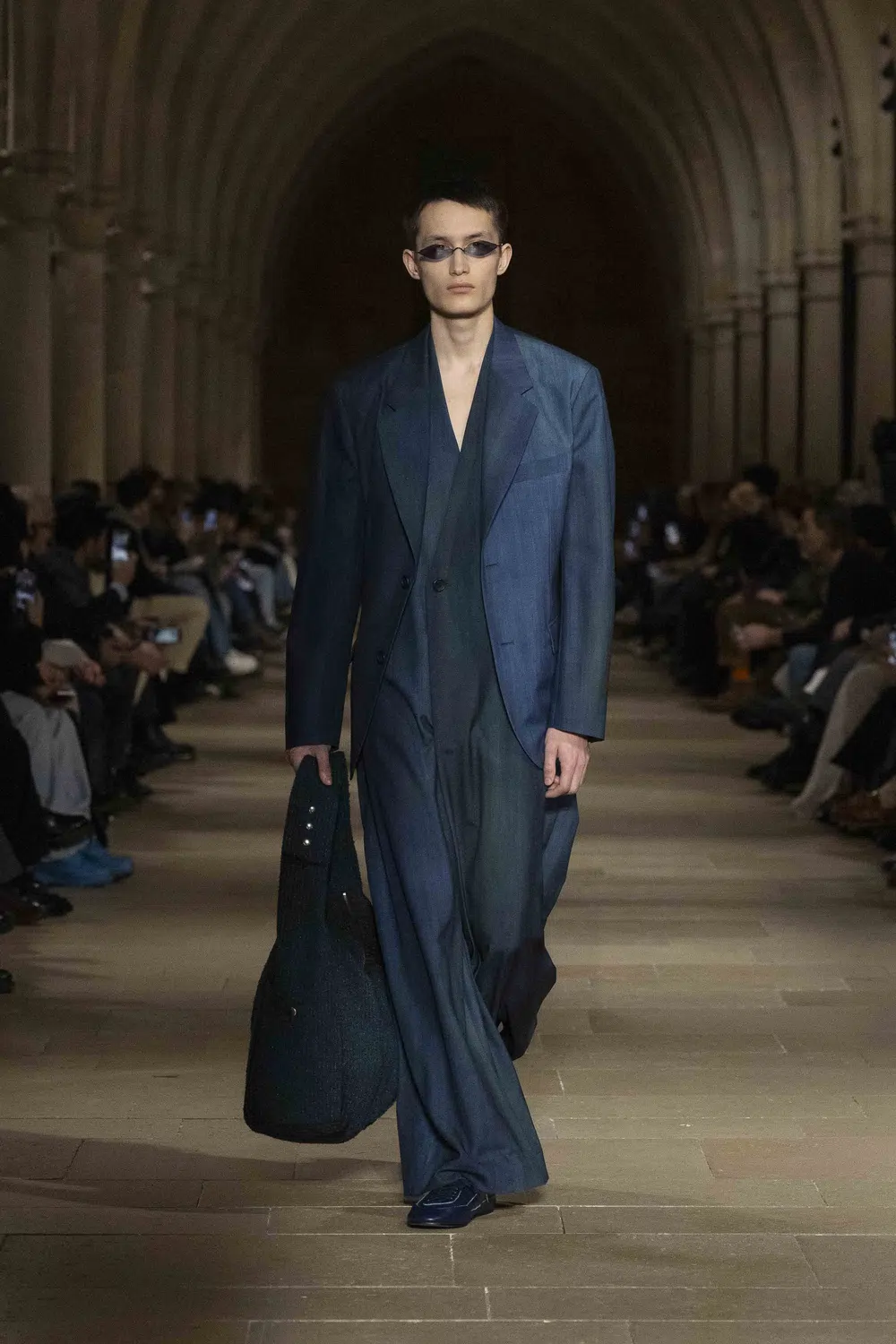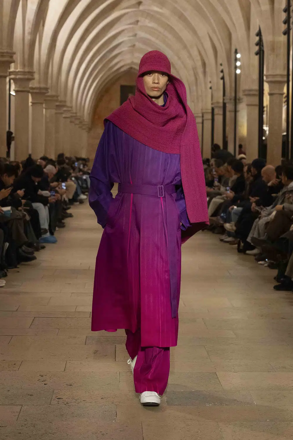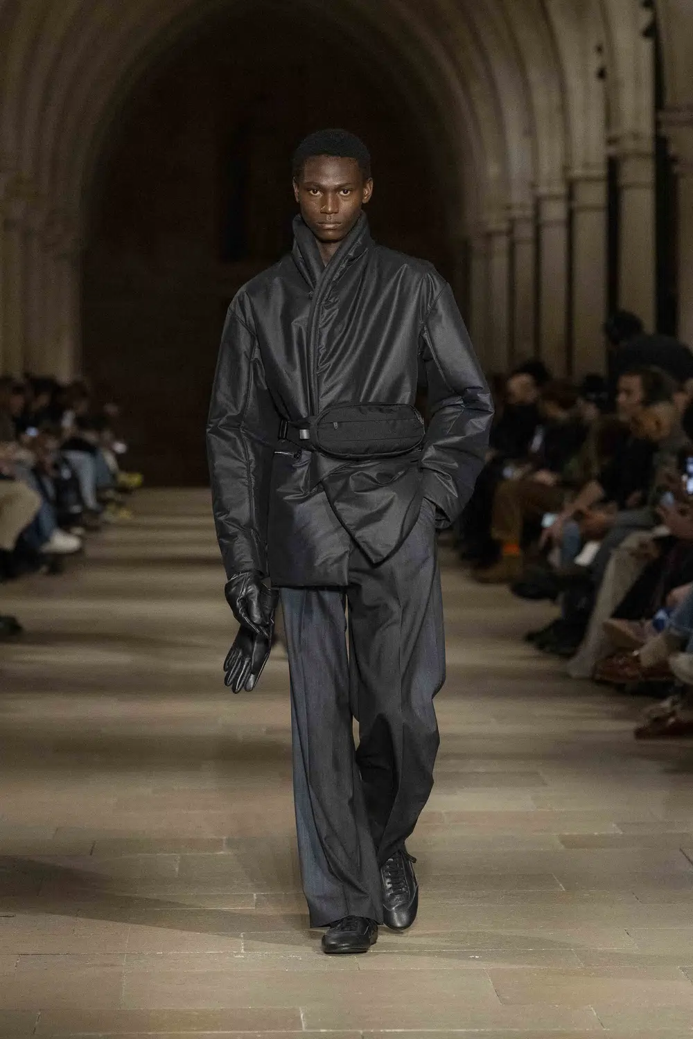 静かに響くピアノの旋律に合わせ、モデルたちはまっすぐに伸びたランウェイを歩く。服以外の要素がそぎ落とされた空間の中で、衣服そのものの存在が強調される演出だった。