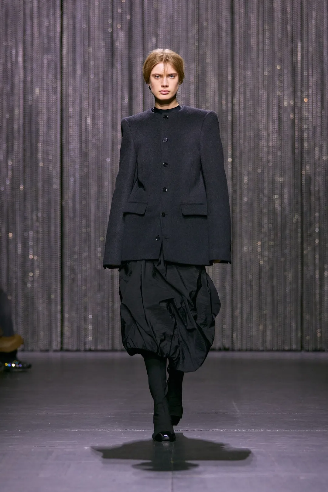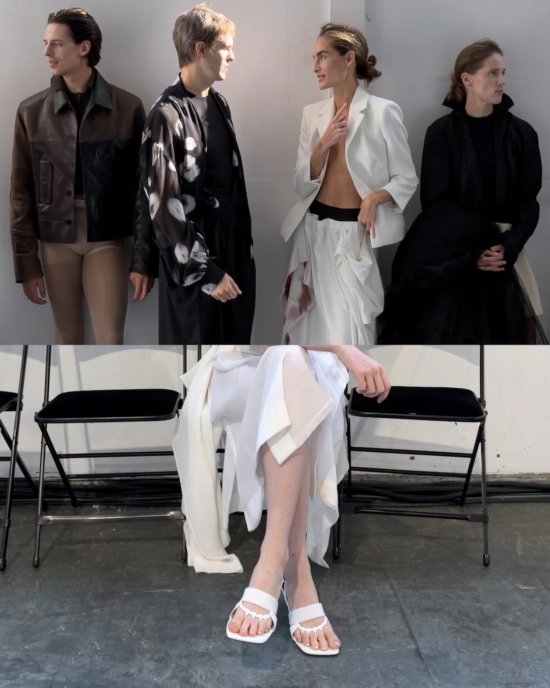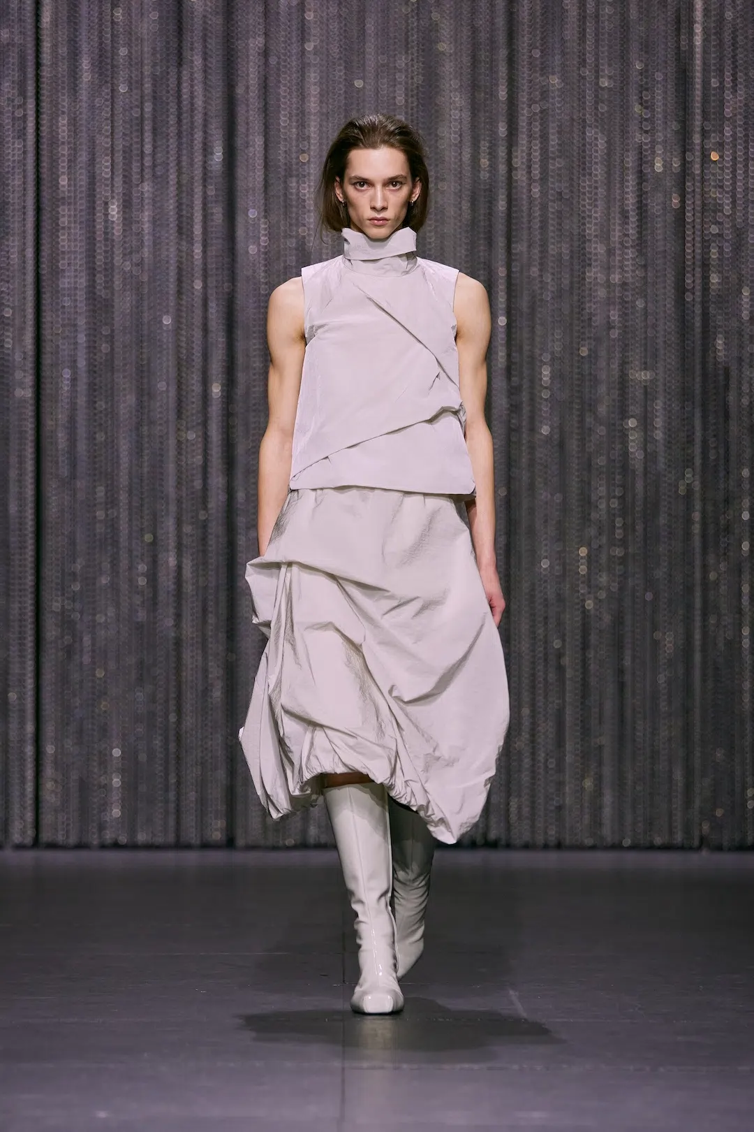 舞台と日常を行き来するダンサー像から着想し、フォーマルとカジュアルの二面性を柔らかくつなぐコレクション。ラペルやポケットをそぎ落としたクリーンなテーラリングを、トレーサブルウールやデッドストック素材で再構築する。パデッドナイロンや重厚シルクの流れるようなシルエット、再生ナイロンのドレープは、身体の動きと静けさを美しく捉える。pivoterシリーズは揺らぐフォルムで新しいバランス感を提示。ほどけるようなプリーツや再利用ストッキングの立体編み、アップサイクルレザーや加工デニムが、パフォーマーの内面にある強さと繊細さを映し出す。