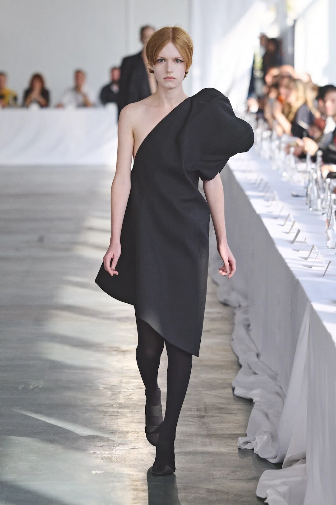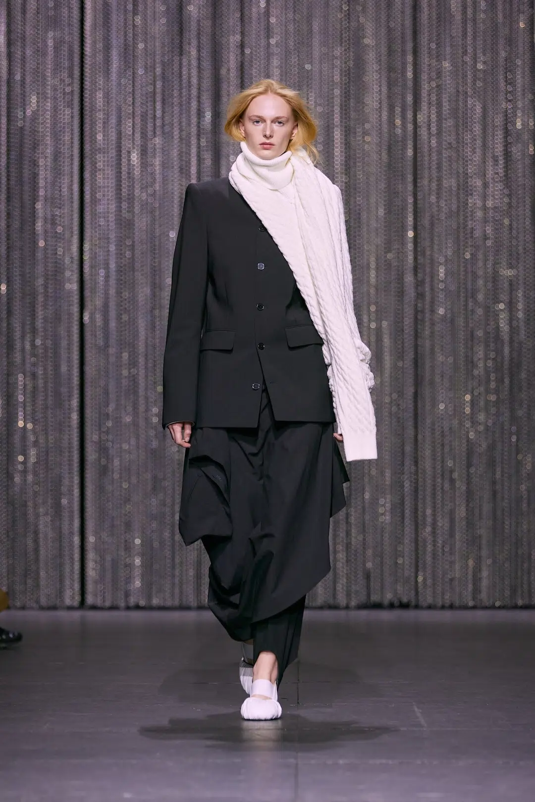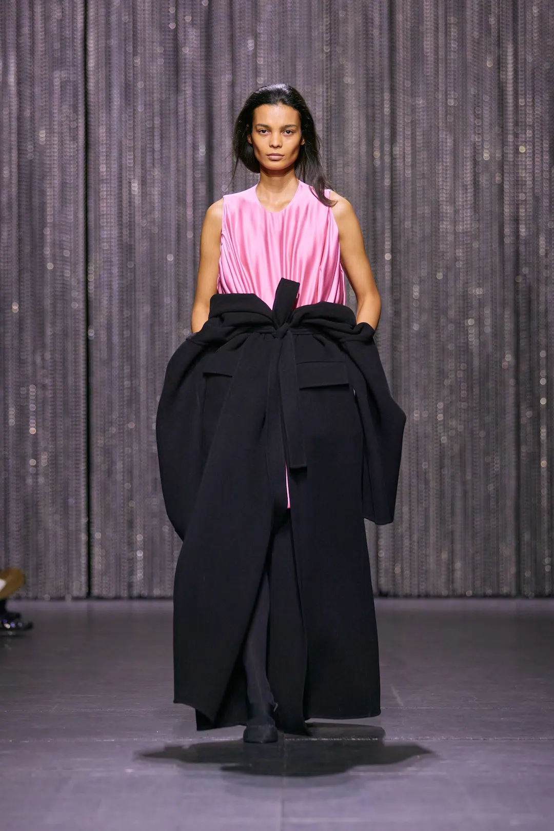 装うことを日常のオーディションに見立て、ダンサーが役を探る過程の揺らぎや繊細さを描いたコレクション。服を脱ぎかけた瞬間を留めたようなトップスやドレス、折り返して形を変えるシルエット、ドレープシャツと一体化したブレザーなど、着替えの動作をデザインとして昇華する。落ちる花を描いたホログラフィックプリントが脆さを映し出し、ダンサーのタイツや古い舞台衣装を再構築したアップサイクル作品、伸縮バンドを立体化した一点物のニットも登場。ダンサー用スリッパを再解釈した新シューズがコレクションを締めくくった。