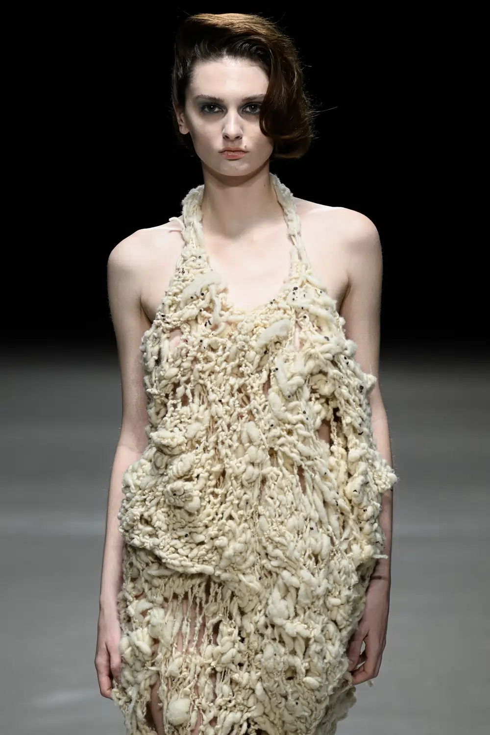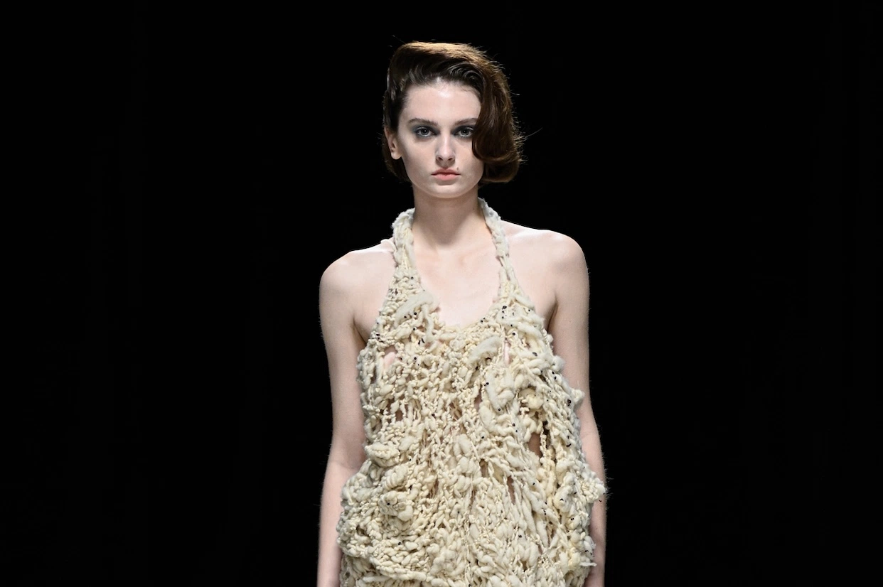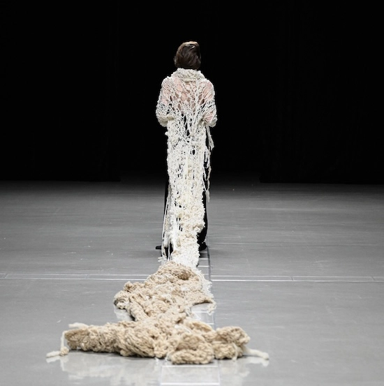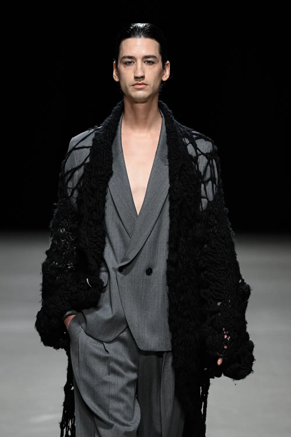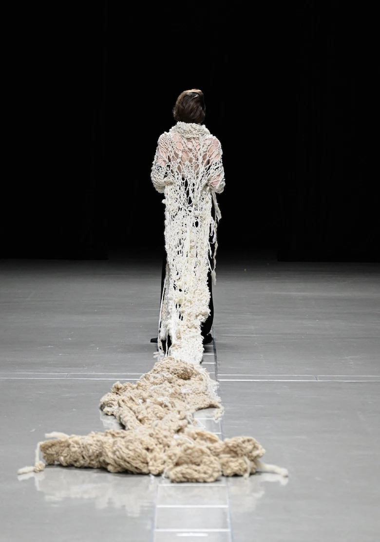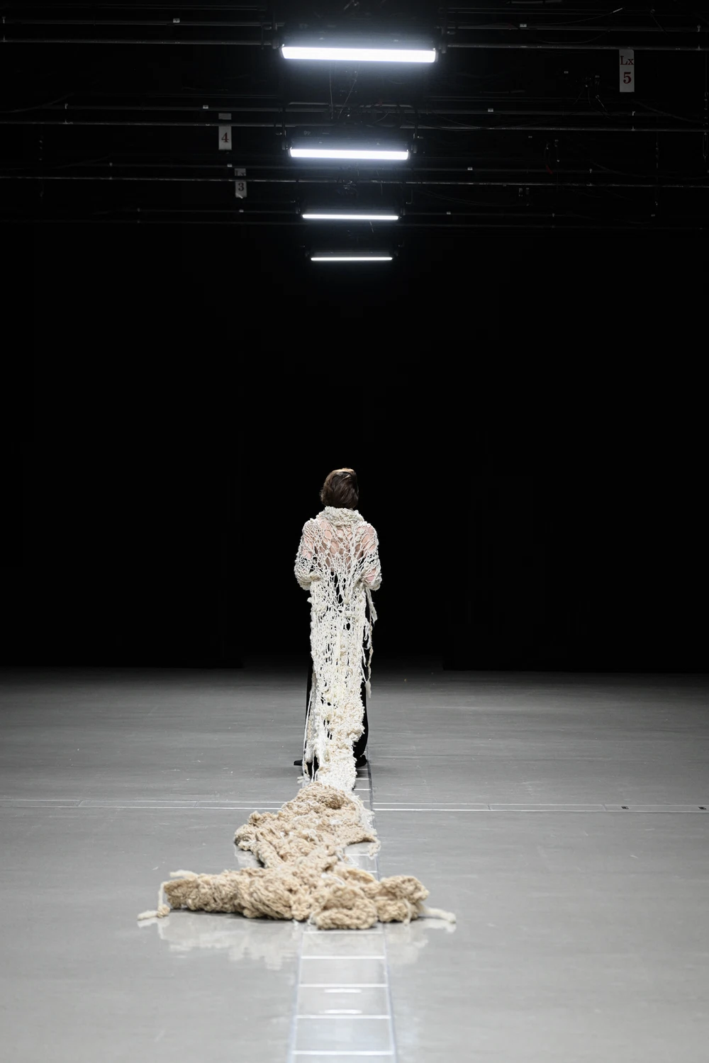 ニットウェア以外にも、彫刻のようなヘッドピースにブラックのテーラードジャケットにワイドパンツを合わせたルックが登場。インナーを排した大胆なスタイリングが、身体のラインと緊張感を強調する。顔を覆い隠すほどの大ぶりなホワイトのヘッドピースは、羽毛やレースのような繊細な素材が重層的に重なり、まるで可視化された空気の塊のような存在感を放つ。ミニマルな黒と有機的な白の対比が、今季のテーマを象徴している。