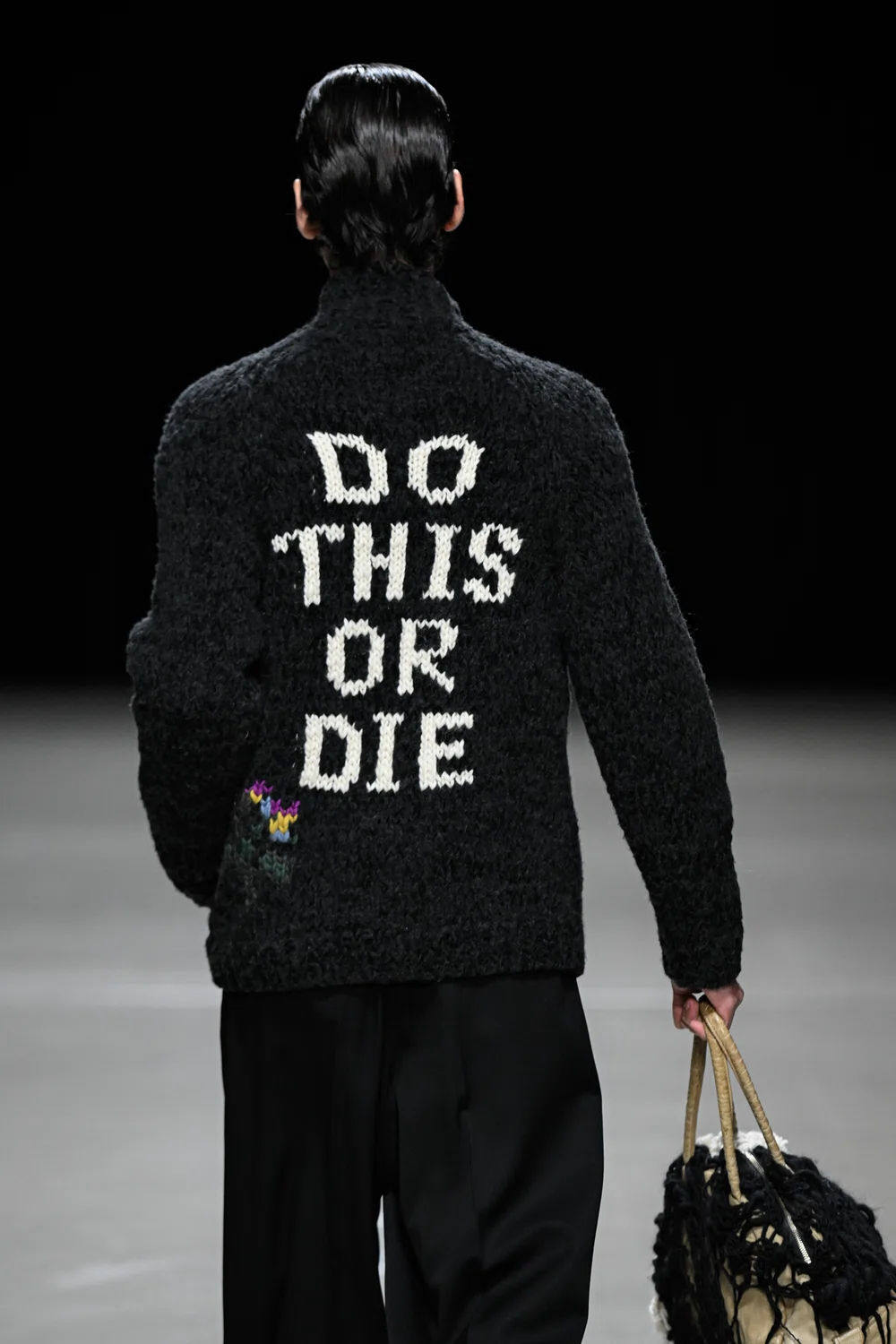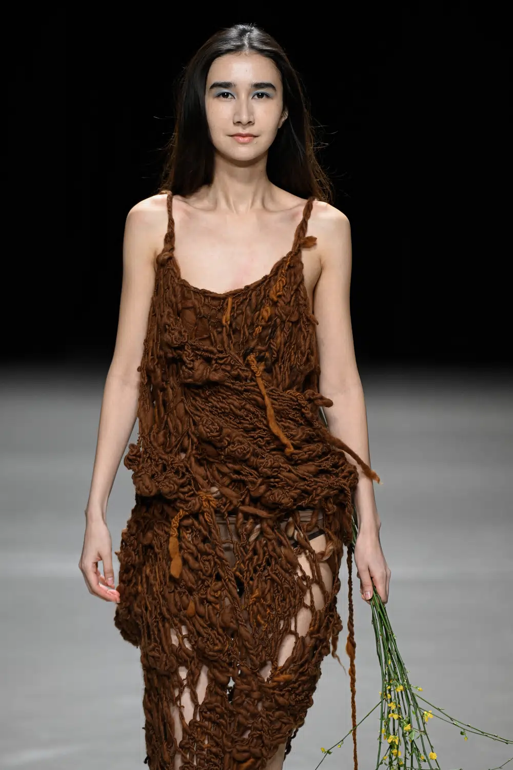 今回のコレクションの思想的背景には、人類学者クロード・レヴィ=ストロースによる著作『野生の思考』がある。この書物は、合理性や効率性を重視する近代的な思考とは異なる、人間が本来持っている感覚的な知性について論じたものだ。現代社会では、明確な分類や合理性によって世界を理解する方法が重視されるが、物事を管理し、効率的に処理するためには有効な思考であるとされている。しかしその一方で、人間がもともと持っている感覚的な知性が見落とされてしまう可能性もある。たとえば、理由は説明できないけれど安心する匂い。どこか懐かしさを感じる形。言葉にはできないが惹かれてしまう感覚。そうした曖昧な感覚もまた、人間が世界を理解するための重要な知性である、そしてそれは工藤氏の中でニットの構造とどこか似ていると感じたという。手紡ぎ糸の不規則な太さ、編み進めるなかで生まれる密度の違い、偶然と意図が重なり合う構造。それらは完全に整った秩序ではなく、曖昧さを含んだ秩序として現れた。