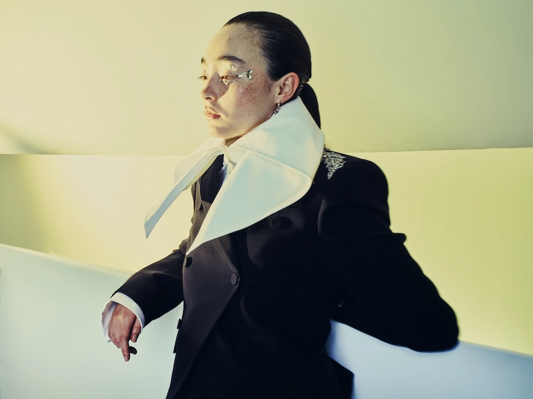 ジャケットのショルダーラインは力強く、シャツの襟は大胆を極め、非対称のスカートは存在そのものがデコラティブ。背面を彩るビジューは生命力にあふれ、<McQueen>ならではのエネルギッシュさが静謐な空間の中で確かな存在感を放つ。
