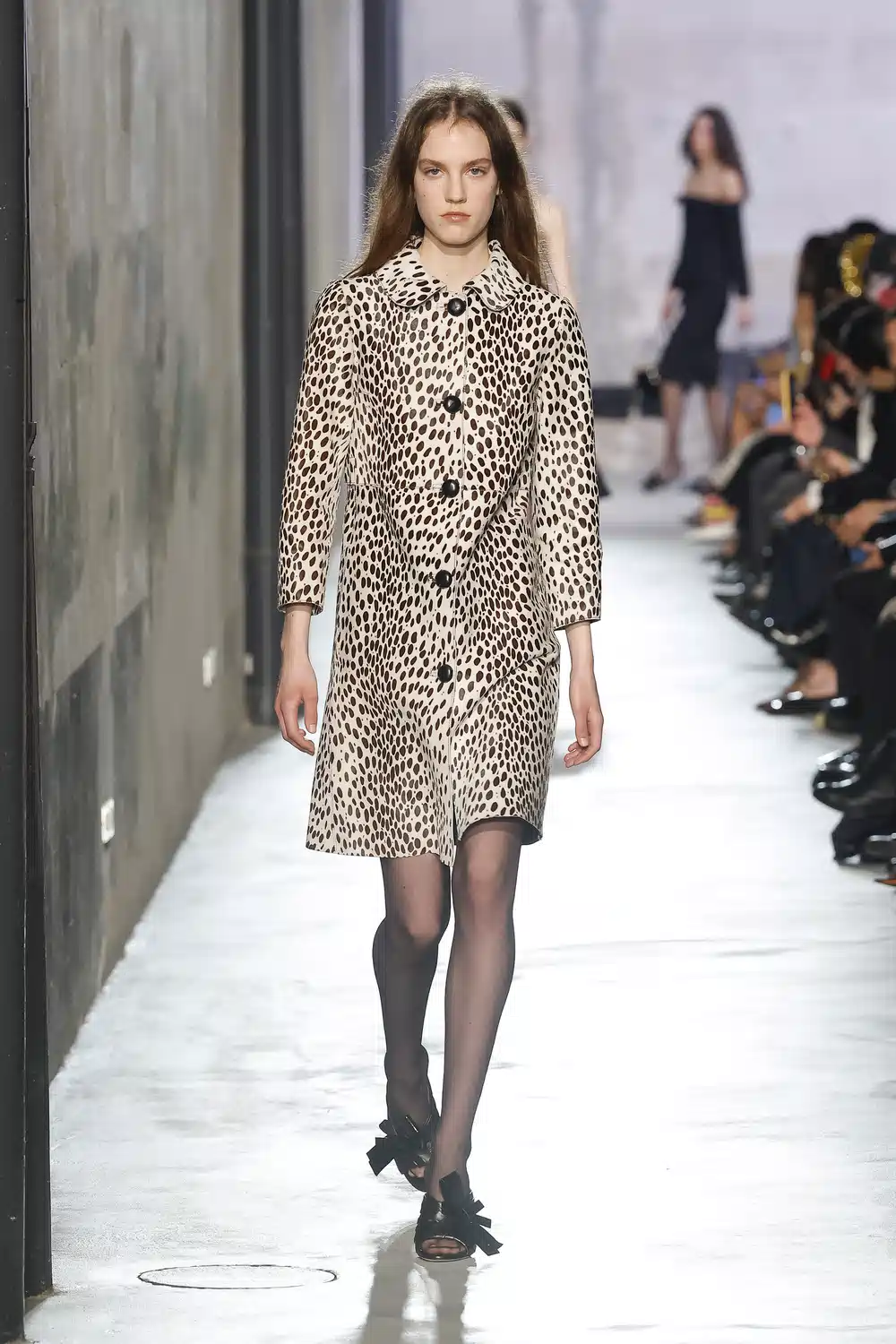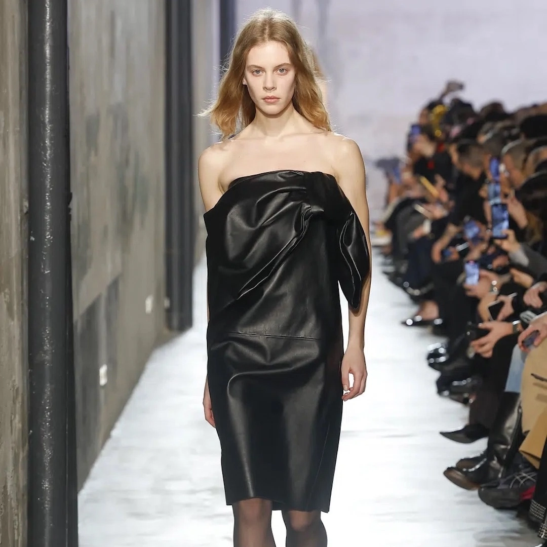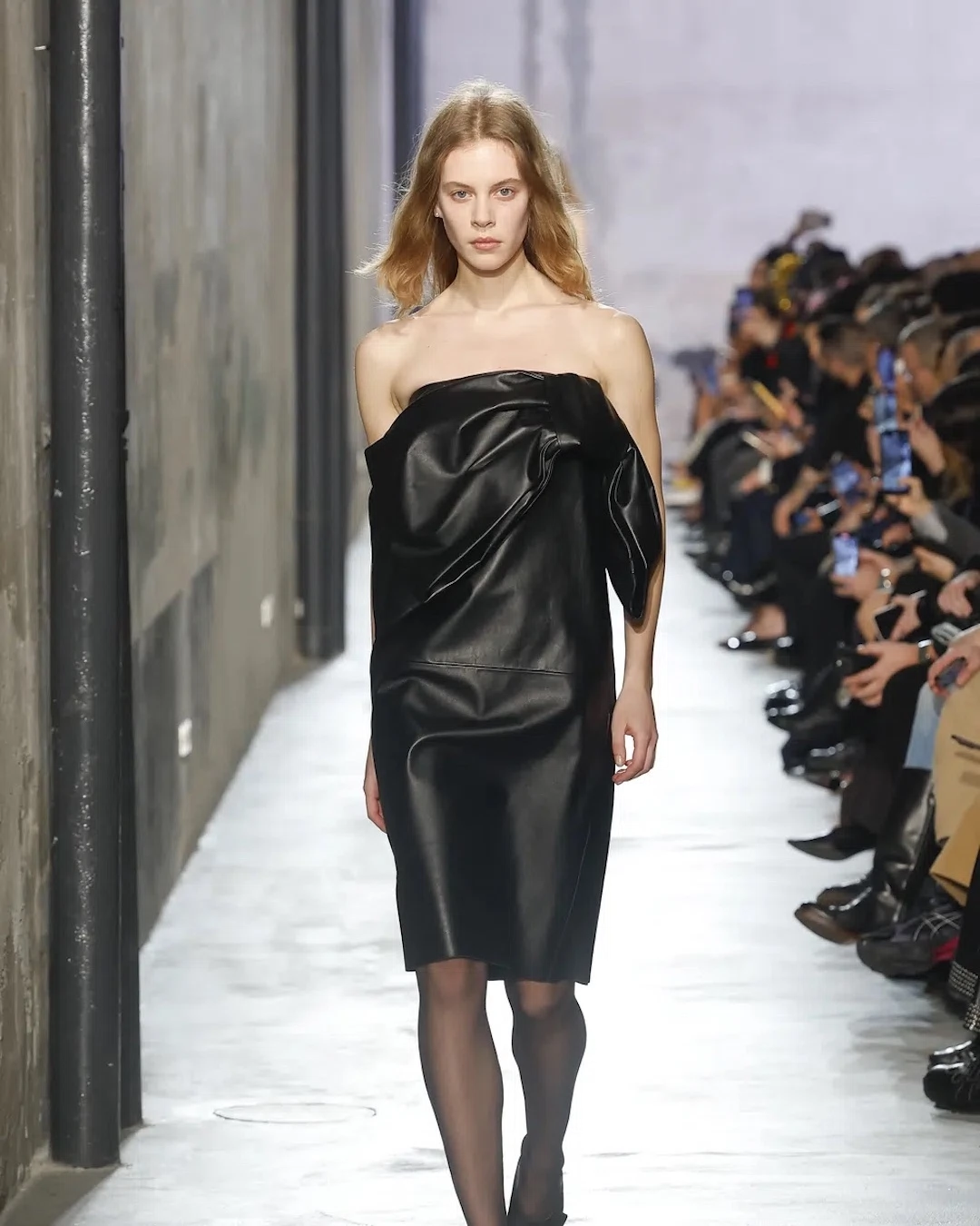 その後に続くのは、ダルメシアンスポットのポニースキンやレザーコートで、さらにスリムなネオプレン/ウールセーターには、大きなフレアスリーブが加えられ、視覚的にインパクトを与える。これらに施されたリボンは、シルエットを引き立て、全体の印象をまとめる役割を果たしている。