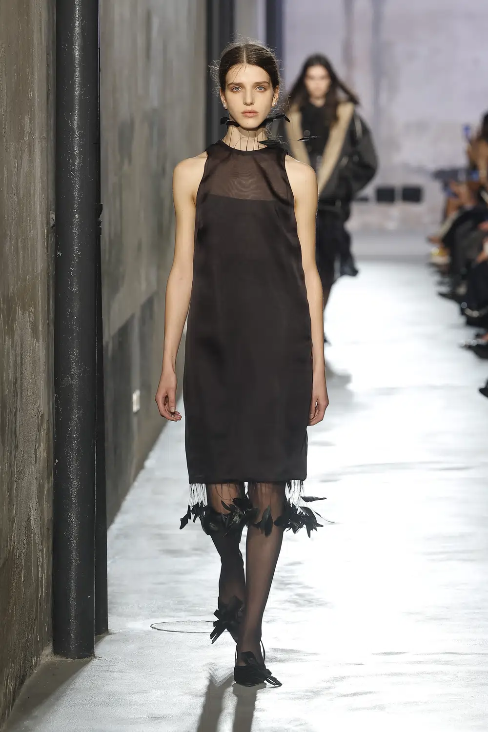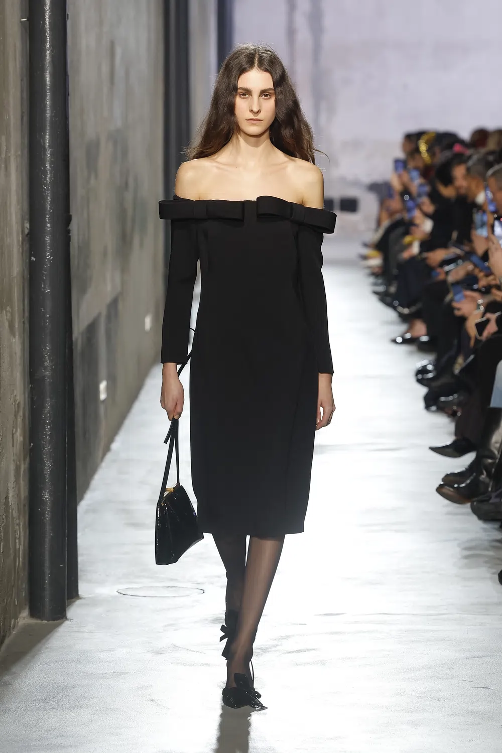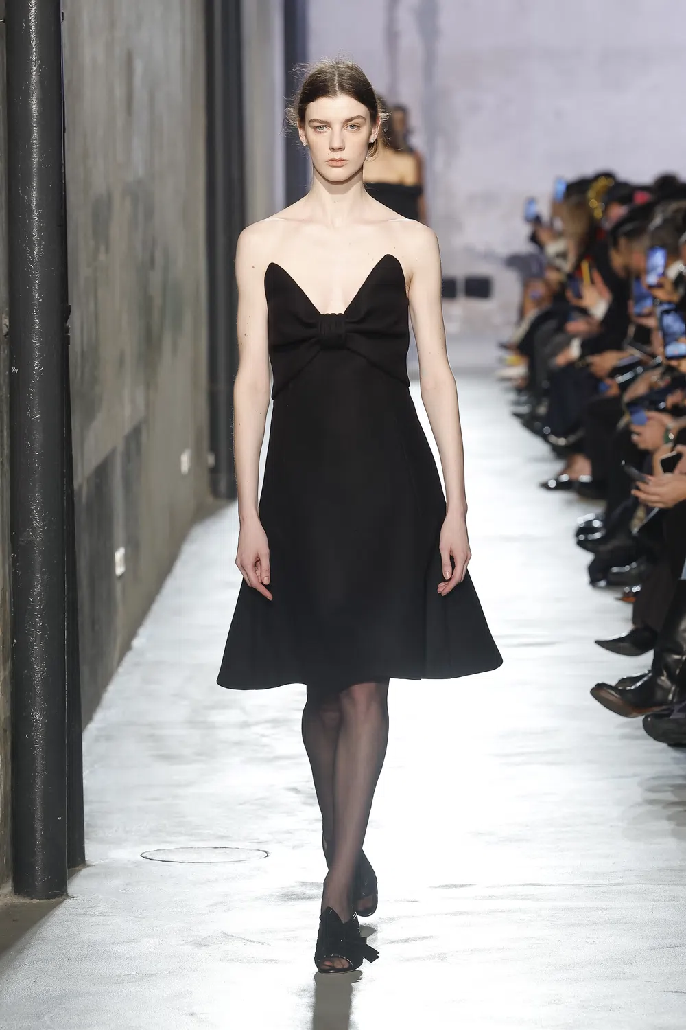 特に注目すべきは、「プチ・ローブ・ノワール」へのオマージュとして登場する黒いシフォンのスリップドレス。エンパイアラインに沿ったリボンが、シンプルながらも洗練されたエレガンスを表現している。さらに、ヴィクトリアン刺繍が施されたシャツドレス風のスタイルや、低めのネックラインにリボンをあしらったドレスも登場し、ミニマルな美しさとロマンティックな要素を見事に融合させている。