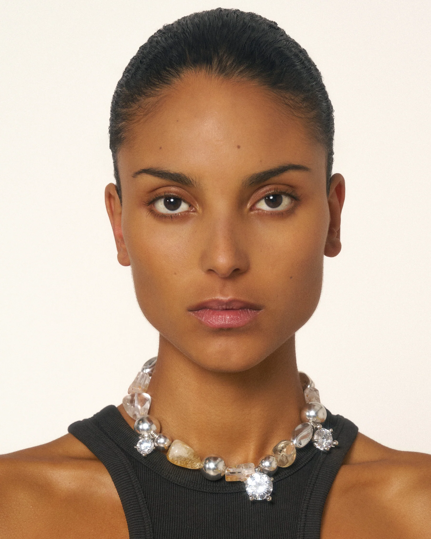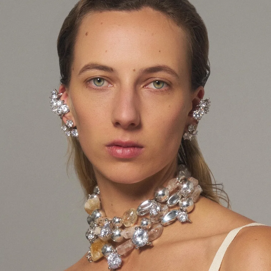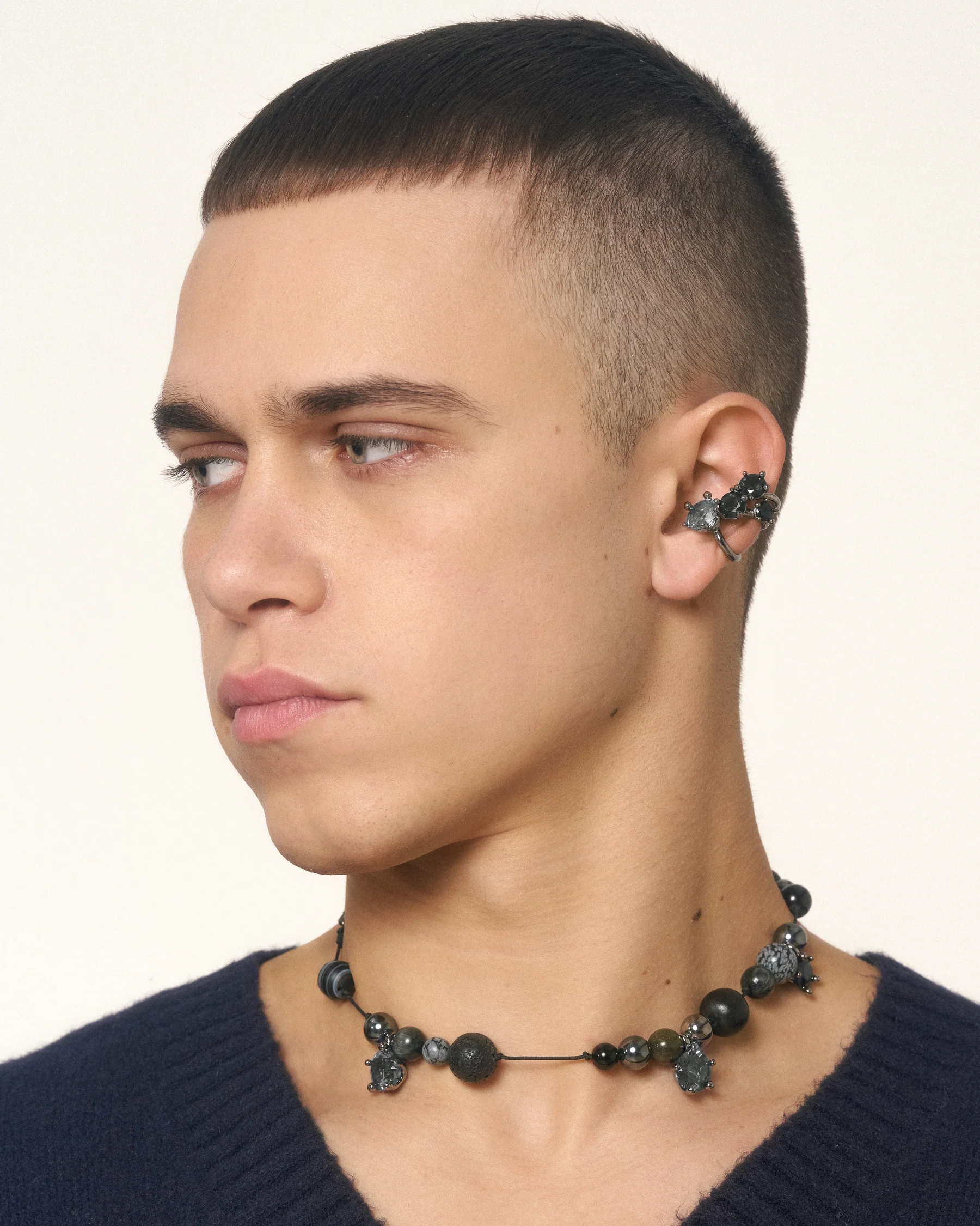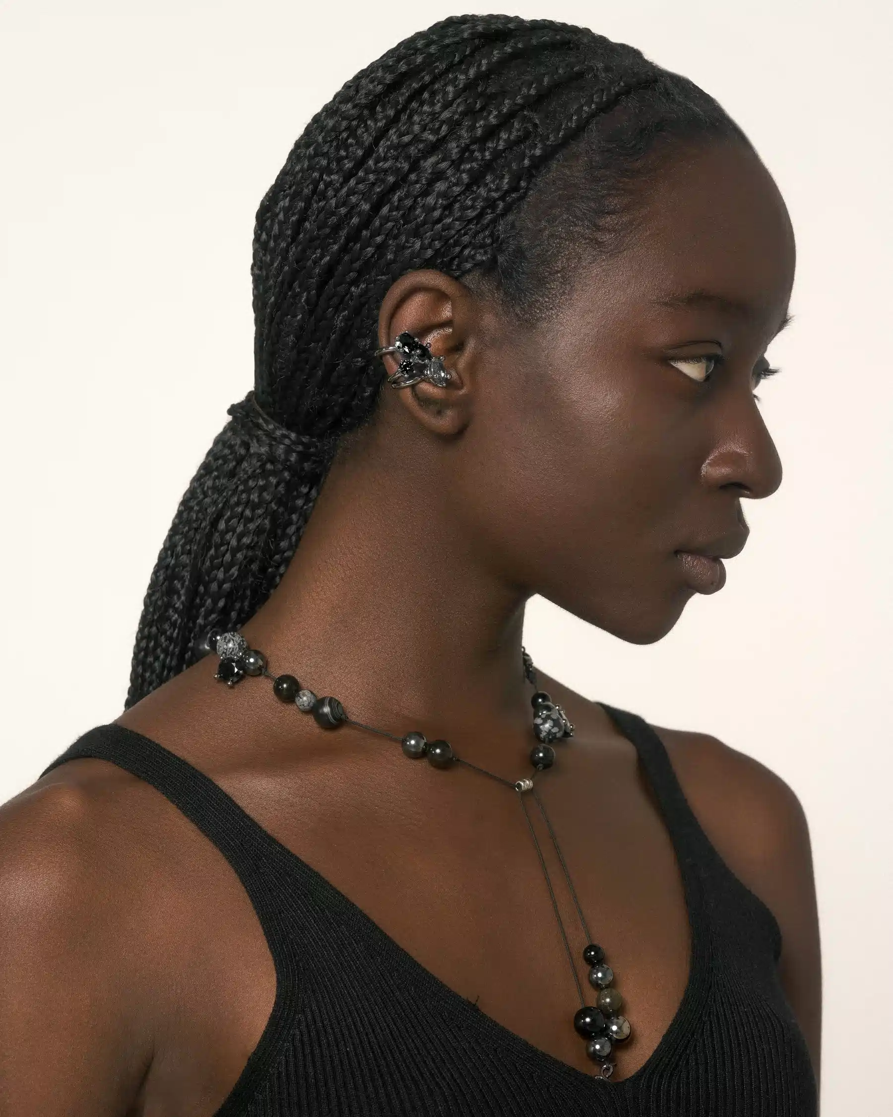 ブランドの中核を担う「Blow Up(ブローアップ)」は、シーズンを重ねるごとに進化を続けるアイコニックなシリーズ。今季は、大小さまざまなボリュームのイヤリングがシルバーとゴールドで登場。手の甲を覆うような大型リングや、ネックレスとしてもタイのようにも使えるボロタイ、さらに新作アンクレットも加わり、スタイリングの自由度が一層広がる。
