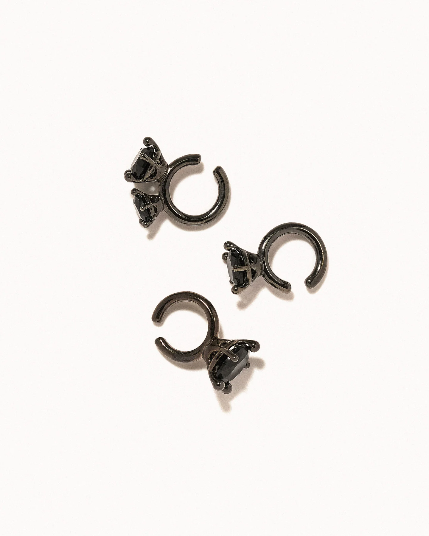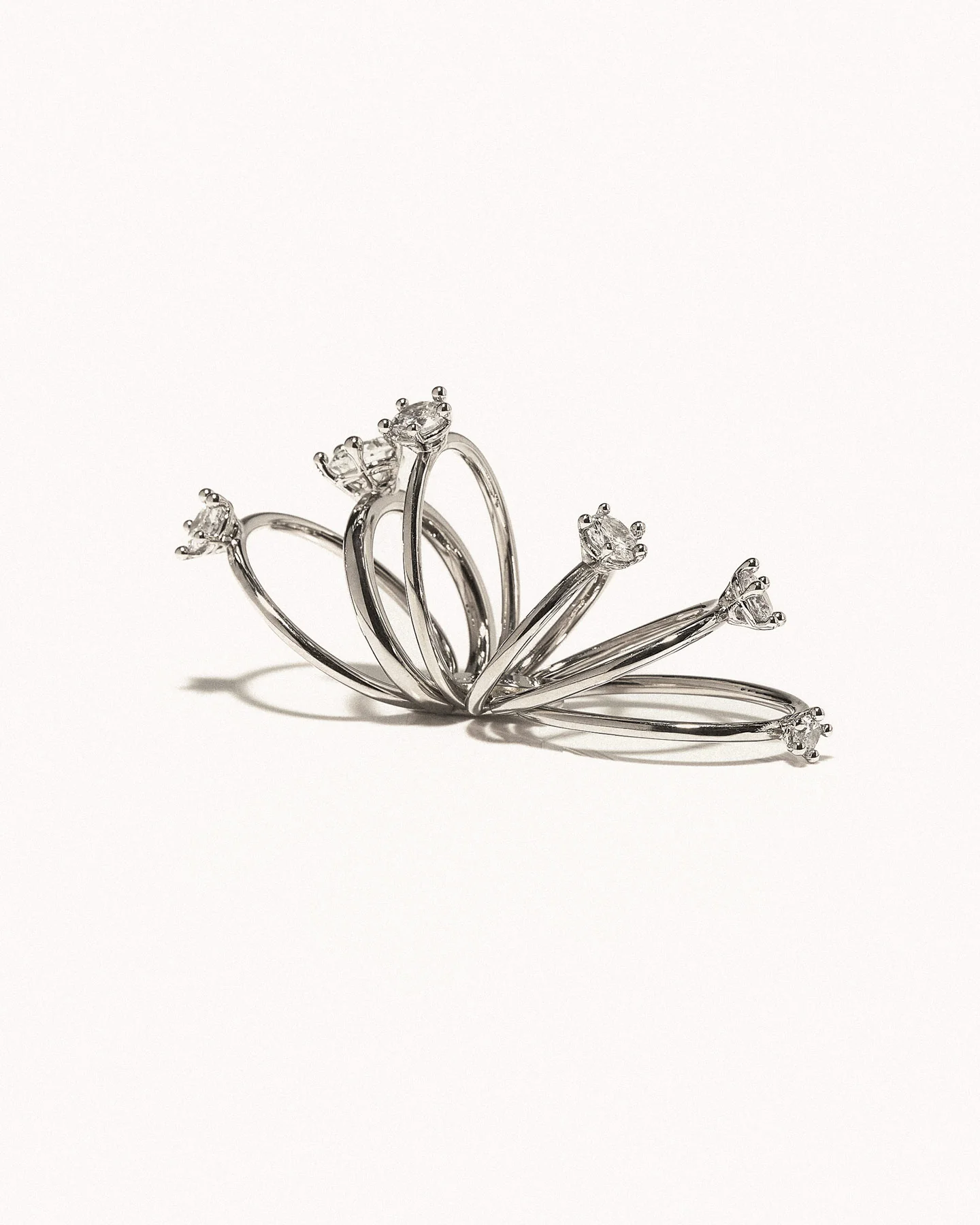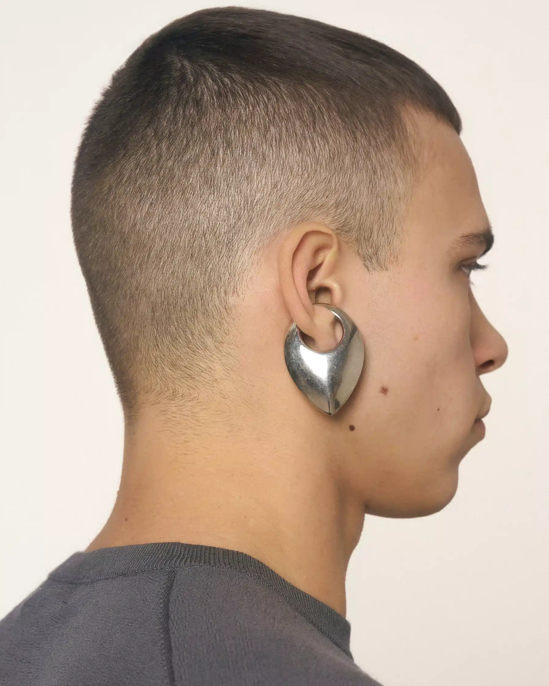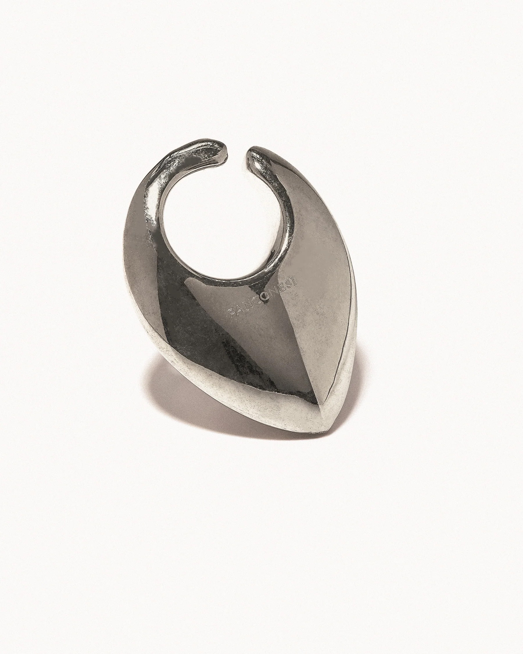 「Blow Up」シリーズをベースに展開される新シリーズ「Spada(スパーダ)」は、柔らかなカーブから鋭く尖ったエッジへと変化する造形美が特徴。シルバーのドロップイヤリングはシャープで大胆な存在感を放ち、イヤカフは日常使いにもぴったりなミニマルな佇まいを見せる。