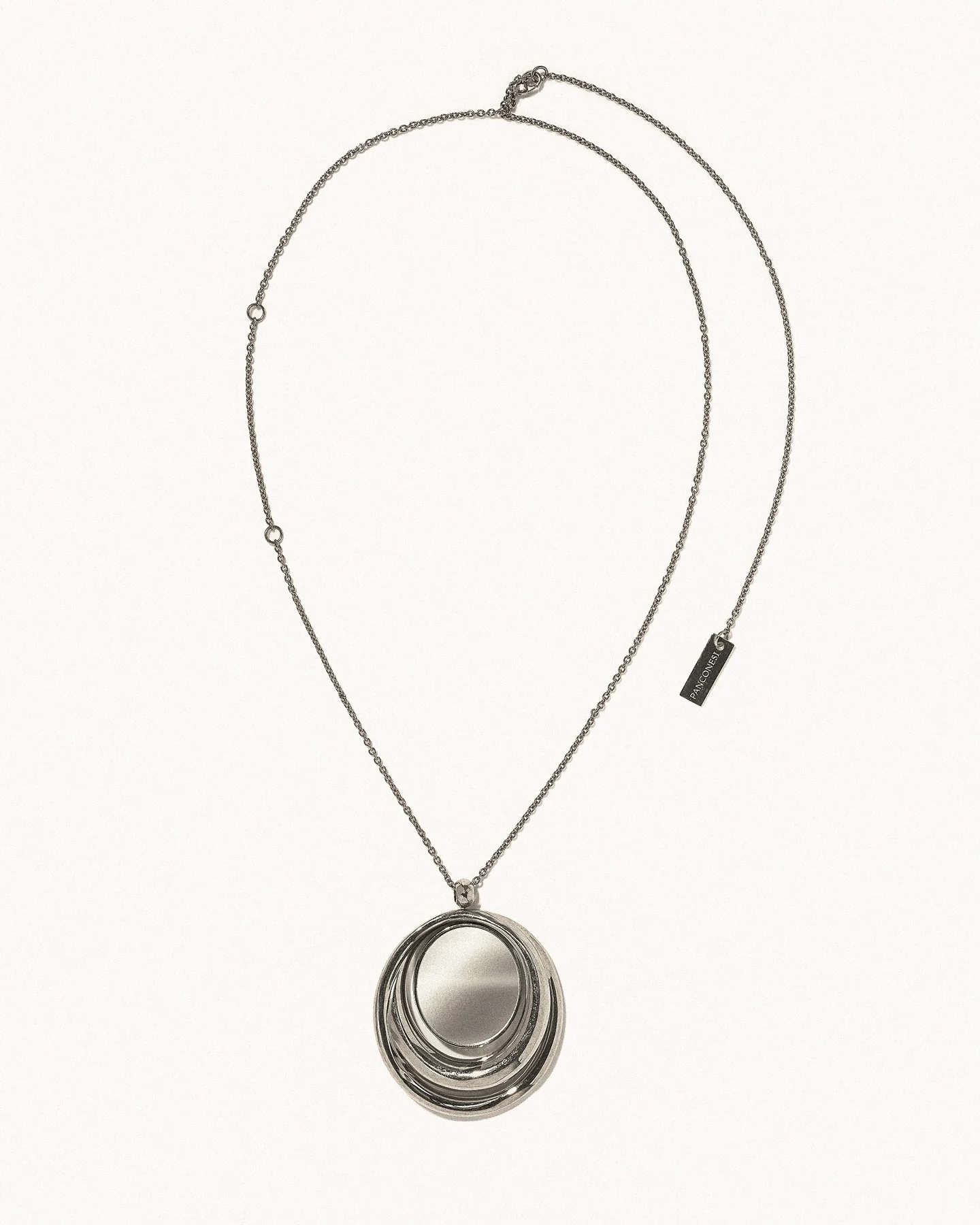 透明なアゲートを用いた「Dusk」イヤリングやペンダントは、光を柔らかく透過し、幻想的なオーラを放つアイテムに。ネックレスには小さな回転式ミラーも忍ばせてあり、まるで内省の時間を楽しむような仕掛けも。