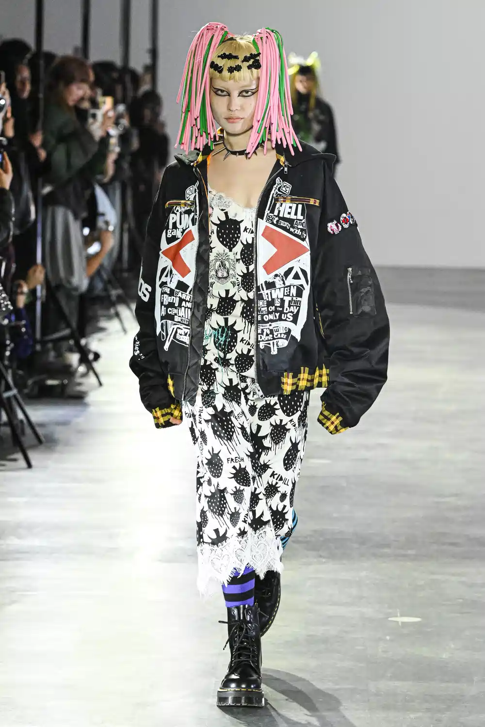 過去のサブカルチャーへのノスタルジーにとらわれず、未来的で革新的なファッションの可能性を追求したコレクションに仕上がっている。