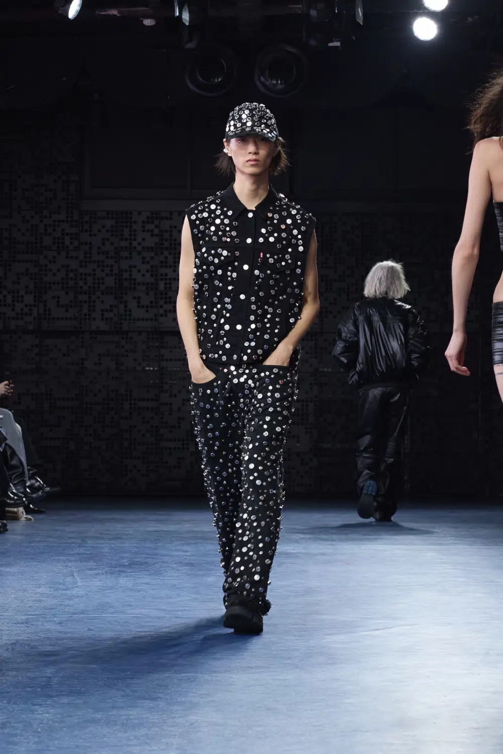 コレクションには、力強いシルエットや、政治的信念を反映させたアイテムが多数登場。特に、シルバーのウインドブレーカーや、ジャンヌ・ダルクからインスパイアを受けた鎧のようなデザインは今シーズンを象徴している。