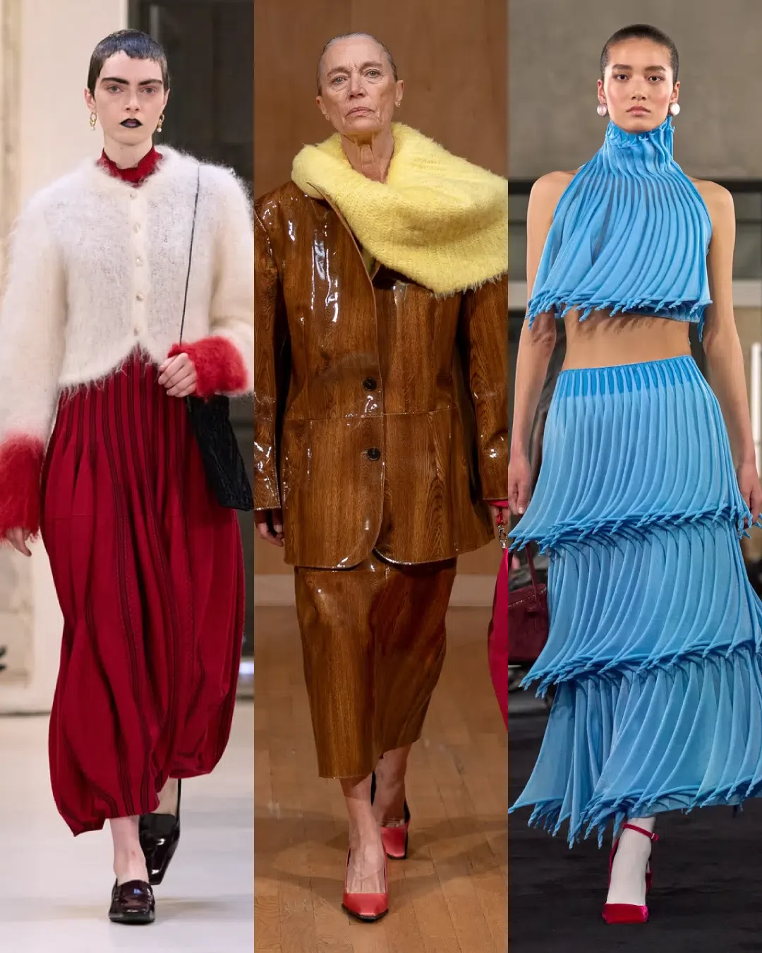 コレクションでは、ミラノリブのブルゾンやプリーツ構造をもつアコーディオンドレス、円錐形に広がるフレアドレス、メタリック糸で編まれたチューブ型のドレスなど、再生素材を用いたシリーズがラインナップされ、それぞれのフォルムがリズムとグラフィックを体現。