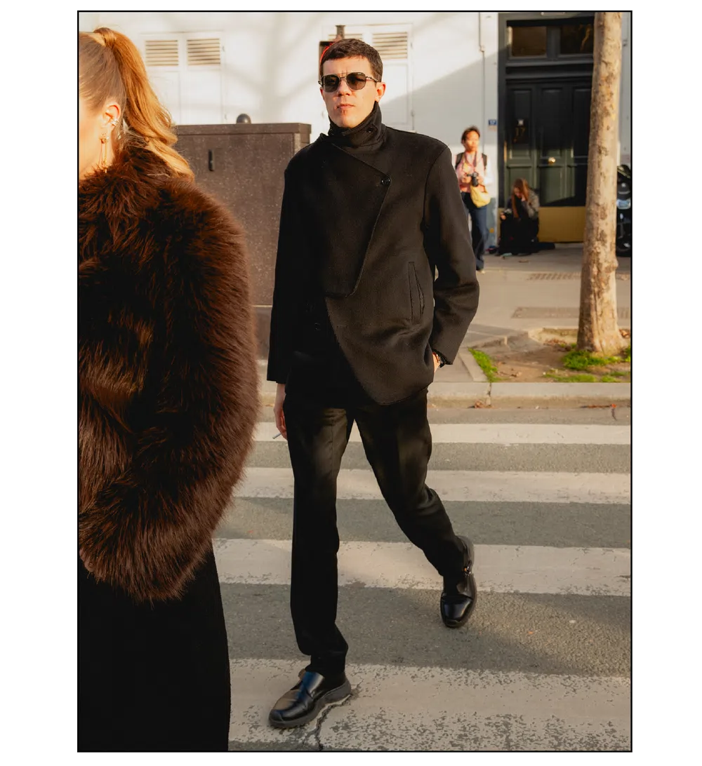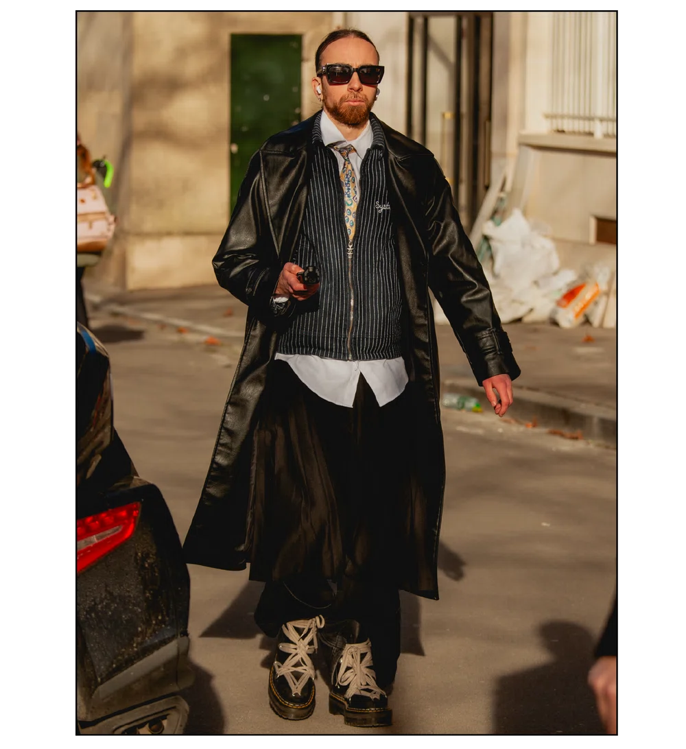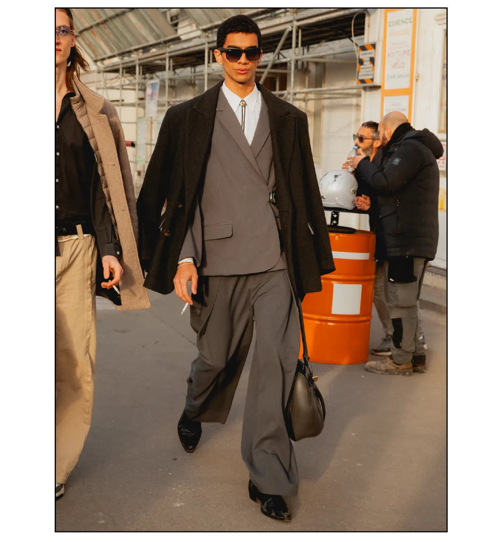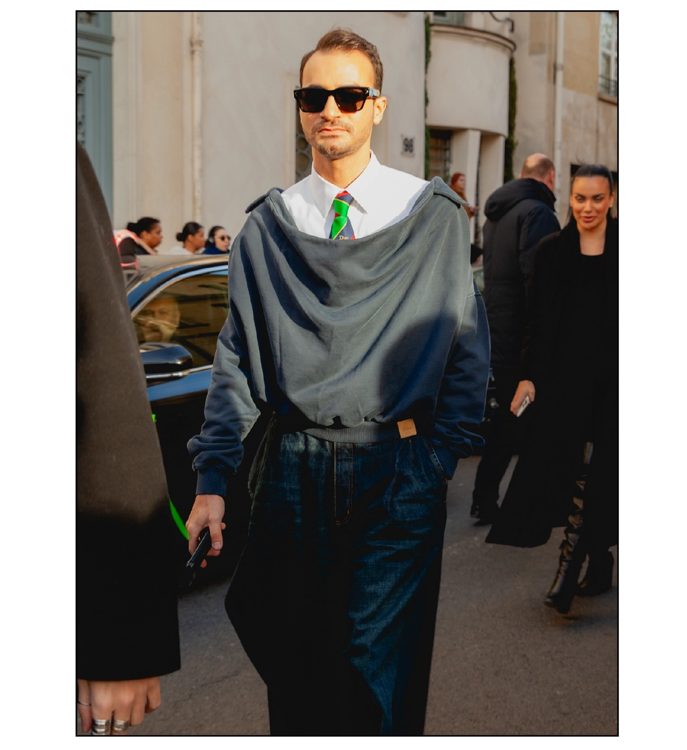 ランウェイを闊歩するモデルを現代の「フラヌール(遊歩者)」、すなわちクチュールの歴史との新たな繋がりに衝撃を受け、パリを彷徨う貴族の若者に見立てた<DIOR(ディオール)>。デザイナーはポール・ポワレの流動的な美学を引用しつつ、フォーマルとデニム、テーラードとテクニカル、あるいは古きものと新しきものといった相反する要素を、見事な調和のもとに共存させてみせた。その世界観に呼応するように、来場者たちの装いもまた、新旧をしなやかに行き来する感性に満ちていた。