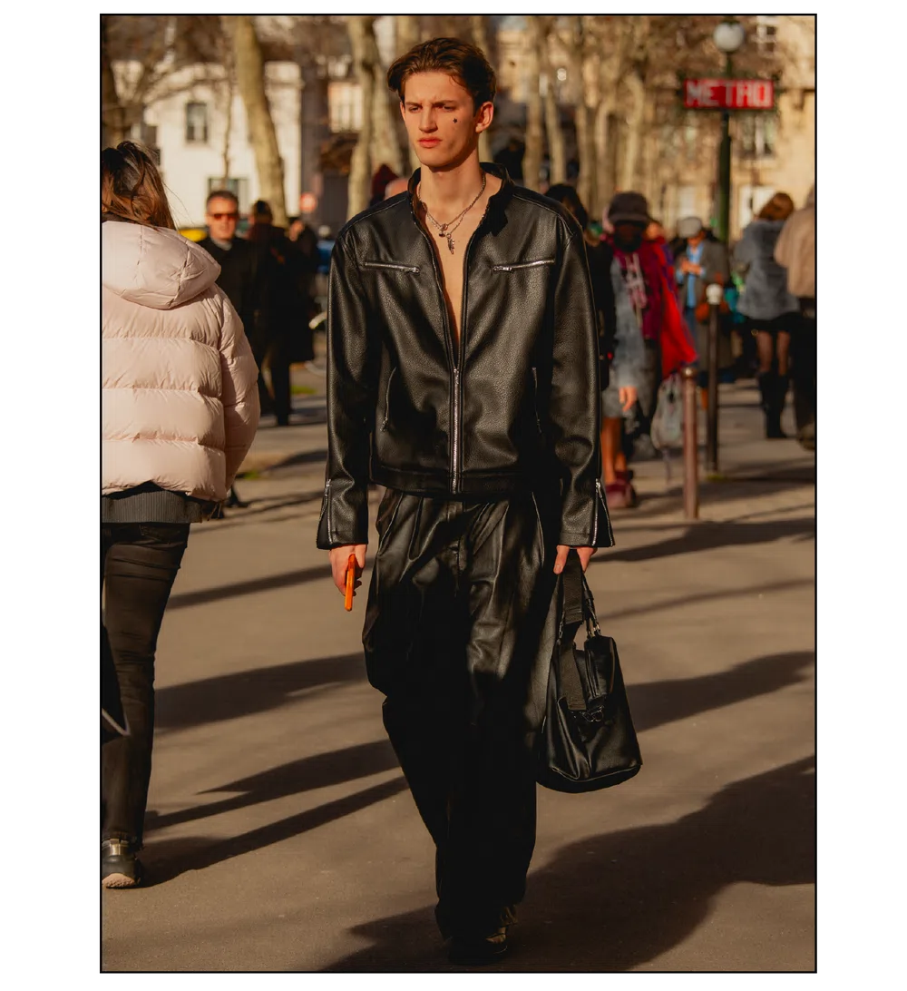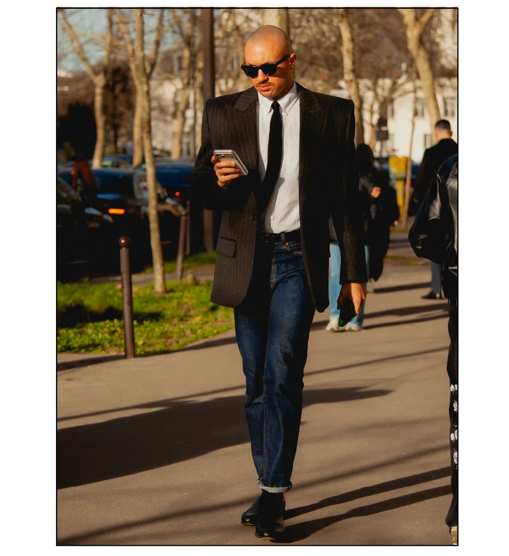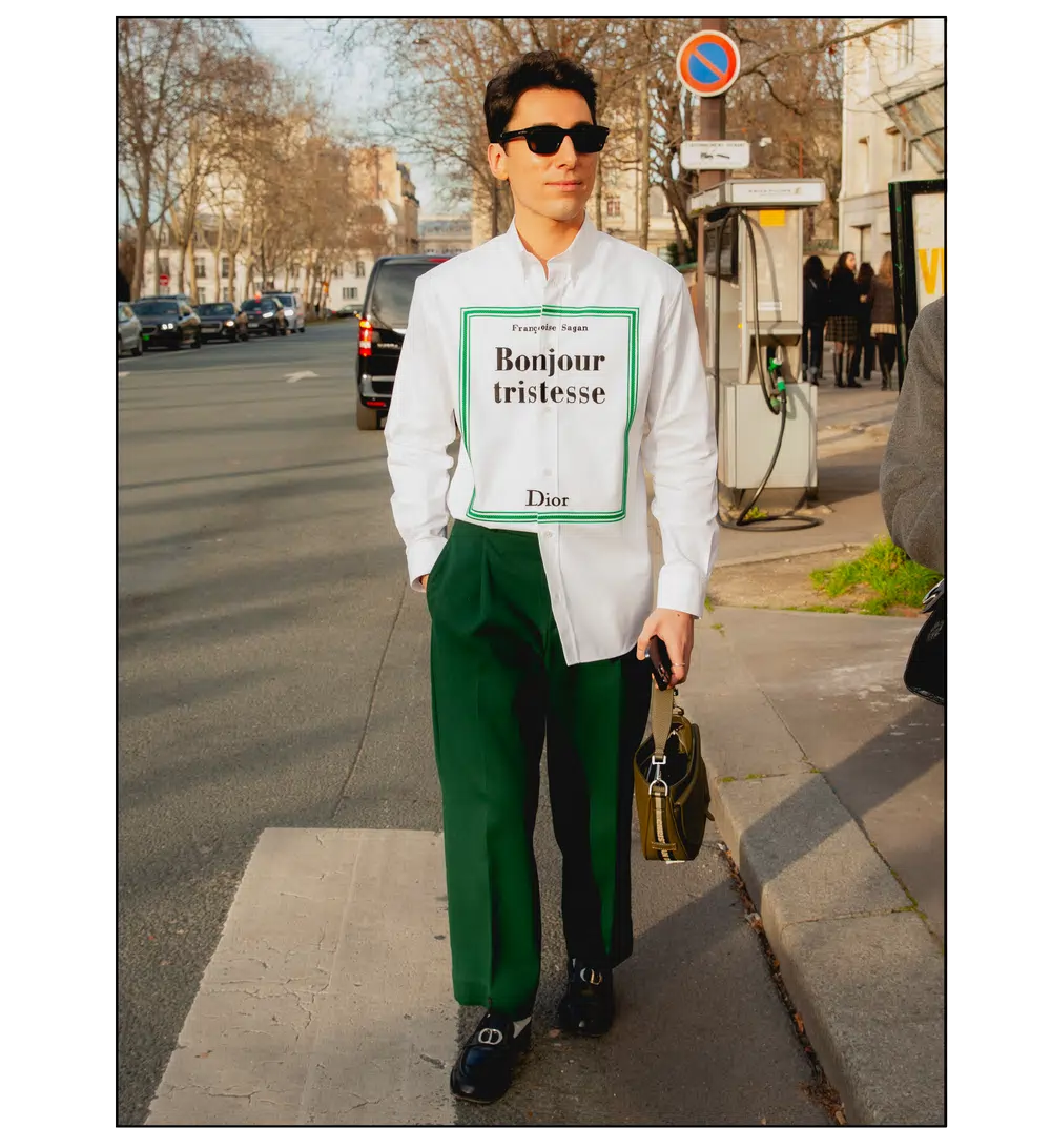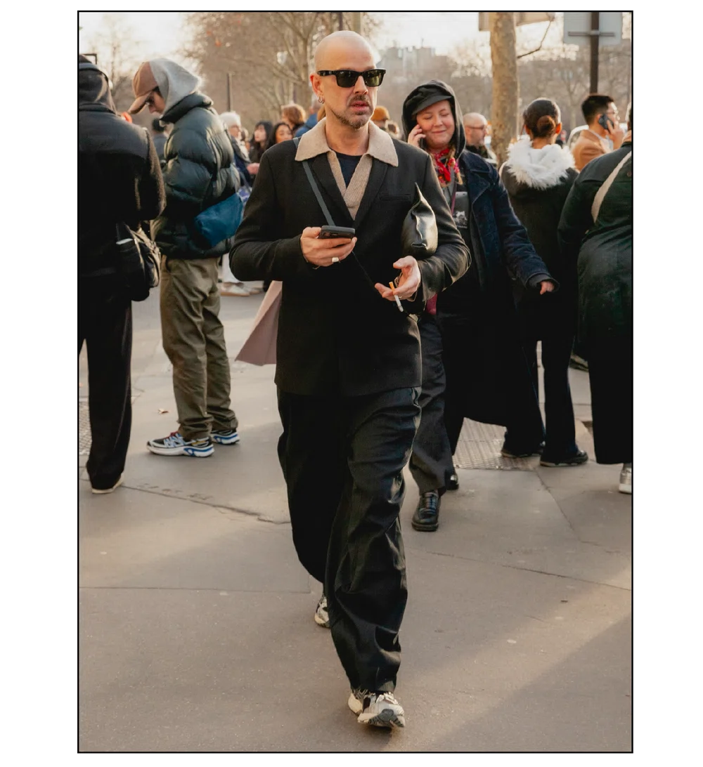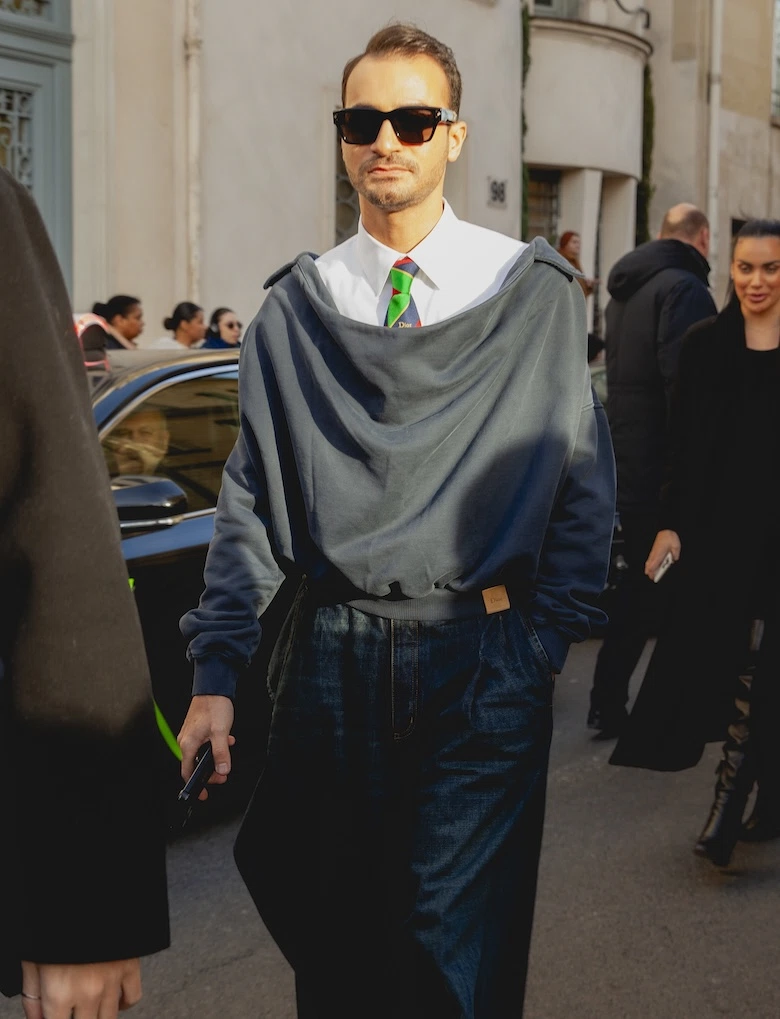 ランウェイを闊歩するモデルを現代の「フラヌール(遊歩者)」、すなわちクチュールの歴史との新たな繋がりに衝撃を受け、パリを彷徨う貴族の若者に見立てた<DIOR(ディオール)>。デザイナーはポール・ポワレの流動的な美学を引用しつつ、フォーマルとデニム、テーラードとテクニカル、あるいは古きものと新しきものといった相反する要素を、見事な調和のもとに共存させてみせた。その世界観に呼応するように、来場者たちの装いもまた、新旧をしなやかに行き来する感性に満ちていた。