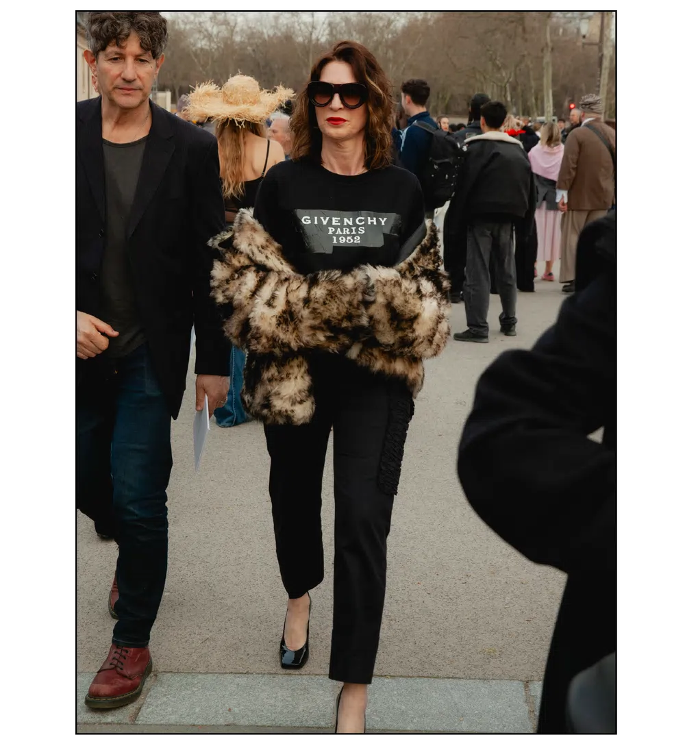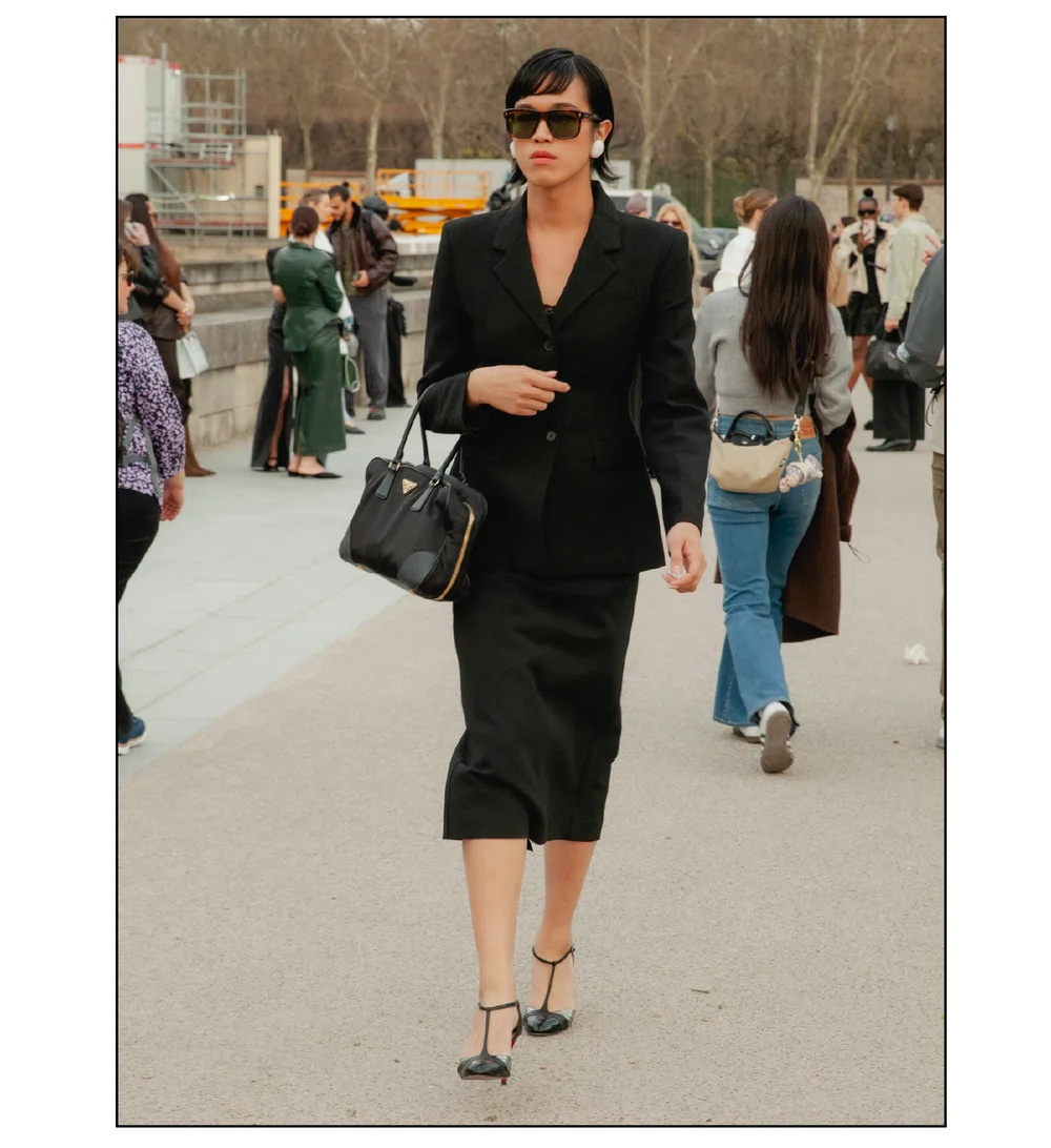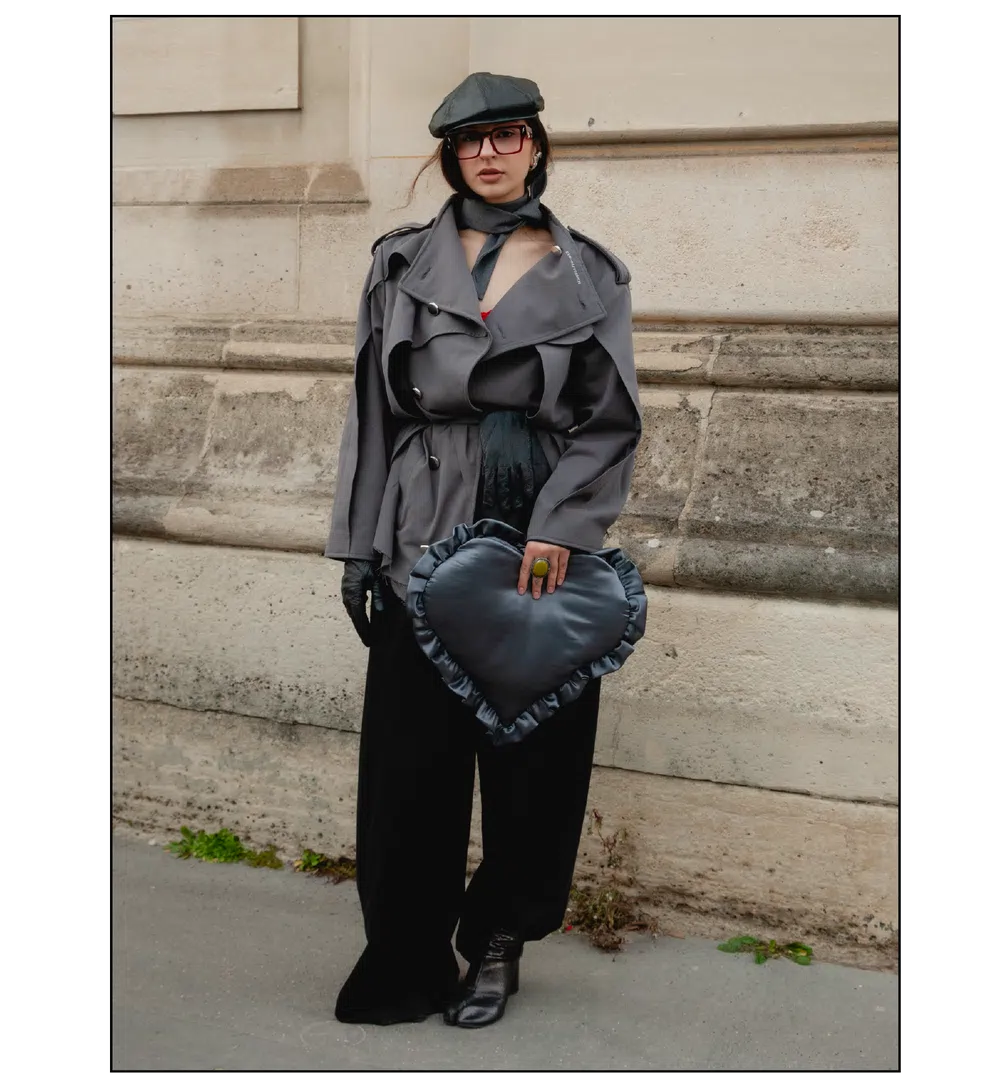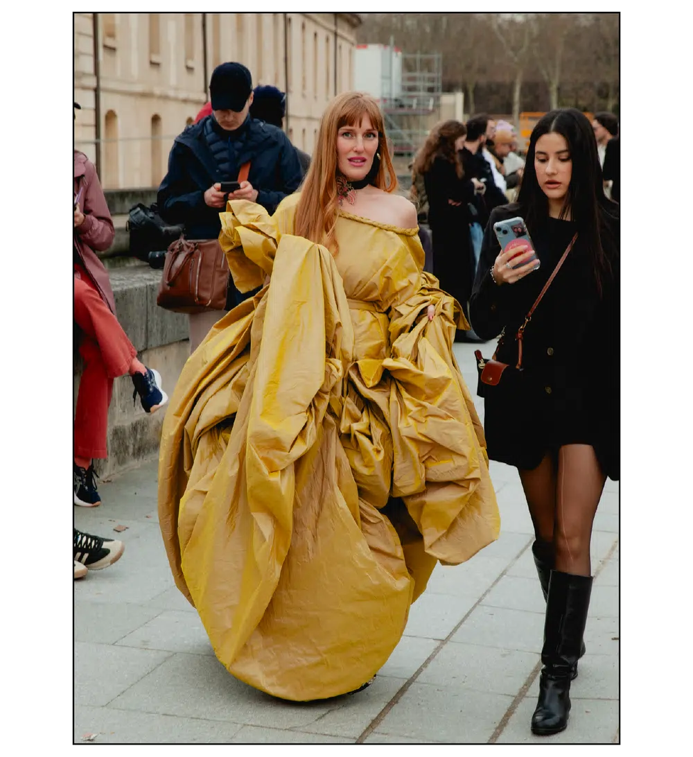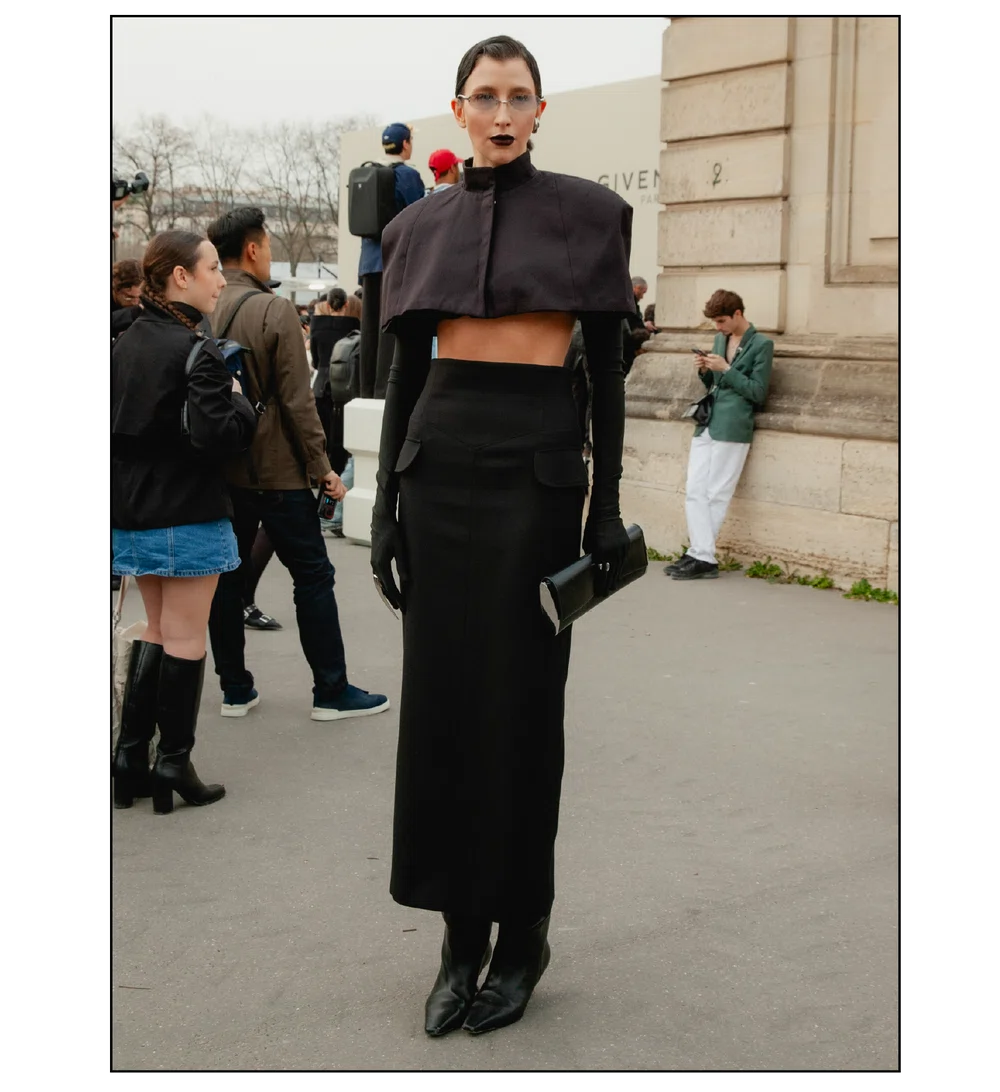「いかにして自己を取り戻すか」という問いを掲げ、現代女性の現実に寄り添う新たなワードローブを提示したサラ・バートン率いる<GIVENCHY(ジバンシィ)>。中でも視線を奪ったのは、身体の構造を意識した厳格なテーラリングと、柔らかな曲線を描く彫刻的なドレープが生み出す、美しい対比と静かな緊張感だ。この洗練されたクリエイションを目撃した来場者たちのスタイルもまた、揺るぎない自己とエレガンスを、それぞれの装いへと確かに投影していた。