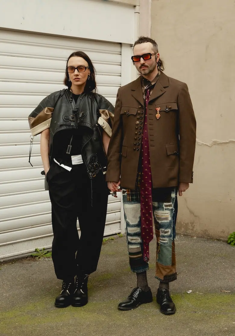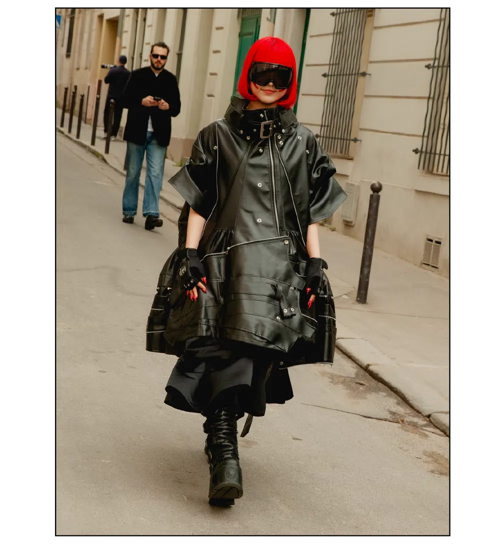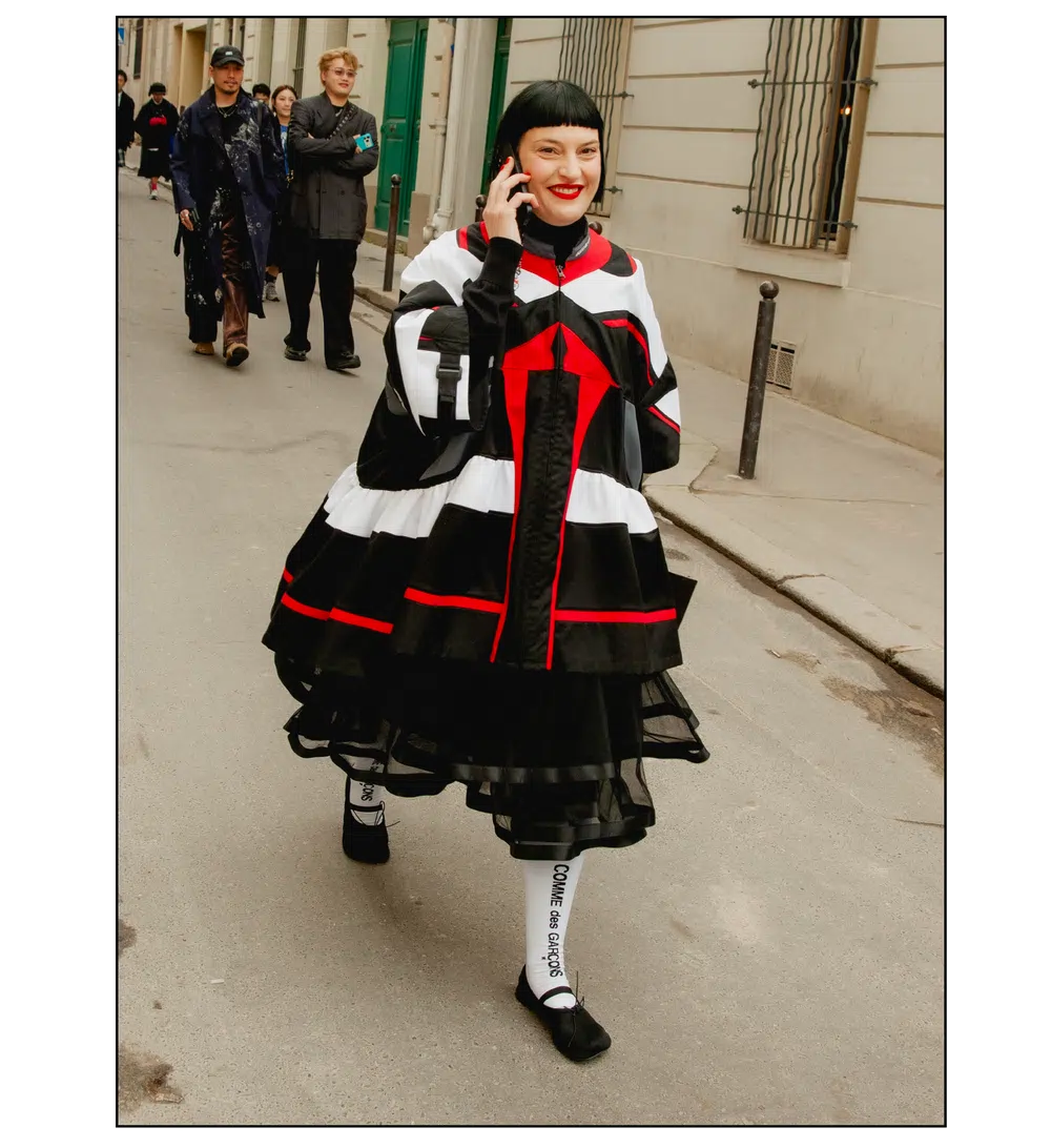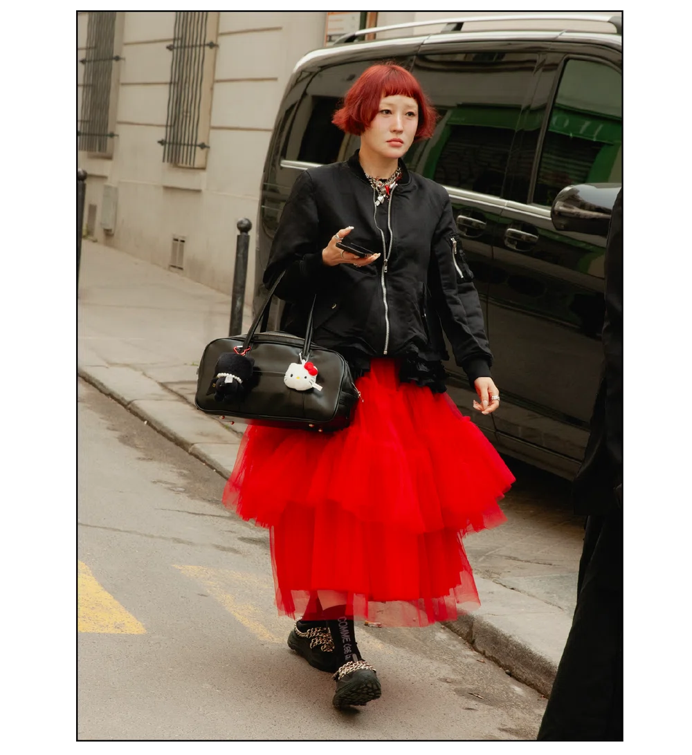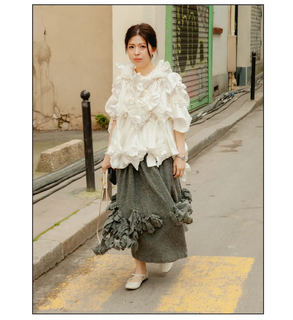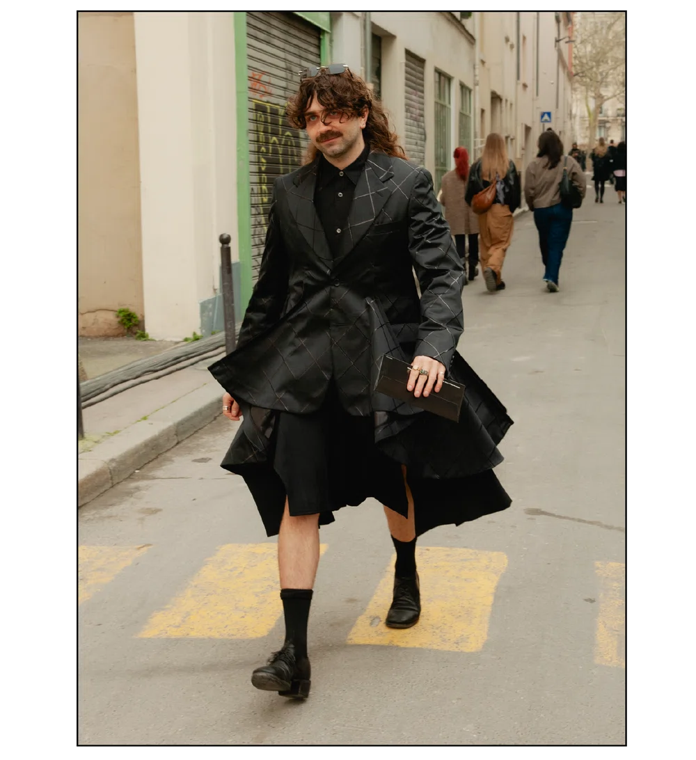 「The Art of Assemblage」という言葉を掲げ、異質な要素の結合から生まれる新たな造形美を提示した<JUNYA WATANABE(ジュンヤ ワタナベ)>。中でも視線を奪ったのは、情熱的なタンゴの調べとチェッカーボード柄のランウェイが交差する舞台で放たれた、日常着の文脈を解体・再構築する圧倒的なパッチワークと実験的なアプローチだ。この革新的なクリエイションを目撃した来場者たちのスタイルもまた、既成概念に縛られない自由な精神とアイデンティティを、それぞれの装いへと力強く投影していた。