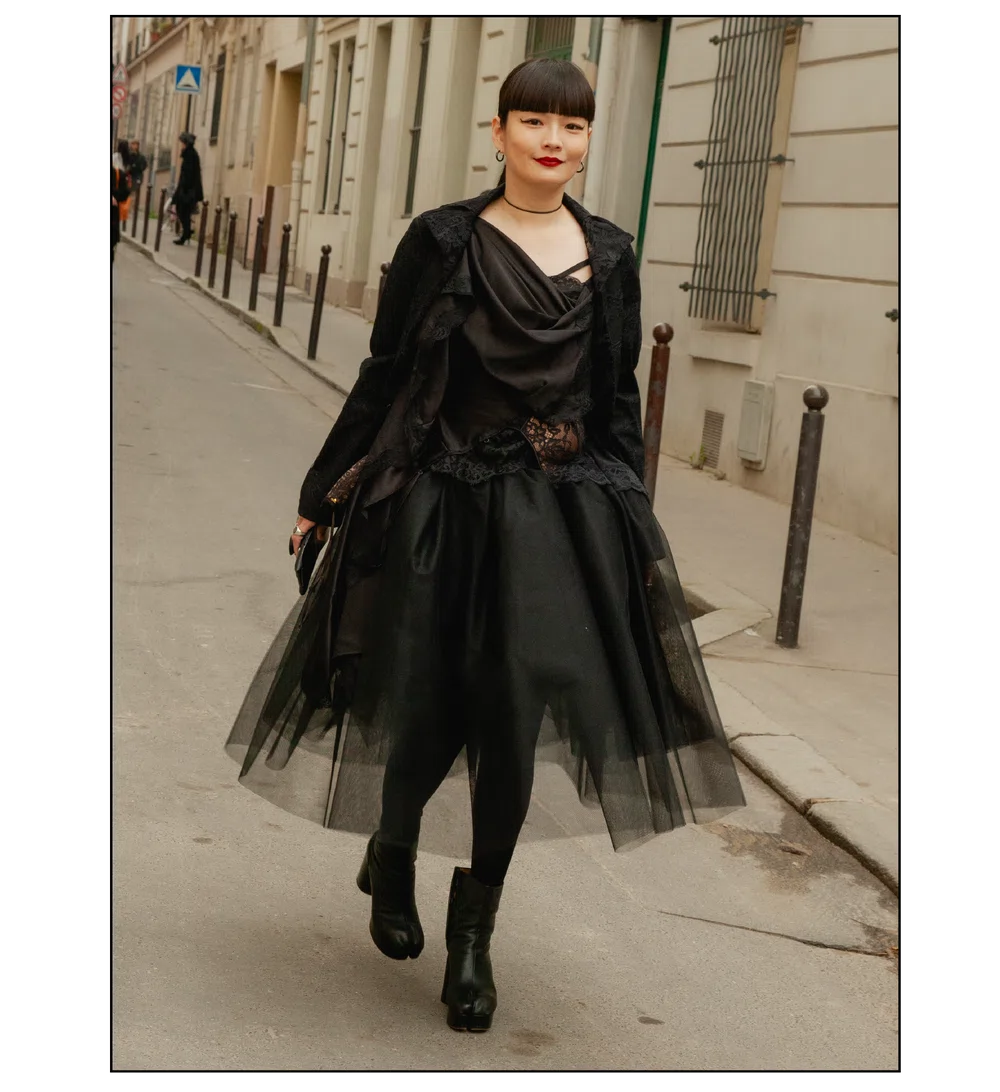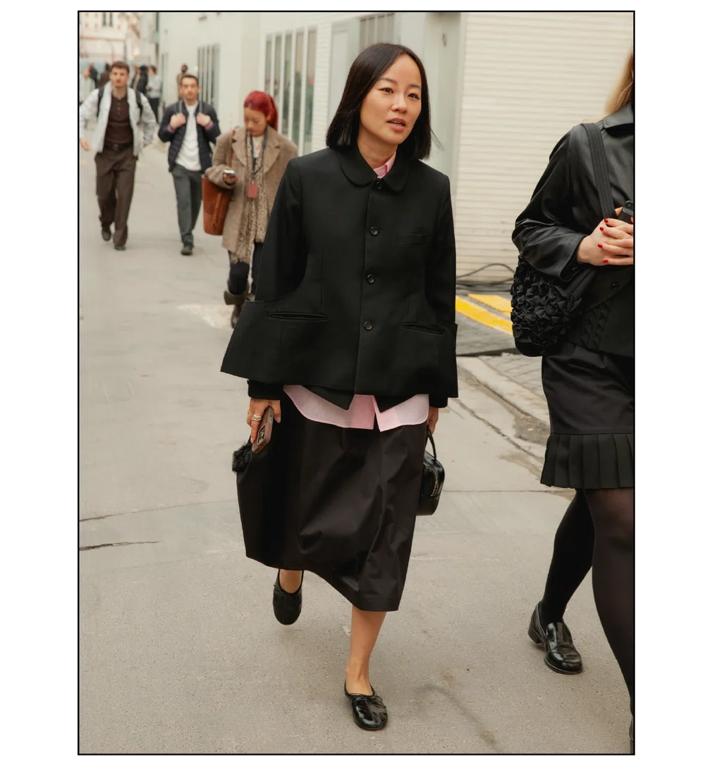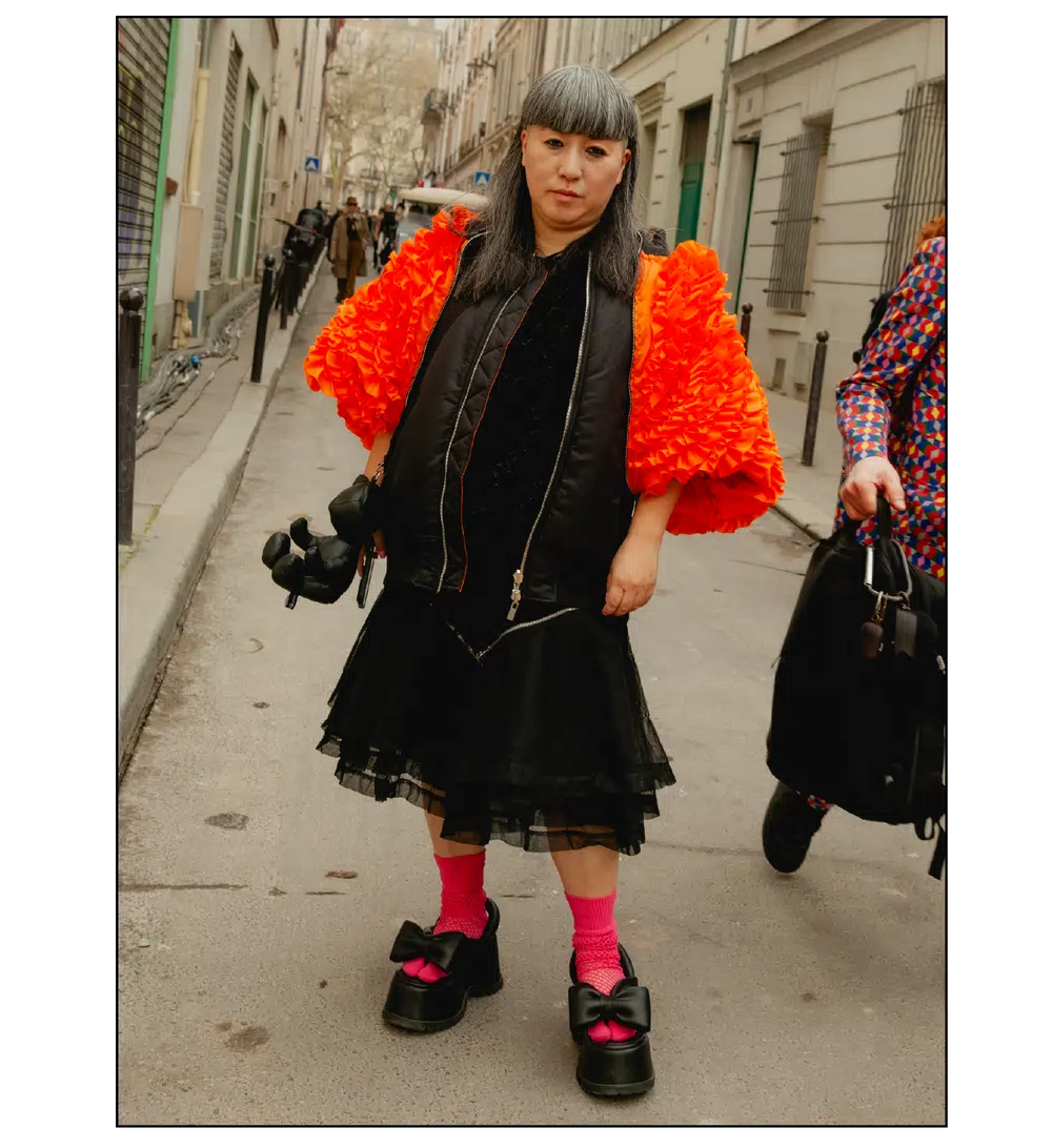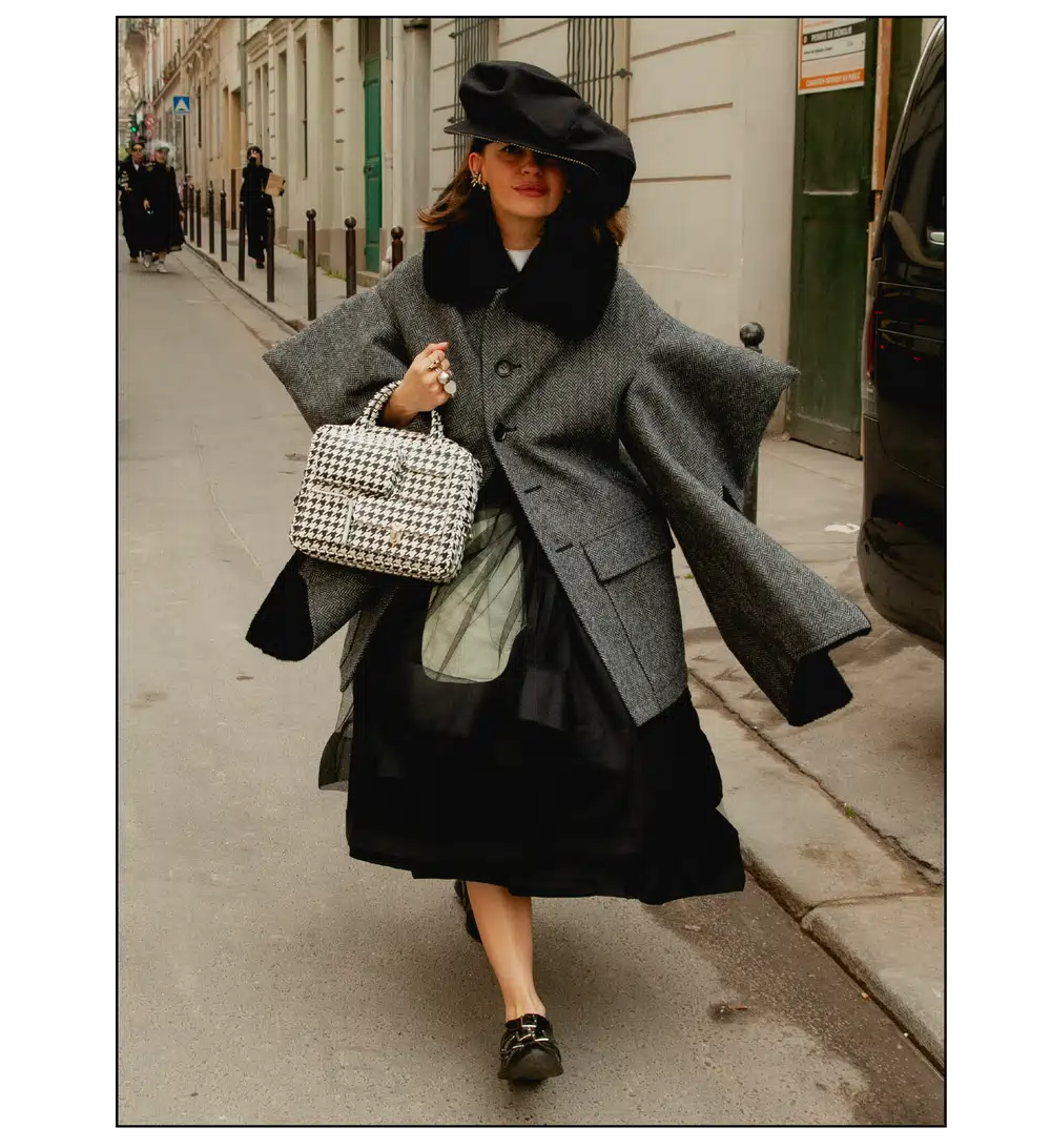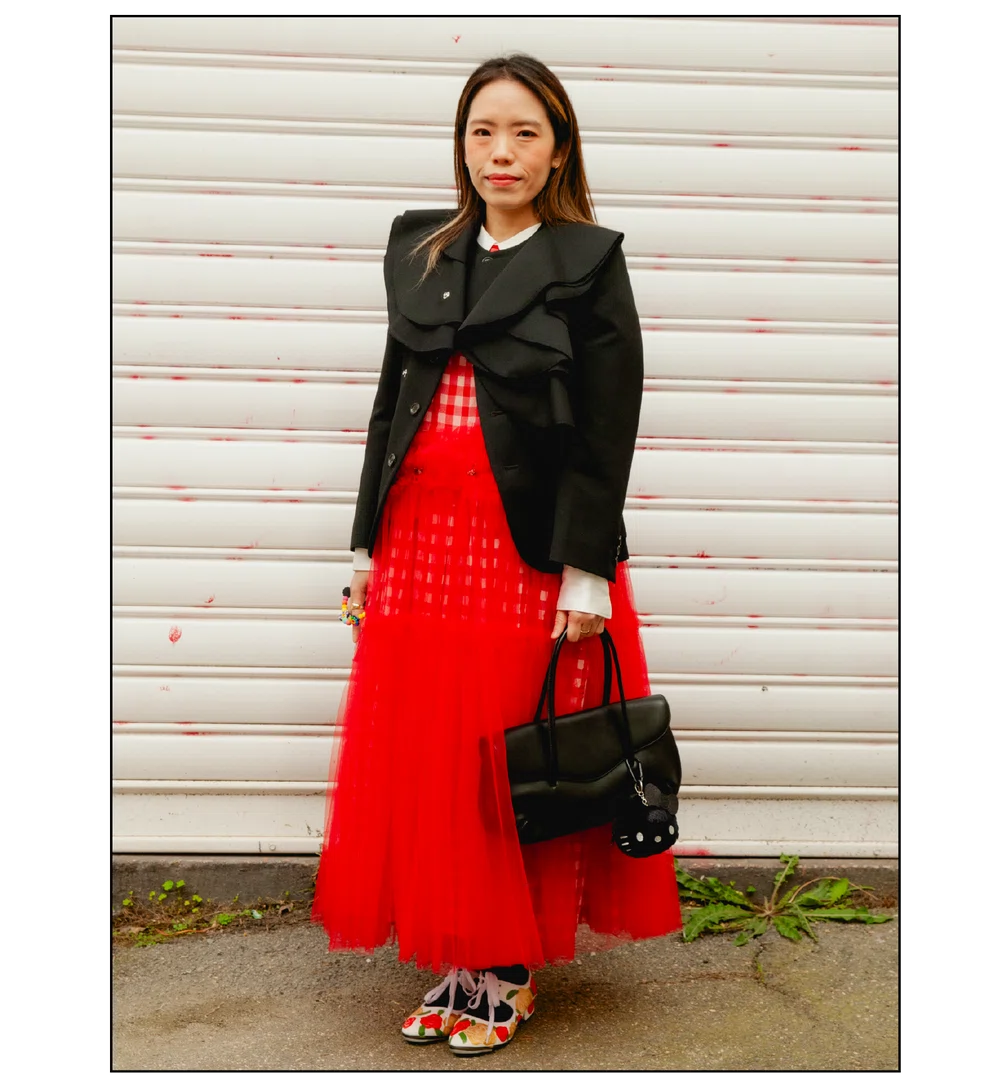 「The Art of Assemblage」という言葉を掲げ、異質な要素の結合から生まれる新たな造形美を提示した<JUNYA WATANABE(ジュンヤ ワタナベ)>。中でも視線を奪ったのは、情熱的なタンゴの調べとチェッカーボード柄のランウェイが交差する舞台で放たれた、日常着の文脈を解体・再構築する圧倒的なパッチワークと実験的なアプローチだ。この革新的なクリエイションを目撃した来場者たちのスタイルもまた、既成概念に縛られない自由な精神とアイデンティティを、それぞれの装いへと力強く投影していた。