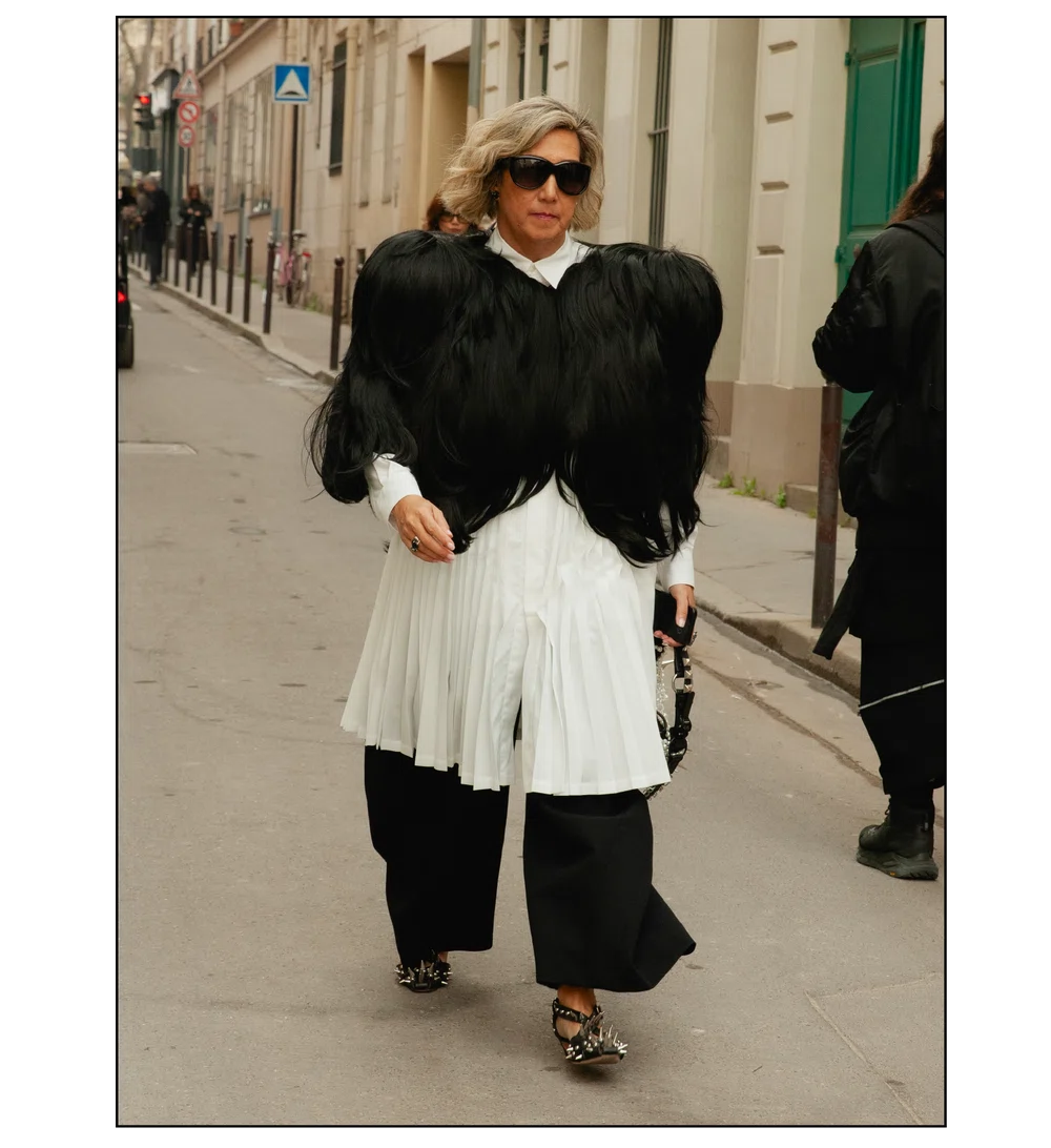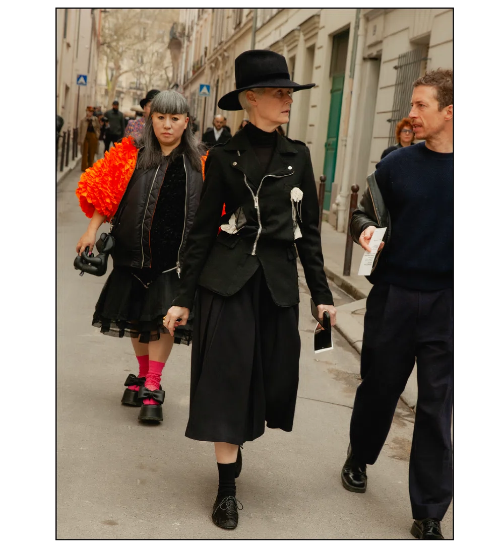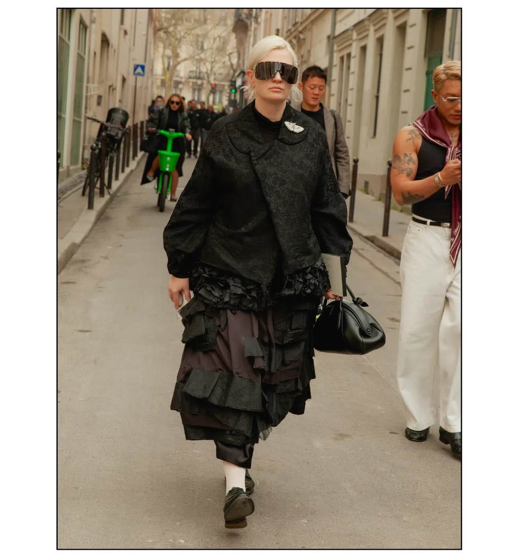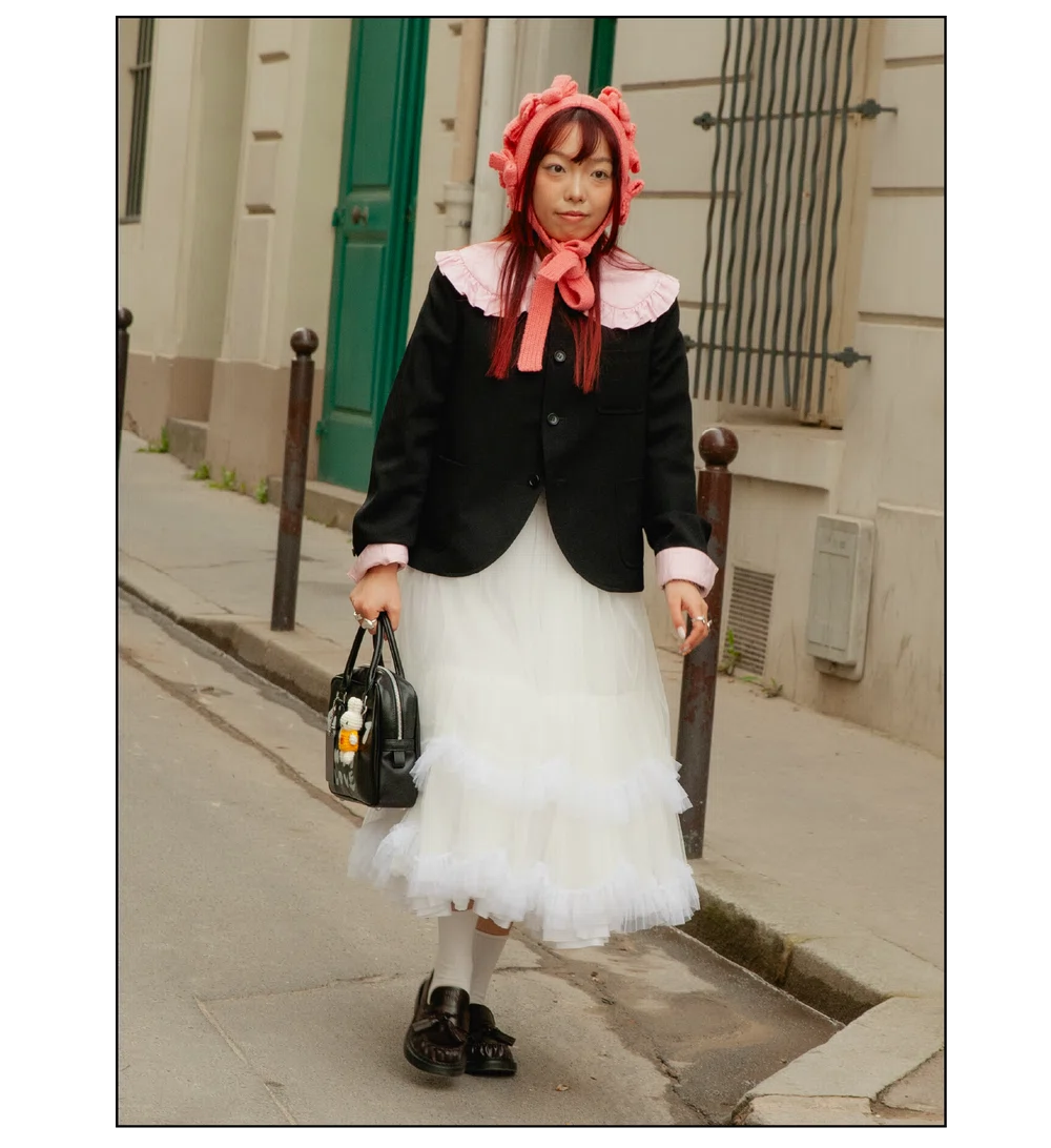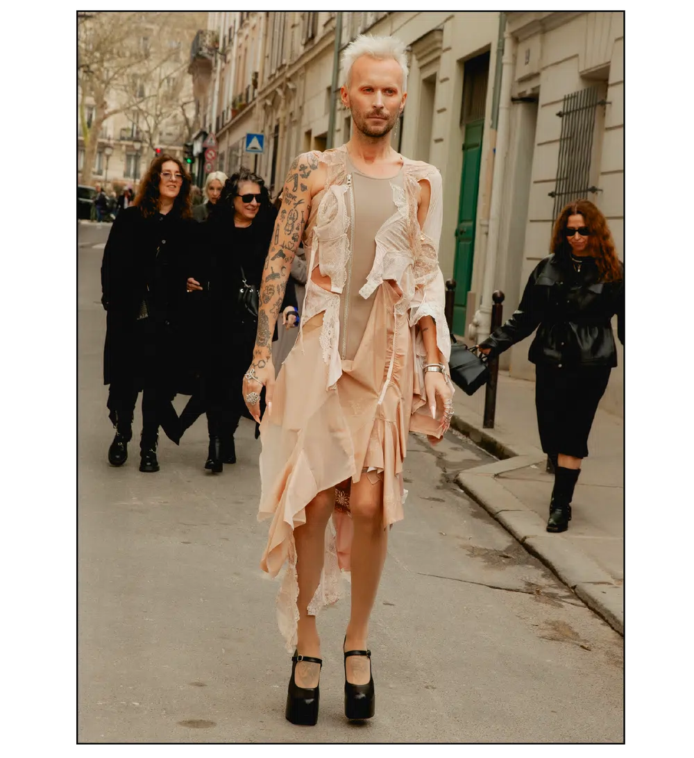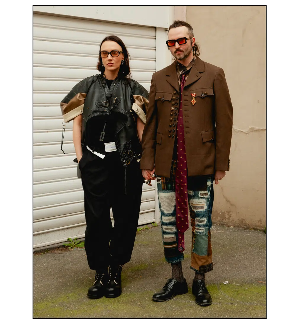 「The Art of Assemblage」という言葉を掲げ、異質な要素の結合から生まれる新たな造形美を提示した<JUNYA WATANABE(ジュンヤ ワタナベ)>。中でも視線を奪ったのは、情熱的なタンゴの調べとチェッカーボード柄のランウェイが交差する舞台で放たれた、日常着の文脈を解体・再構築する圧倒的なパッチワークと実験的なアプローチだ。この革新的なクリエイションを目撃した来場者たちのスタイルもまた、既成概念に縛られない自由な精神とアイデンティティを、それぞれの装いへと力強く投影していた。