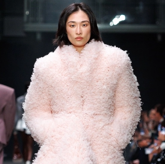 コーポレートグレーのセットアップ、ラフィアニットやフリンジを帯びたルック、アップサイクルデニム、ヴィーガンフェザー素材「FEVVERS」、汚染物質を中和する革新的素材「PURE TECH」などが並び、素材が語る倫理性がシルエットに呼吸を与えた。