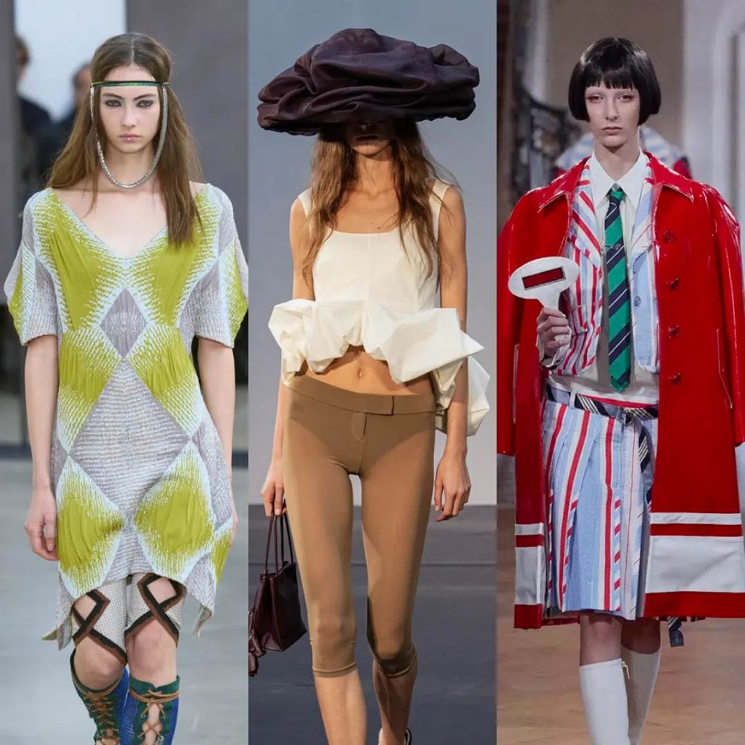 ソーラーパネルを思わせる比率でリサイズされたチェックのミニスカート、水着を組み込んだスリムドレス、スカートとショーツが一体化したピース、ローウエストのルック、植物由来ビニールのアイテムなどが現れた。