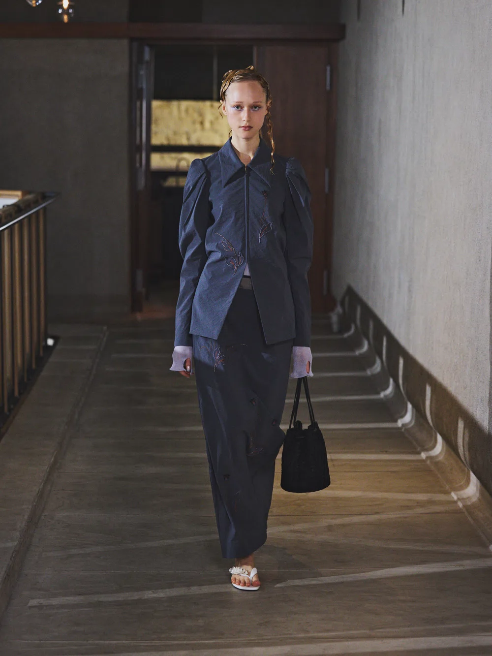 レースやシルク、刺繍といった軽やかなテキスタイルと、デニムや解体的テーラリング、変形ジャケット、マルチウェイドレス、手彫り木製フラワーのアクセサリーが交差し、未処理の縫い目や端がそのまま露わにされた。