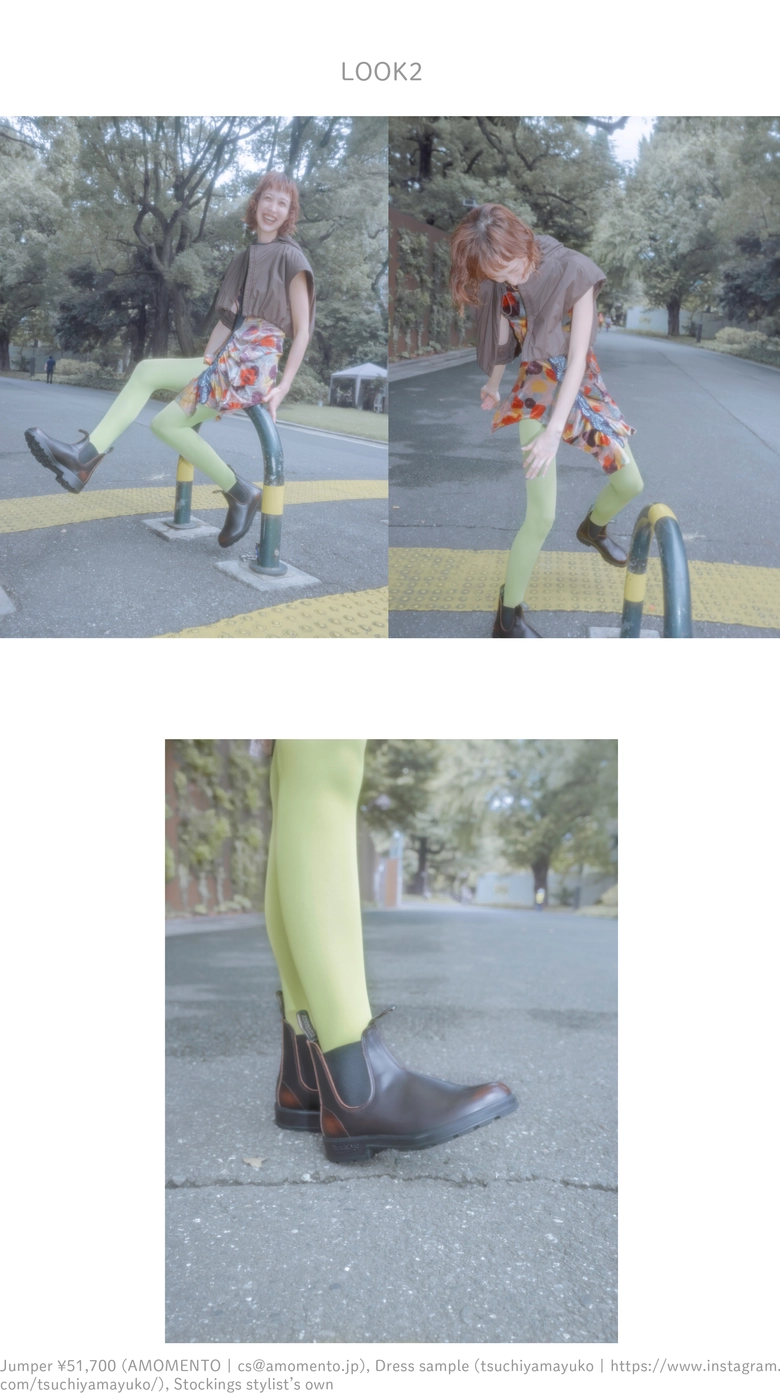 クラシカルなブーツに鮮やかなタイツを合わせてフレッシュに昇華。ドレープ感のあるワンピースは動く度しなやかに揺れて、秋への期待を加速させる。ピュアな印象を残しながらも、可憐でレディーに着こなすのが気分。