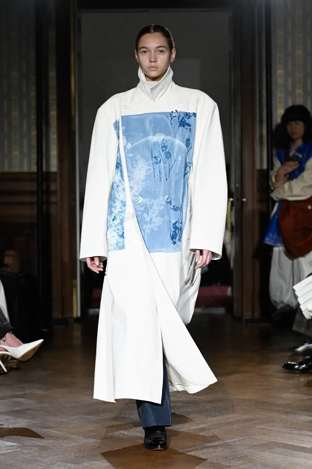 <TANAKA>が、2026年秋冬コレクション「Blue Print」を発表した。サイアノタイプで青写真をプリントしたデニムのルックを起点に、まだ言葉にならない思考や感覚の輪郭を一度外に現す手がかりとしての「青写真」を掲げ、日々手に残る確かな感覚の積み重ねをコレクションの軸に据えた。今季はあらためてデニムスタイルを中心に据え、向き合うたびに新しい表情を見せる素材としてのデニム、その近さの中にふと立ち上がる異なる気配、その尽きない可能性を探求している。ニューヨークと東京を拠点に、さまざまな場所や人との関わりを重ねてきた時間の先で、ブランド自身の歩みを少しずつ外へ広げながら、それぞれのなかにある青写真のそばに自然に寄り添う存在であろうとする姿勢が示された。