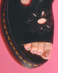 オプティカルアートを落とし込んだ、両ブランドの美学が感じられるデザイン。ぽってりとした透け感のあるソールと、涼しげなクリアネイルでみずみずしく。アッパーまで透けるデザインだから、夏を謳歌した証の焼けた肌を思う存分に見せつけて。