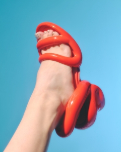 コブラからインスピレーションを得た造形的でボリューミーなシルエットと、ブランドのシグネチャーカラーのレッドが目を引く一足。ヌーディーなカラーにスタッズを敷き詰めたネイルを合わせて、とことん攻める夏。