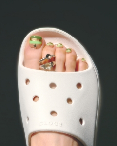 なにかと便利なスライドサンダルはカジュアルな印象になりがち。ゴールドを取り入れたボーダーのミリタリーネイルでスパイシーさをプラス。それでも物足りないなら、ジビッツ™ チャームでファビュラスに足元を飾って。