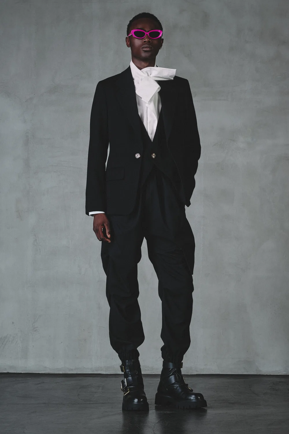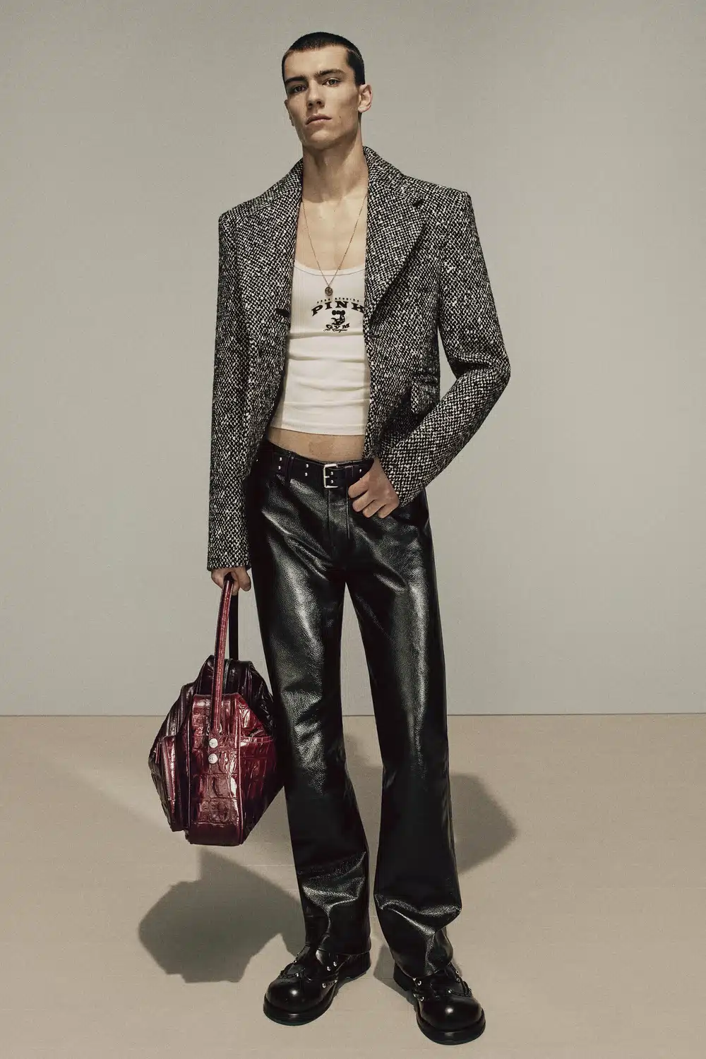 今季のランウェイでは、テーラードジャケットにスパイスを効かせた着こなしが数多く登場。体にフィットする小さめのTシャツやタンクトップをインナーに仕込み、ミドルカットのブーツにパンツをタックインするだけで、エッジの効いたマスキュリンが完成する。