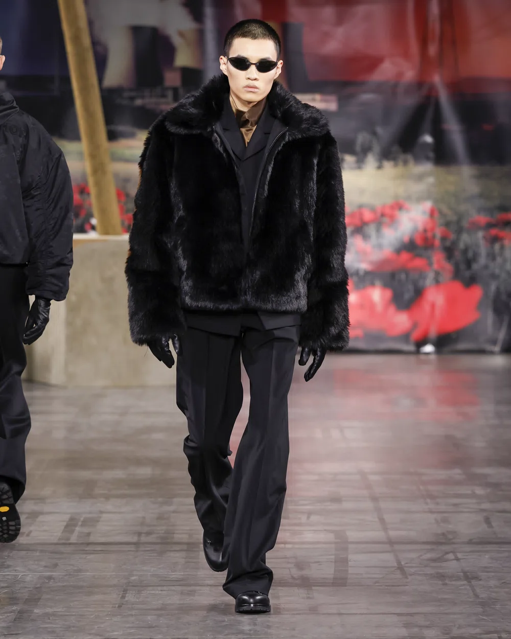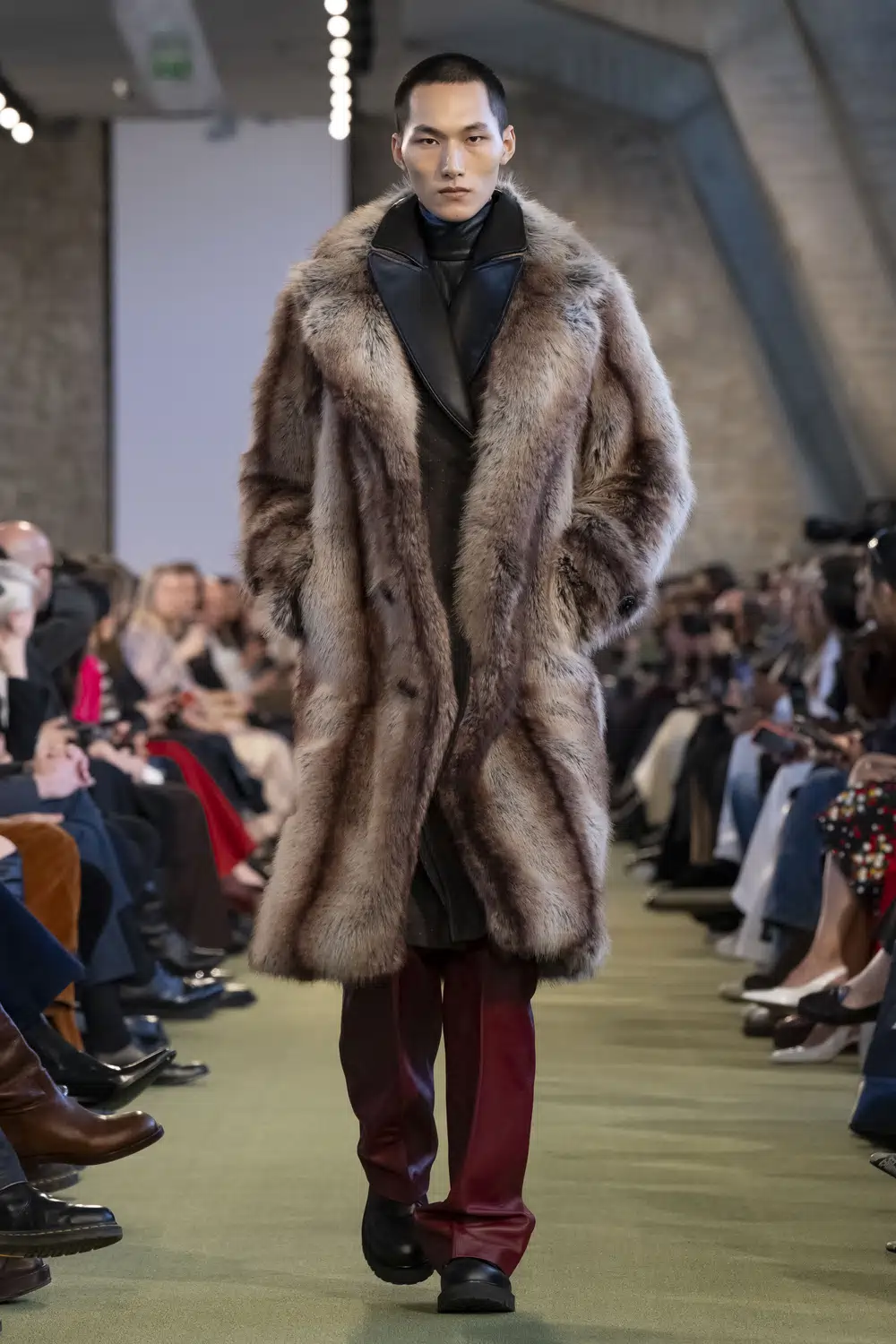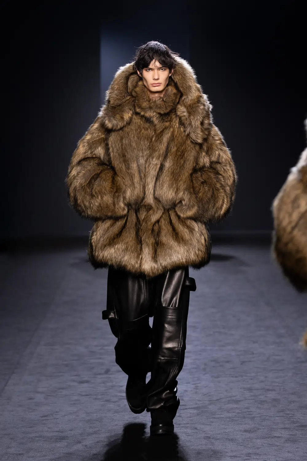 今季のコレクションで目を惹いたのは、ボリュームあるファーアウターがつくる圧倒的な存在感。リュクスな素材がもつ光沢と質感は、マスキュリンな強さにグラマラスな艶を与えてくれる。